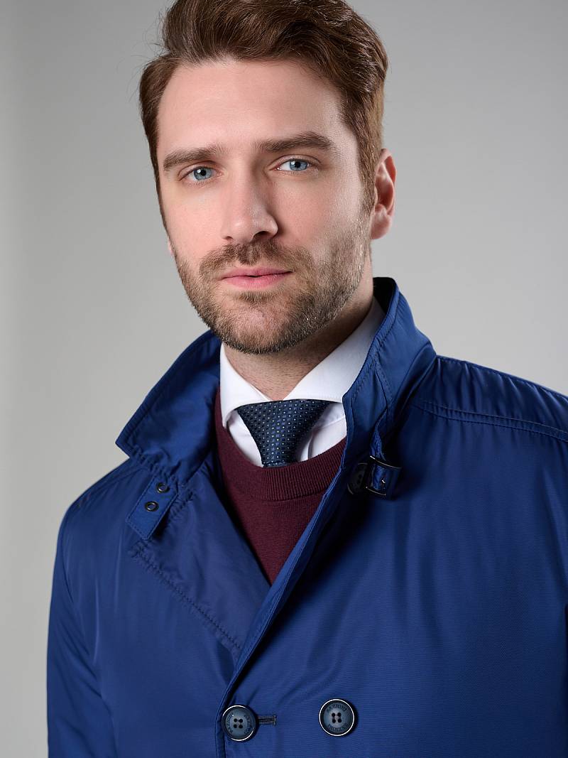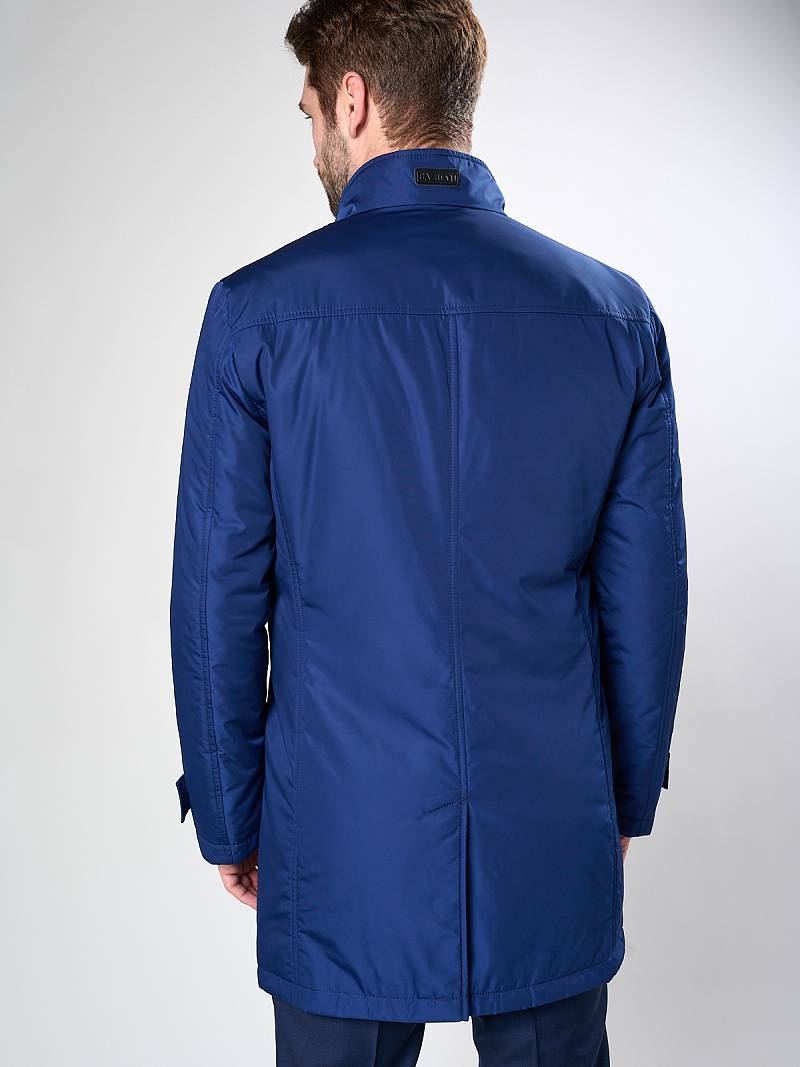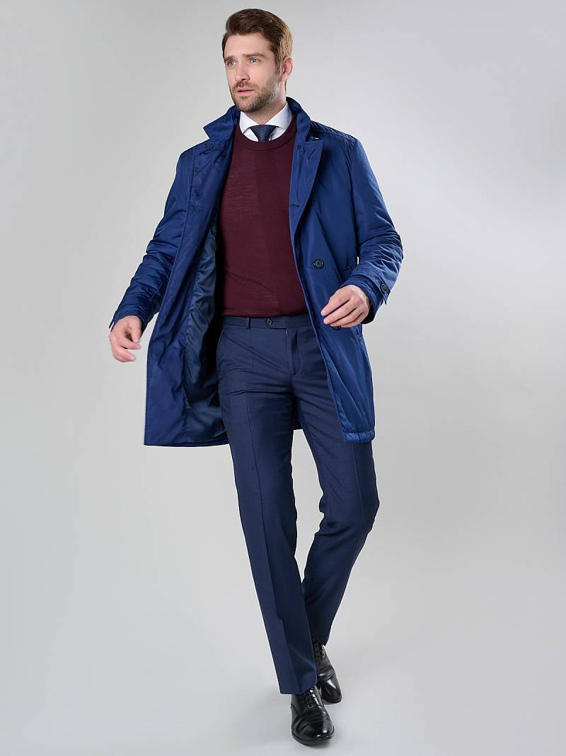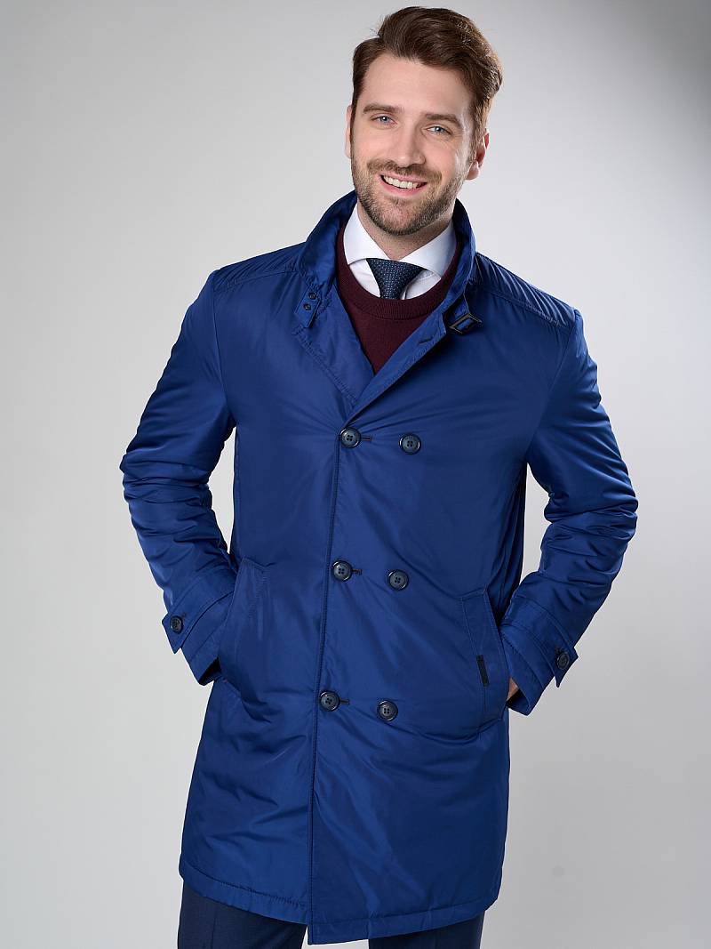 Плащ мужской утепленный, двубортный, с застежкой на пуговицы. Воротник стойка. Полочка и спинка с отрезными кокетками. Боковые наклонные карманы - прорезные с листочкой. Рукав втачной двухшовный, в нижней части хлястик на пуговице. Спинка с центральным швом и шлицей. На подкладке два внутренних кармана на пуговицах. Длина спинки для роста 176 - 90см. Ткань верха: 100%полиэстер. Подкладка: 100%полиэстер. Утеплитель: термоплюс 40гр