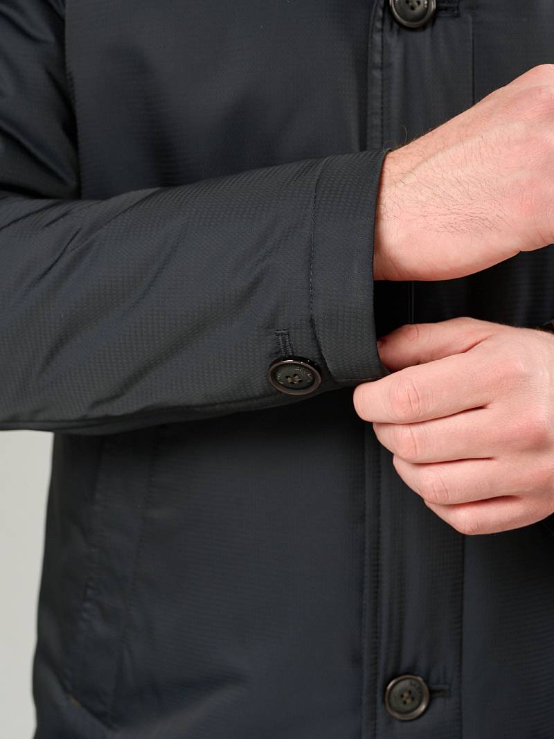 Плащ мужской утепленный с лацканами и манишкой из ткани с высокой степенью защиты от ветра и влаги, застежка на 3 пуговицы. Манишка отстегивающаяся на молниях, простегана горизонтальной стежкой, препятствует попаданию ветра и защищает от холода. На полочках - прорезные карманы с листочкой на магнитах. Спинка с центральным швом и шлицей. Рукав втачной двухшовный, в нижней части рукава - петля с пуговицей. На подкладке один внутренний карман на молнию. Подкладка простегана горизонтальной стежкой. Длина спинки для роста 176 - 90см. Ткань верха: 100%полиэстер. Подкладка: 100%полиэстер. Утеплитель: термоплюс 120гр/100гр.