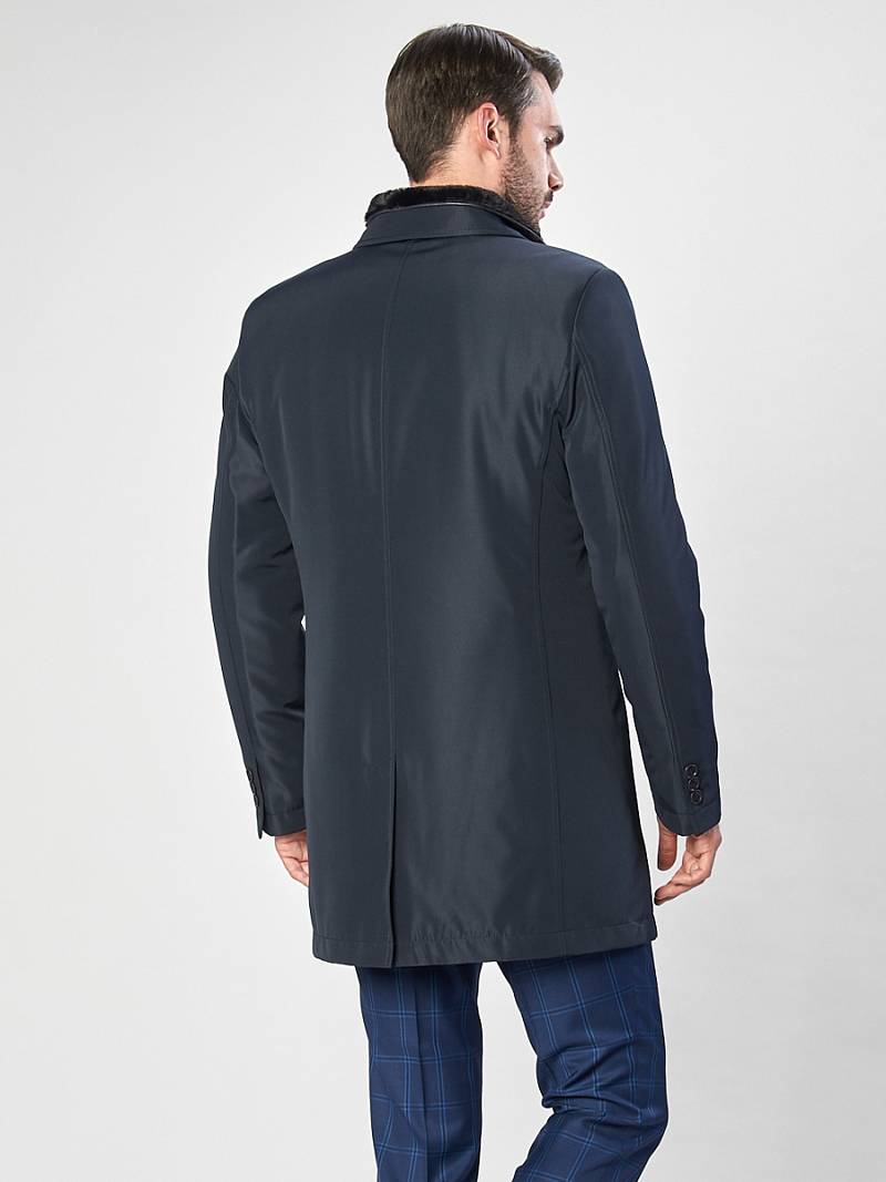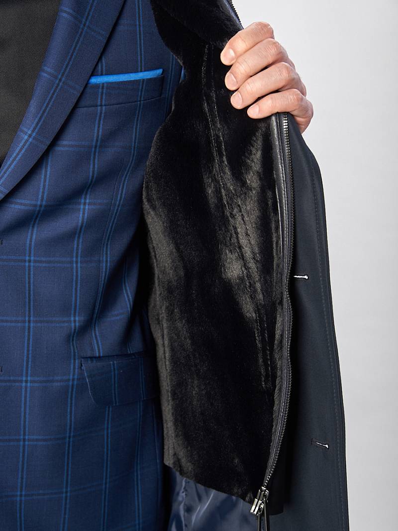 Slim fit, Плащ мужской утепленный, съемный жилет - дубленка. Застежка на 3 пуговицы. Воротник с лацканами. Боковые карманы- прорезные с листочкой. Спинка со шлицей. Длина по спинке для роста 176 - 90см. Ткань верха: 100% полиэстер. Подкладка: 100% полиэстер. Утеплитель: термоплюс 100г. и съемный жилет из дубленки.