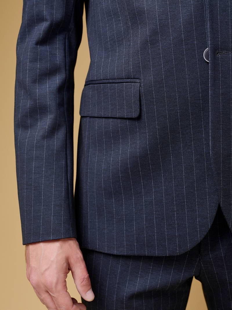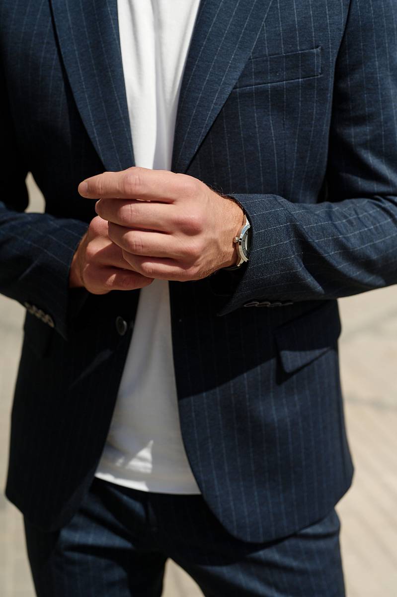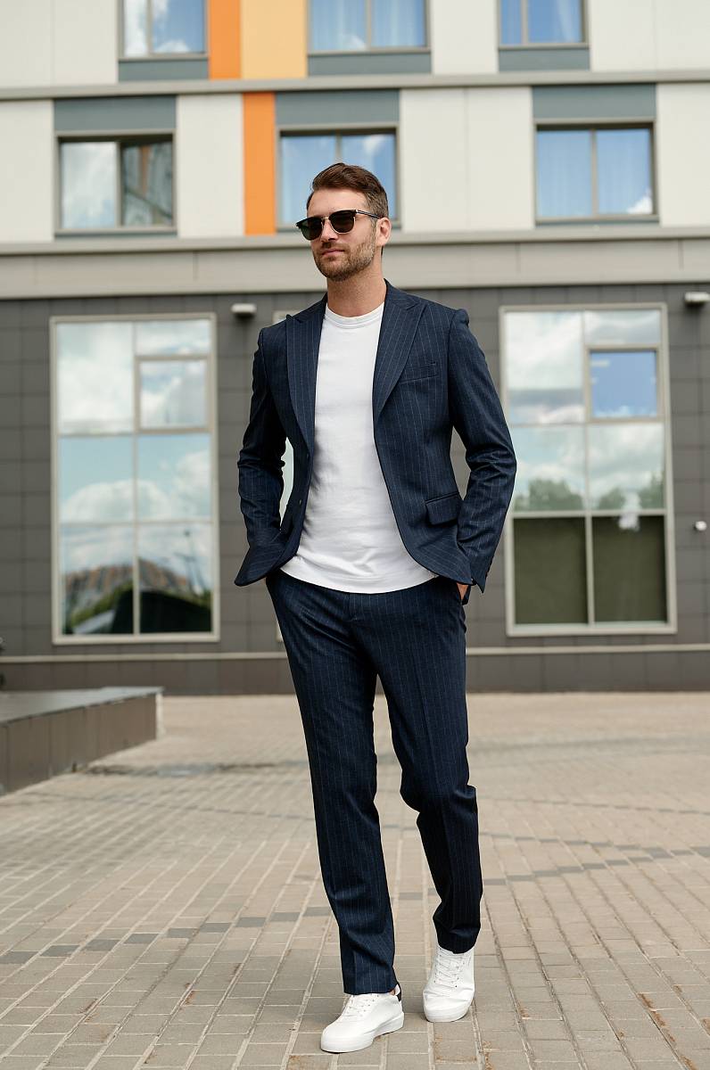 Классический костюм двойка Slim fit (ПРИЛЕГАЮЩИЙ СИЛУЭТ), рекомендуется брать на размер больше.Пиджак однобортный на две пуговицы с острым лацканом, с двумя боковыми карманами с клапанами и нагрудной листочкой. Рукава втачные, двухшовные со шлицей и четырьмя декоративными пуговицами. По спинке расположены две шлицы. Пиджак на подкладке, с двумя внутренними карманами. Брюки без защипов, с боковыми наклонными карманами и одним задним карманом «в рамку». Передние половинки на подкладке. Верхний срез брюк обработан поясом с корсажной лентой и шлевками под ремень. Застежка обработана на тесьму-молнию, с петлей-пуговицей на поясе и усилен металлическим крючком.