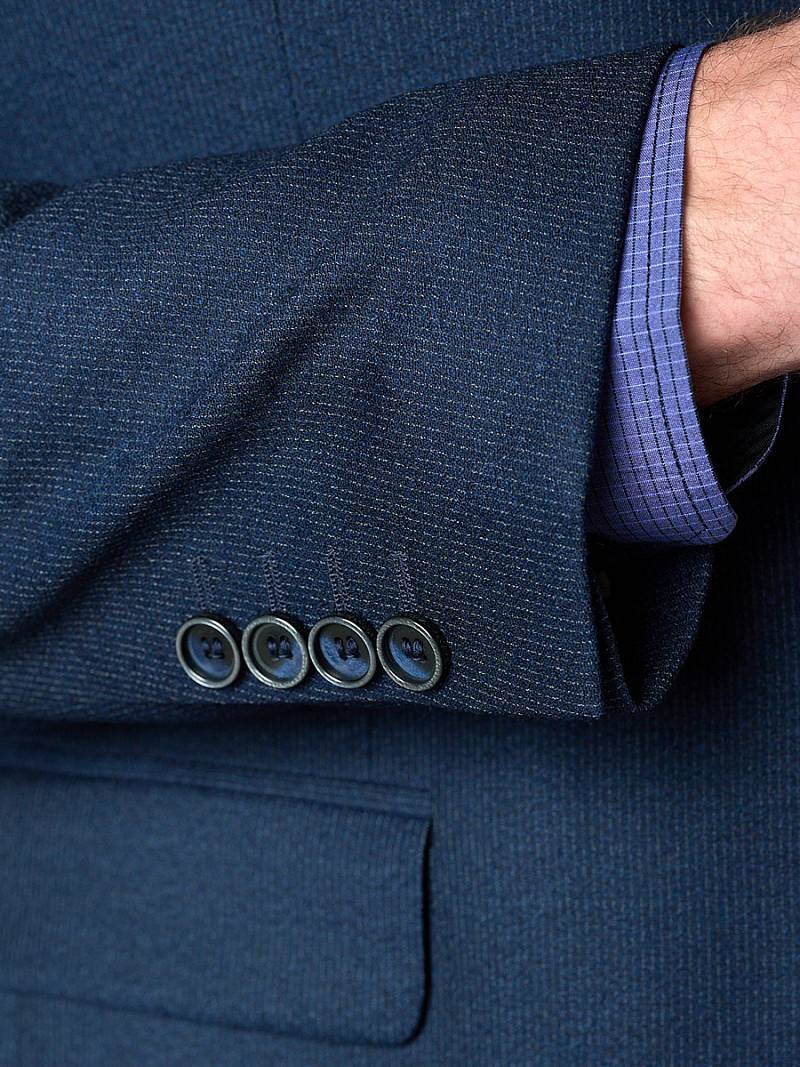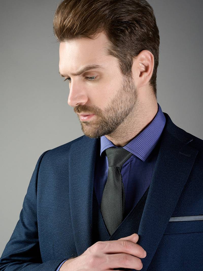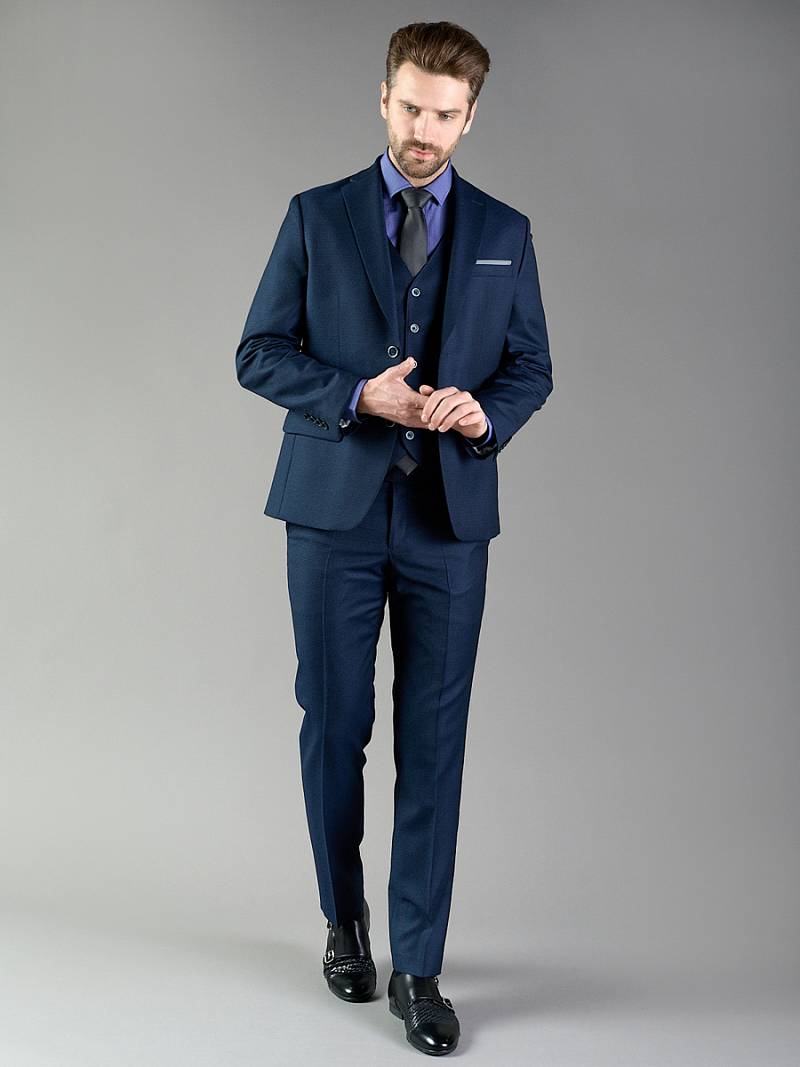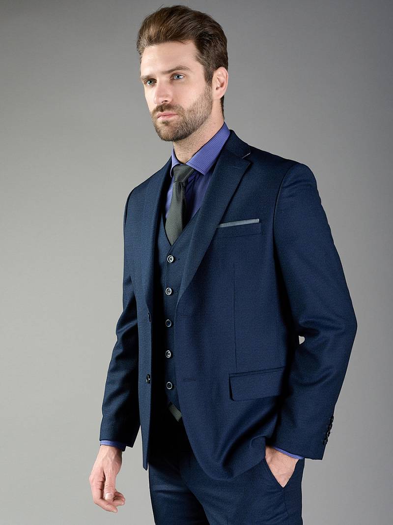 Классический костюм тройка Classic fit. Пиджак на две пуговицы, с боковыми и нагрудным карманами, по спинке две шлицы. Брюки без защипов с боковыми и одним задним карманом.