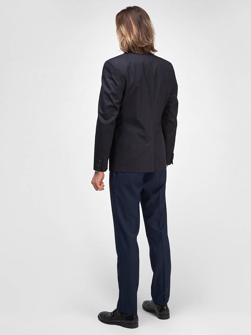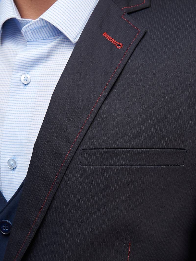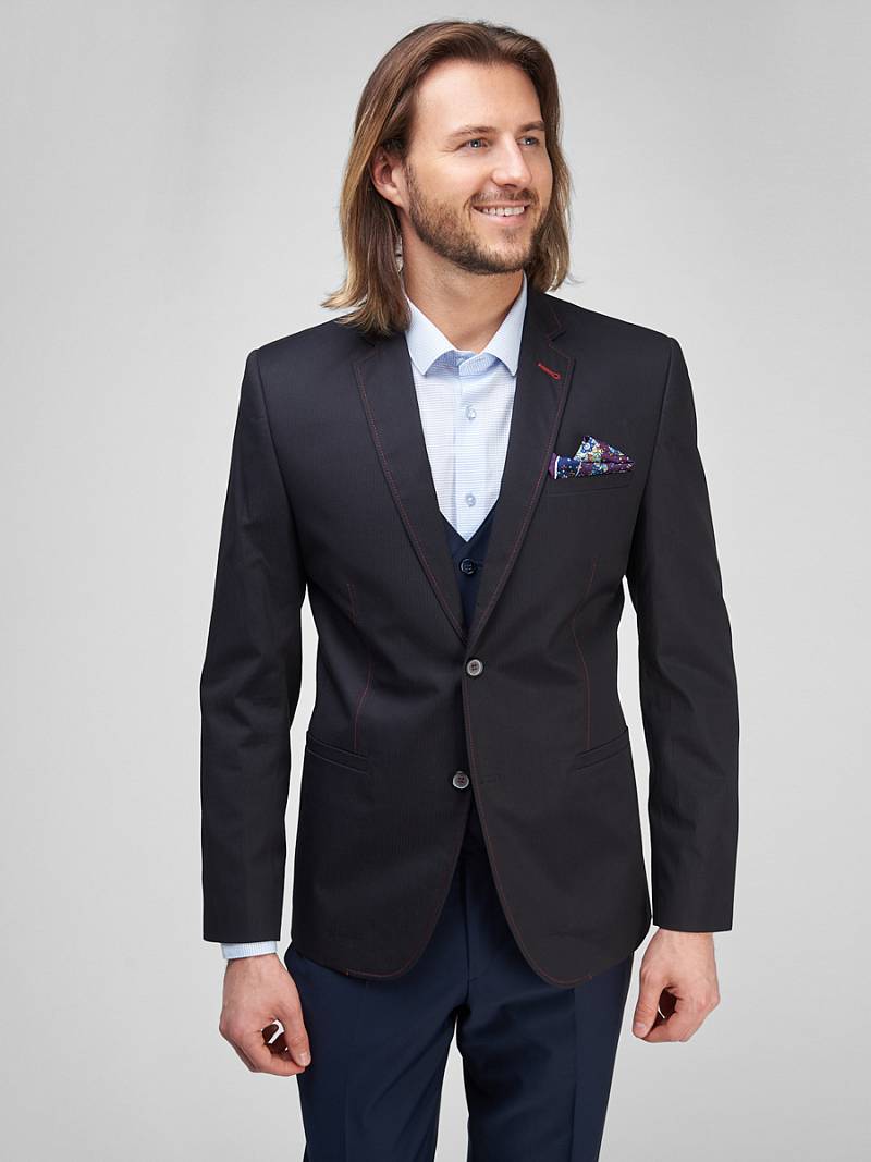 Slim fit, Классический мужской пиджак на две пуговицы, с боковыми и нагрудным карманами, по спинке одна шлица, отлелочная строчка нитками в контраст по воротнику, лацкану и борту.