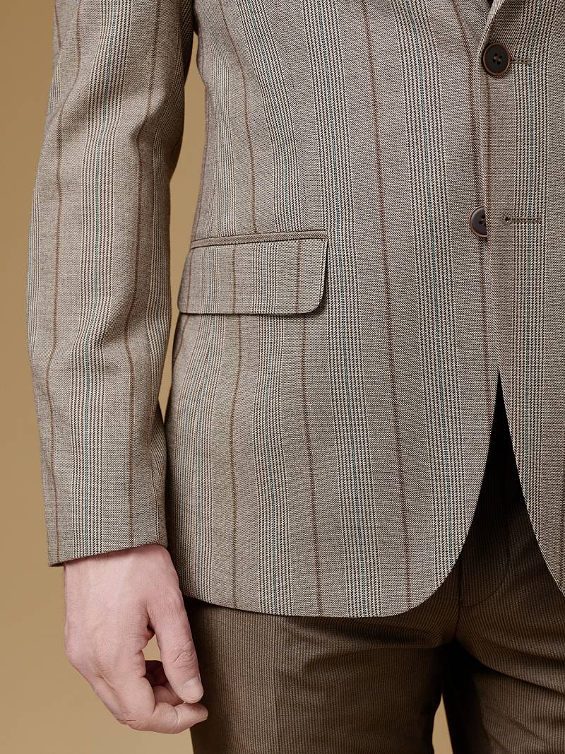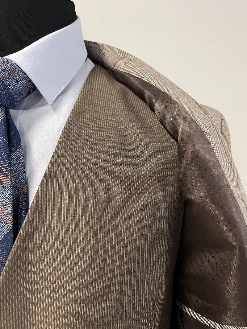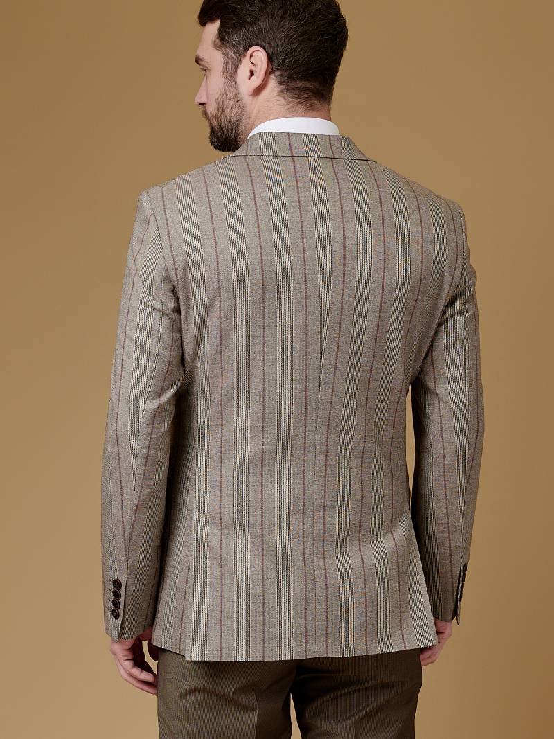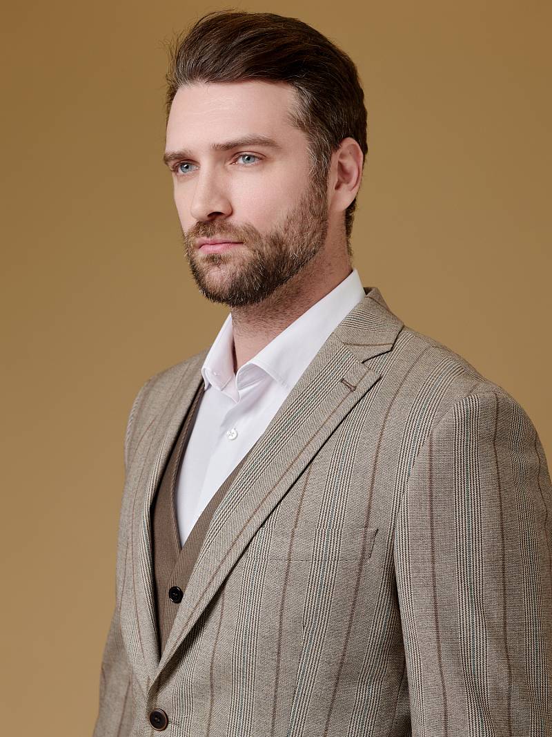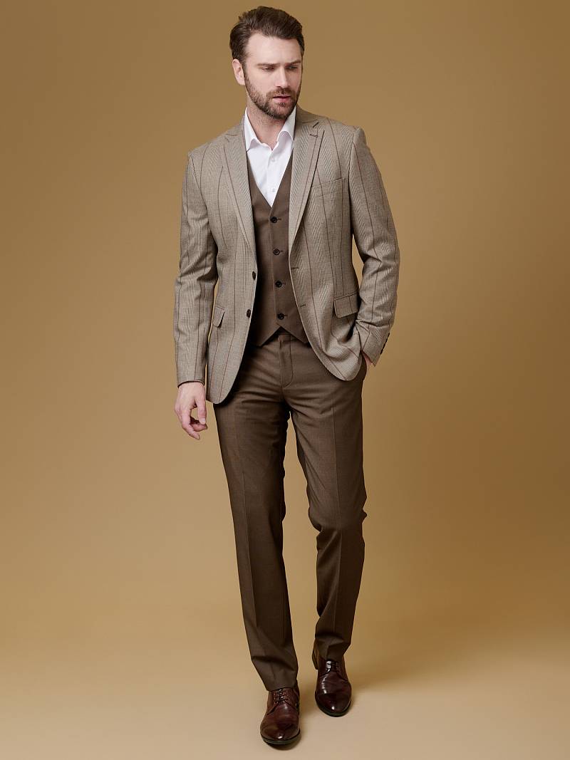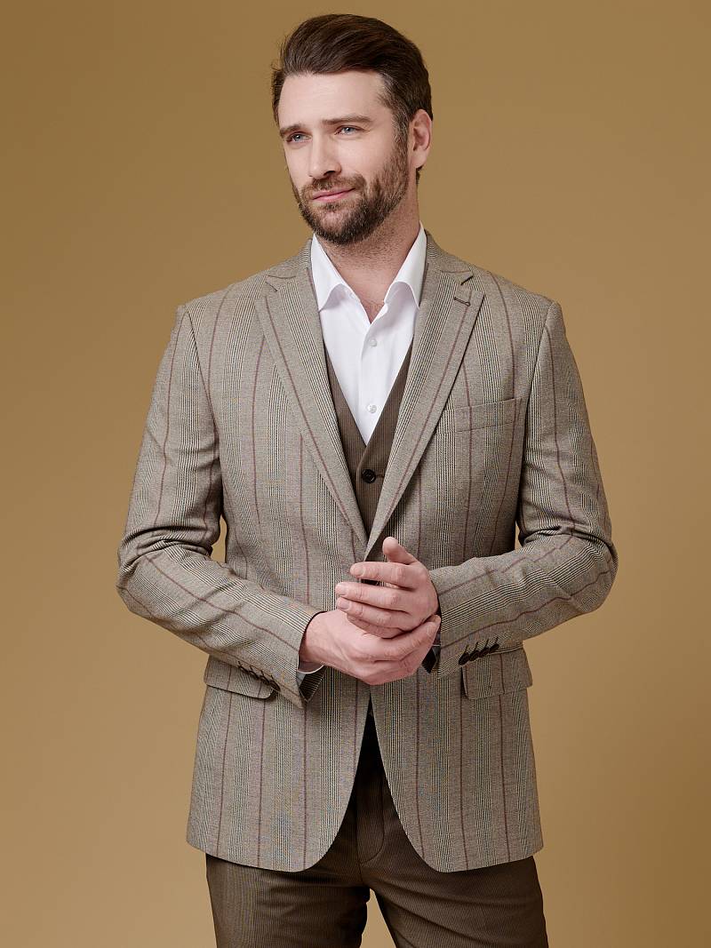 Slim fit (ПРИЛЕГАЮЩИЙ СИЛУЭТ), рекомендуется брать на размер больше. Пиджак однобортный на две пуговицы, с двумя боковыми карманами и нагрудной листочкой. Рукава втачные, двухшовные со шлицей и четырьмя декоративными пуговицами. По спинке расположены две шлицы. Пиджак на подкладке, с двумя внутренними карманами.