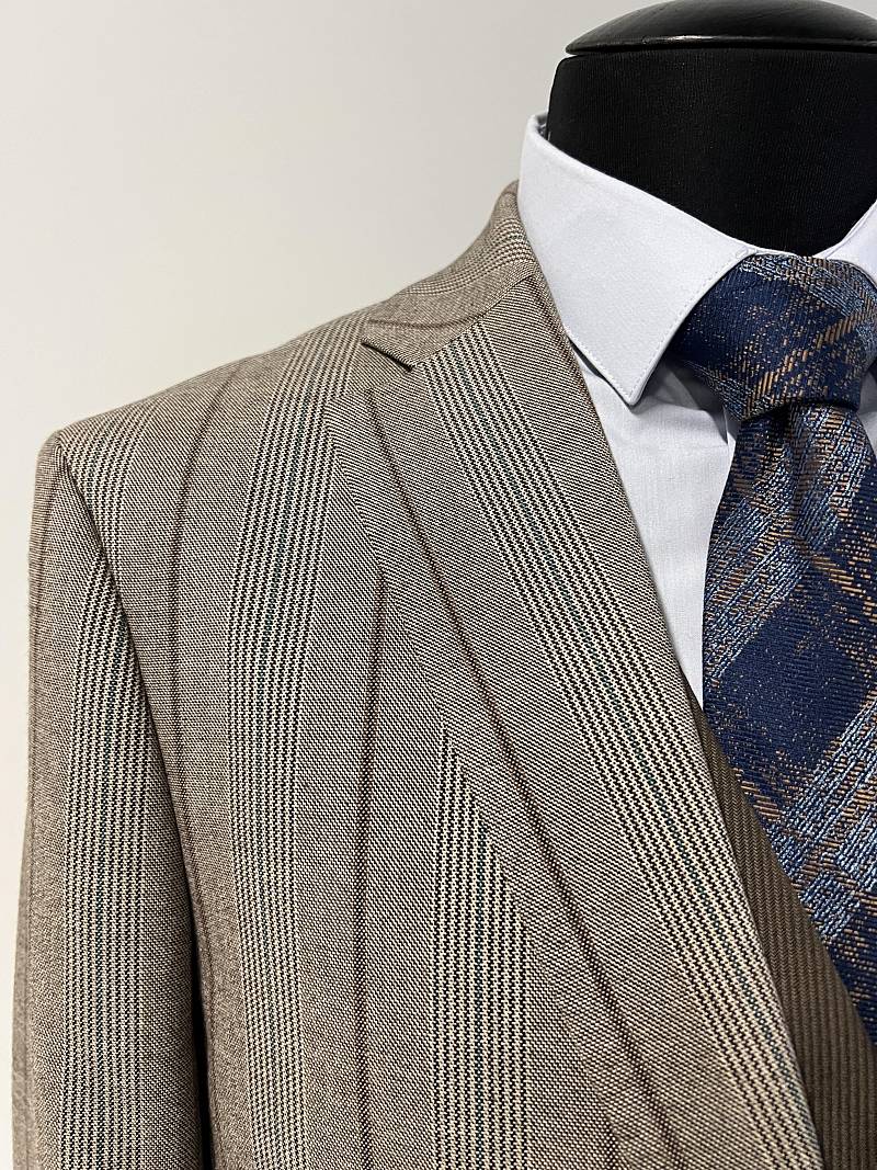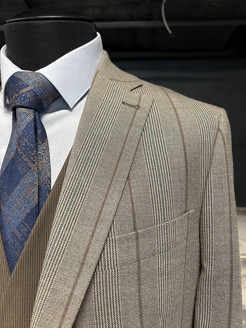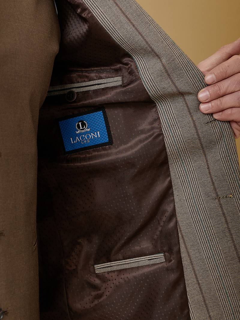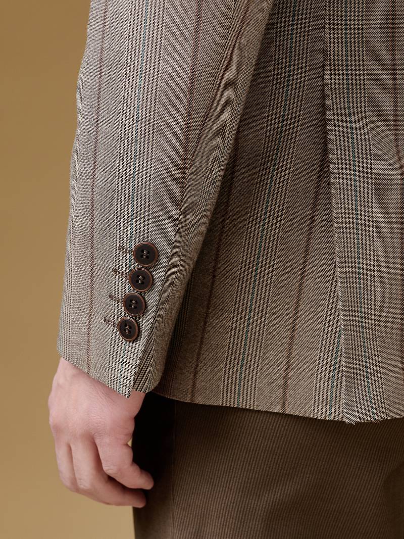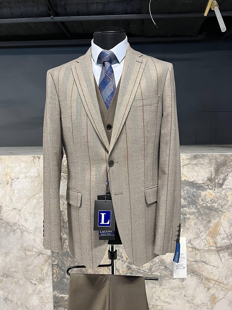 Slim fit (ПРИЛЕГАЮЩИЙ СИЛУЭТ), рекомендуется брать на размер больше. Пиджак однобортный на две пуговицы, с двумя боковыми карманами и нагрудной листочкой. Рукава втачные, двухшовные со шлицей и четырьмя декоративными пуговицами. По спинке расположены две шлицы. Пиджак на подкладке, с двумя внутренними карманами.