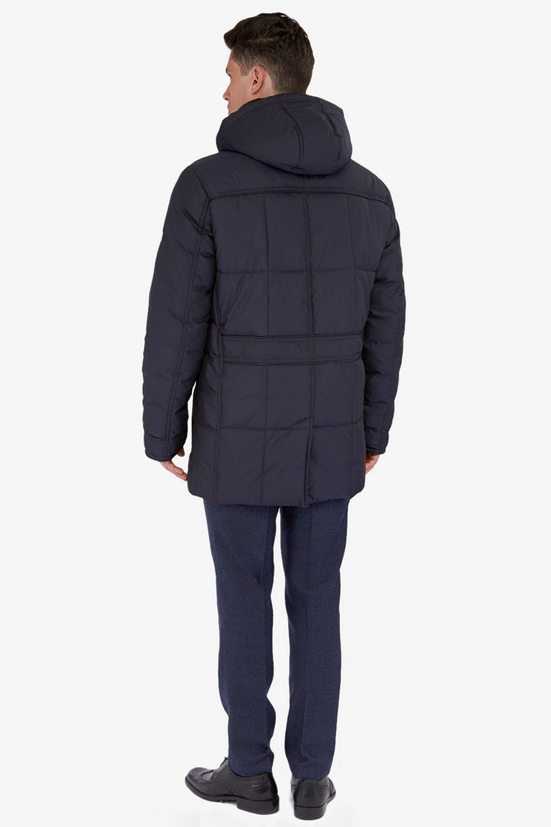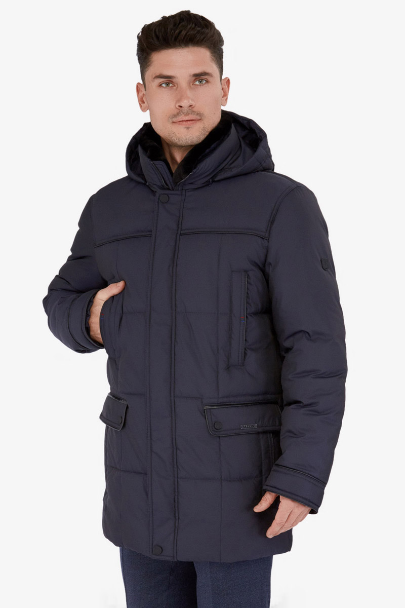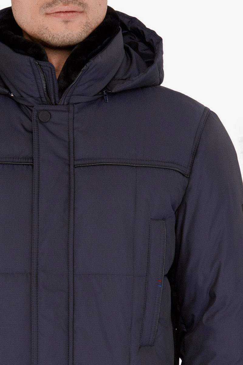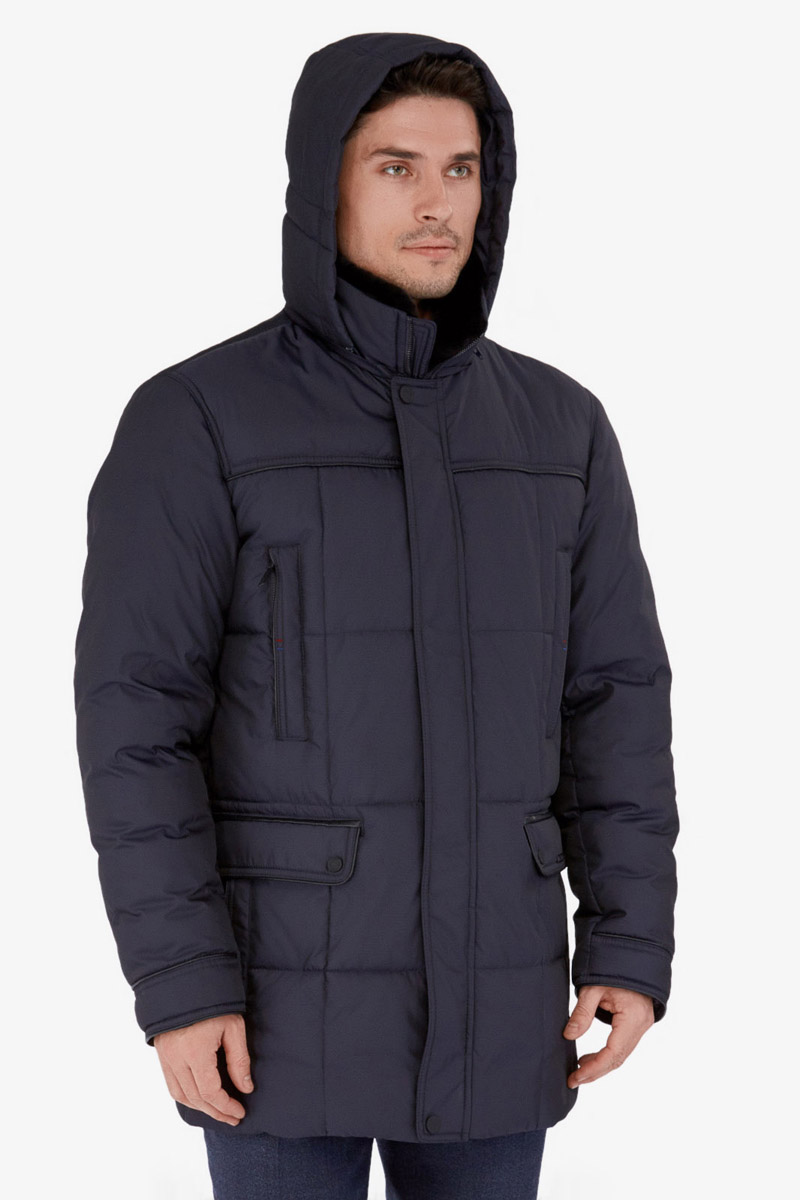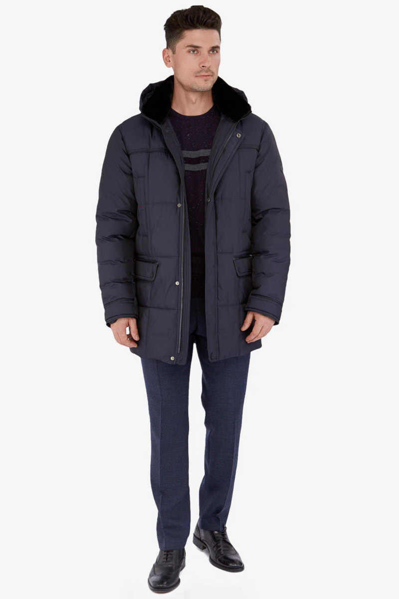 Куртка мужская утепленная с капюшоном из плащевой ткани, со съемным натуральным меховым воротником из мутона, воротник - стойка. с центральной застежкой на молнию и ветрозащитную планку на 4 кнопки. Простеганные полочки и спинка- с кокетками и бочками. На полочках - верхние карманы с листочками на молниях и два нижних боковых кармана: 1- с клапаном, 2-ой - с листочкой. Спинка -в нижней части срежнего шва спинки- шлица на 2-х кнопках. По талии спинки-притачная кулиса. Рукава втачные с локтевыми швами. По швам притачивания кокеток, краю листочек, клапанов, по низу рукавов, по кулисе на спинке - объемный отделочный кант. На подкладке - два внутренних кармана с листочками. Длина по спинке для размера 50/176 - 80см Ткань верха: 100% полиэстер. Подкладка: 100% полиэстер. Утеплитель: Био-пух 100% (250гр). Воротник-мех натуральный "мутон"