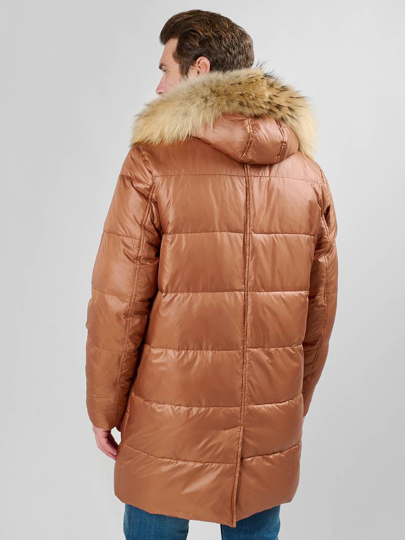 Куртка мужская (пуховик) с отстегивающимся капюшоном. На капюшоне - остегивающаяся меховая опушка, сзади, внизу две кнопки для регулировки глубины натяжения капюшона. Воротник стойка. Ветрозащитная планка на потайных кнопках. Застежка классическая молния YKK на два замка. Вместительные, утепленные велюром карманы, оборудованы клапанами на магнитах для защиты от дождя и снега. Рукава на удобных теплых манжетах. Инновационная, не продуваемая ткань верха с высокой степенью влаго и ветро защиты, с пропиткой WR и CIRE. Утеплитель антиалергенный биопух 220 гр / 200гр. не теряет своих свойств после химчистки и стирки . Длина по спинке для размера 50/176 - 95см. Ткань верха: 100% полиэстер. Подкладка: 100% полиэстер. Опушка: мех натуральный-ФИНСКИЙ АУКЦИОННЫЙ ЕНОТ.