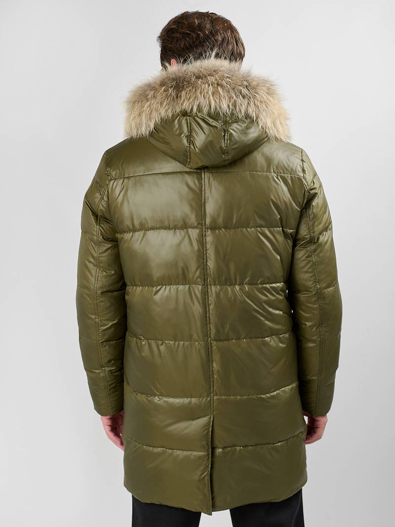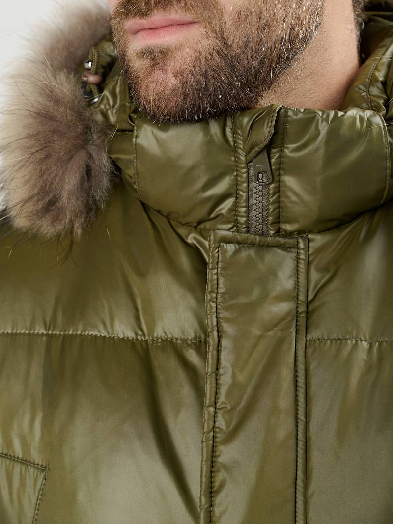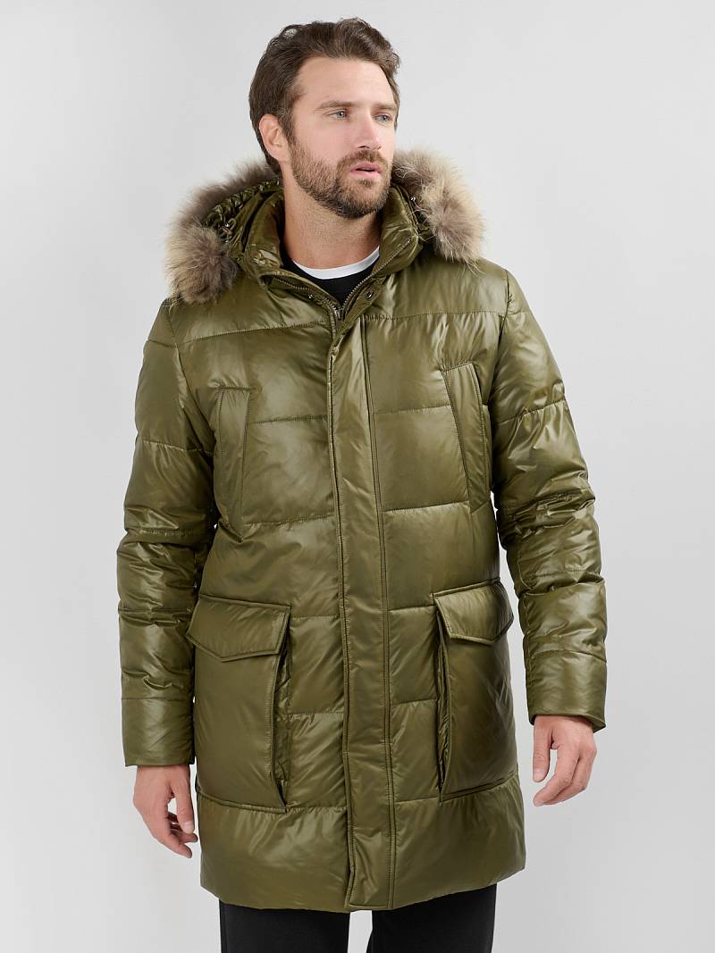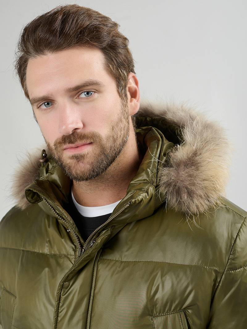 Куртка мужская (пуховик) с отстегивающимся капюшоном. На капюшоне - остегивающаяся меховая опушка, сзади, внизу две кнопки для регулировки глубины натяжения капюшона. Воротник стойка. Ветрозащитная планка на потайных кнопках. Застежка классическая молния YKK на два замка. Вместительные, утепленные велюром карманы, оборудованы клапанами на магнитах для защиты от дождя и снега. Рукава на удобных теплых манжетах. Инновационная, не продуваемая ткань верха с высокой степенью влаго и ветро защиты, с пропиткой WR и CIRE. Утеплитель антиалергенный биопух 220 гр / 200гр. не теряет своих свойств после химчистки и стирки . Длина по спинке для размера 50/176 - 95см. Ткань верха: 100% полиэстер. Подкладка: 100% полиэстер. Опушка: мех натуральный-ФИНСКИЙ АУКЦИОННЫЙ ЕНОТ.