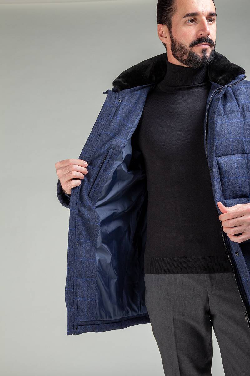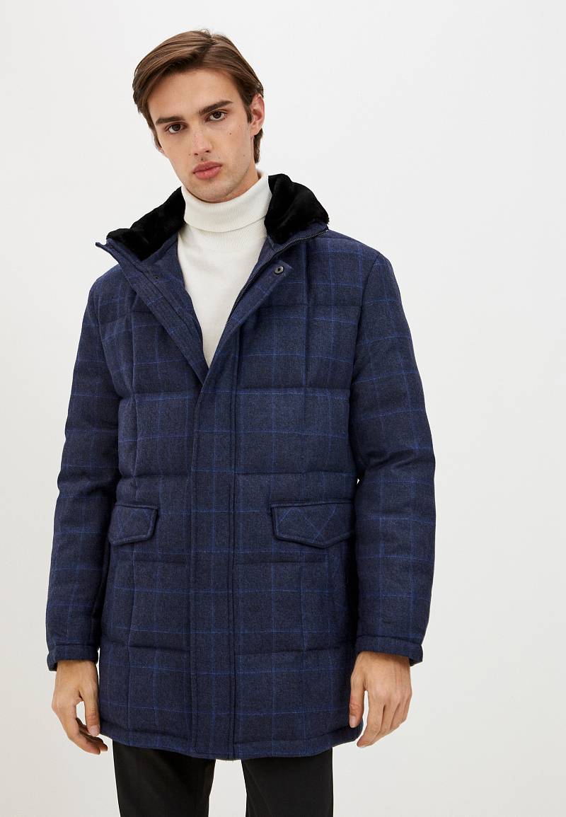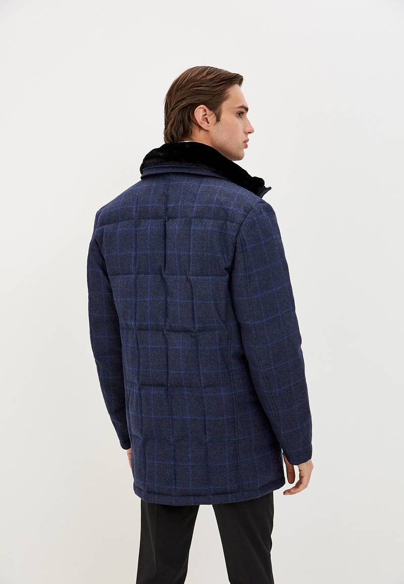 Куртка мужская утепленная со съемным меховым воротником, воротник - стойка. Центральная застежка изделия на молнию и ветрозащитную планку на 5 потайных кнопок. Рукава, полочки и спинка - простеганы стежкой "квадрат". На полочках - четыре нижних прорезных кармана: 1-й-с фигурными клапанами, 2-ой - наклонный с листочками. На подкладке два внутренних кармана на молниях и один накладной карман на пуговице. Длина изделия по спинке для роста 176 - 84см. Ткань верха: 100% шерсть. Подкладка: 100% полиэстер. Утеплитель: Лебяжий пух 250гр/м2/250гр/м2. Воротник: мех.