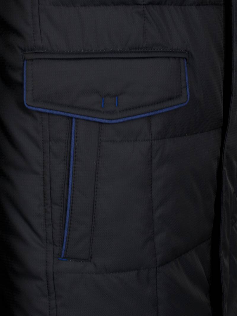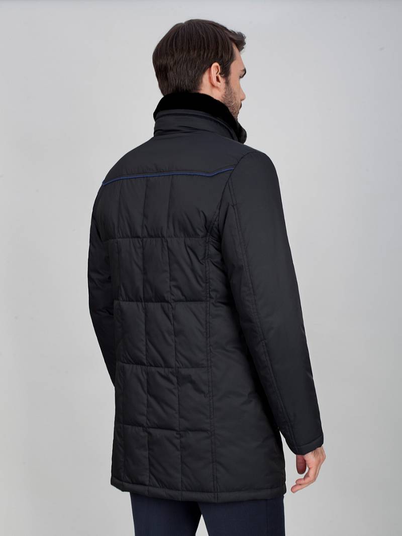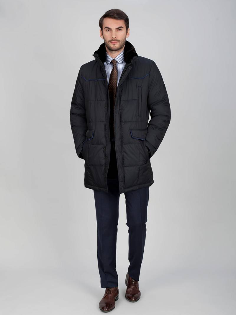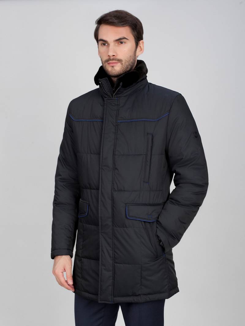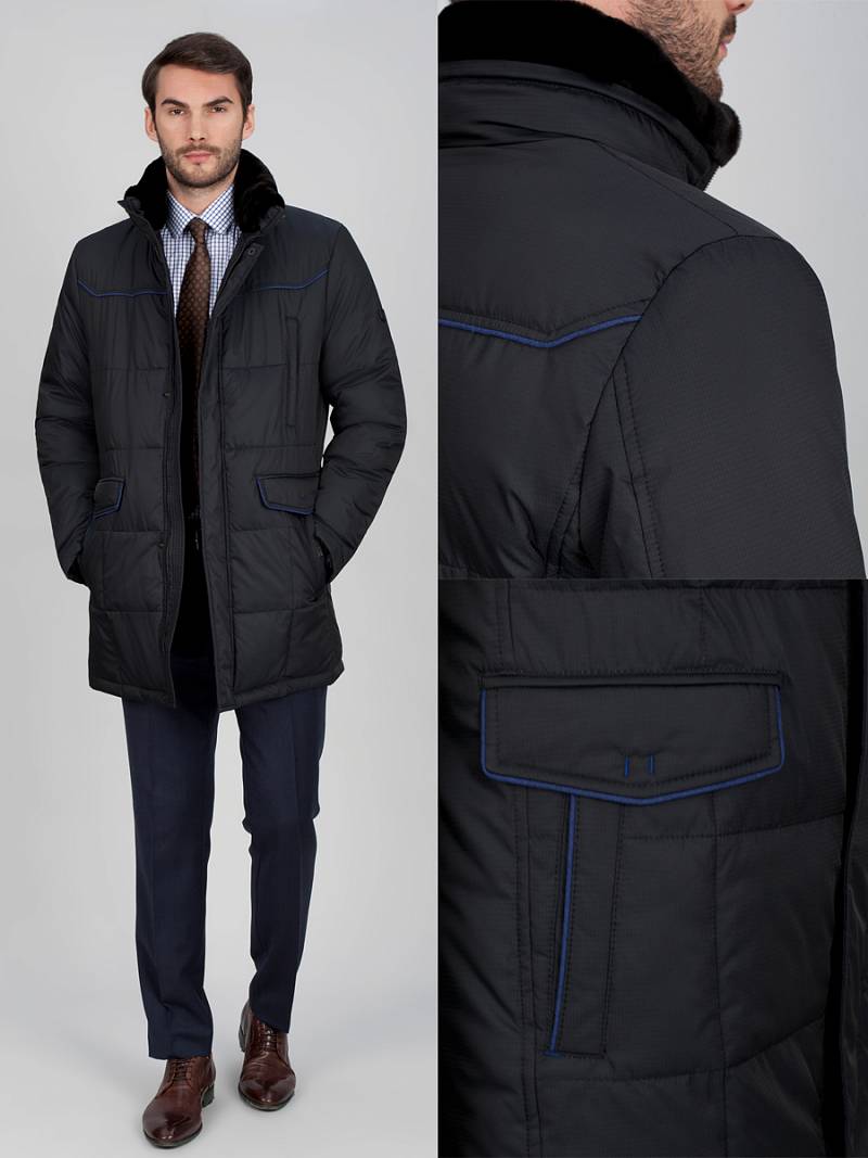Куртка мужская утепленная со съемным натуральным меховым воротником, воротник - стойка. Центральная застежка изделия на молнию и ветрозащитную планку на 5 потайных кнопок. Полочки, спинка- с фигурными кокетками. Рукава, полочки и спинка - простеганы стежкой "квадрат". На полочках - четыре нижних прорезных кармана: 1-й-с фигурными клапанами, 2-ой - наклонный с листочками. также имеется верхний прорезной карман на молнии. На подкладке по линии талии - настрочная фирменная тесьма. Также на подкладке два внутренних кармана на молниях и один накладной карман на пуговице. Длина изделия по спинке для роста 176 - 84см. Ткань верха: 100% полиэстер. Подкладка: 50% вискоза, 50% полиэстер. Утеплитель: Био-пух 100% (220гр)
