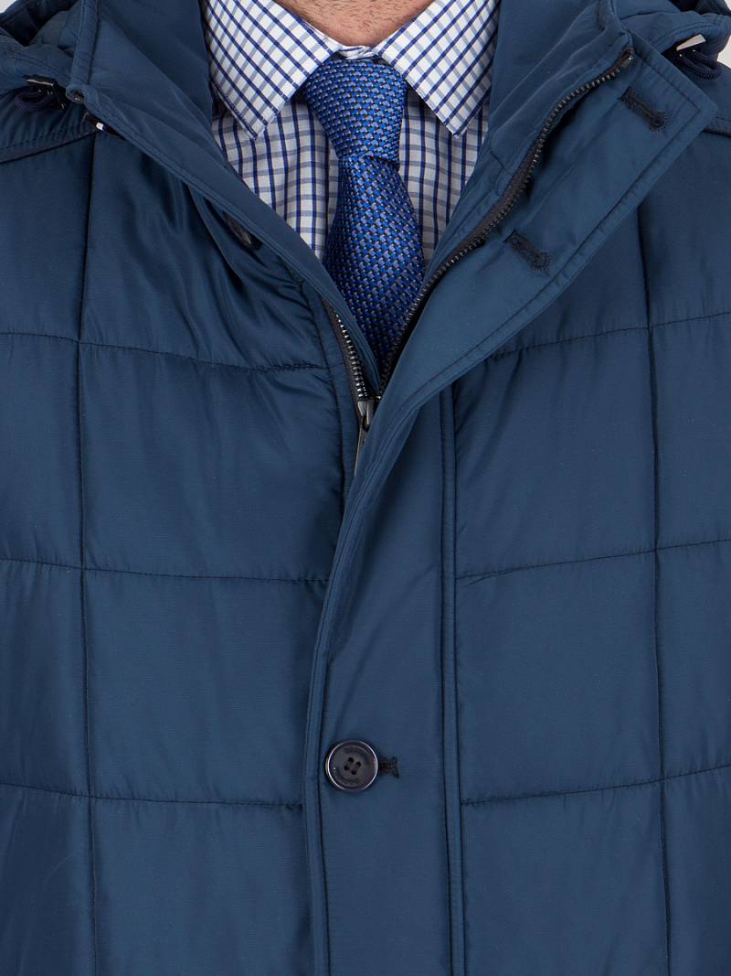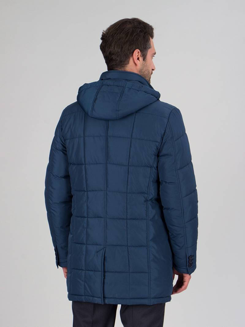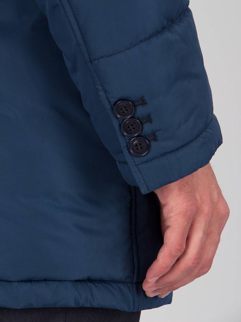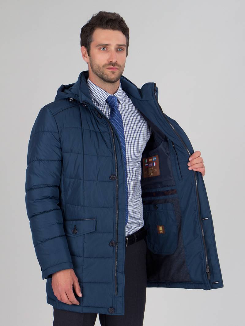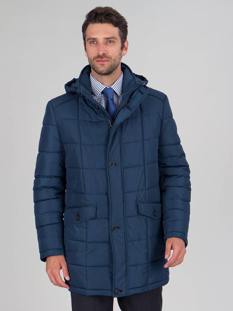 Куртка мужская утепленная на синтепухе 250гр, со съемным капюшоном, воротник - стойка. Центральная застежка изделия на молнию и ветрозащитную планку на 5 пуговиц. Полочки, спинка и рукава - простеганы стежкой "квадрат". На полочках - нижние прорезные карманы с фигурными клапанами на пуговицу, также имеются карманы внизу рельефных швов. На спинке - шлица, застегивается на 2 потайные кнопки. На подкладке по линии талии - настрочная фирменная тесьма. Длина изделия по спинке для роста 176 - 85см. Ткань верха: 100% полиэстер. Подкладка: 50% вискоза, 50% полиэстер. Утеплитель: Био-пух 100% (250гр.)
