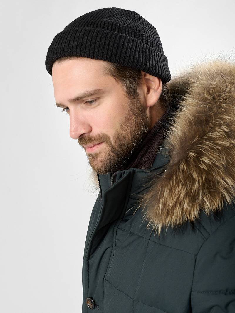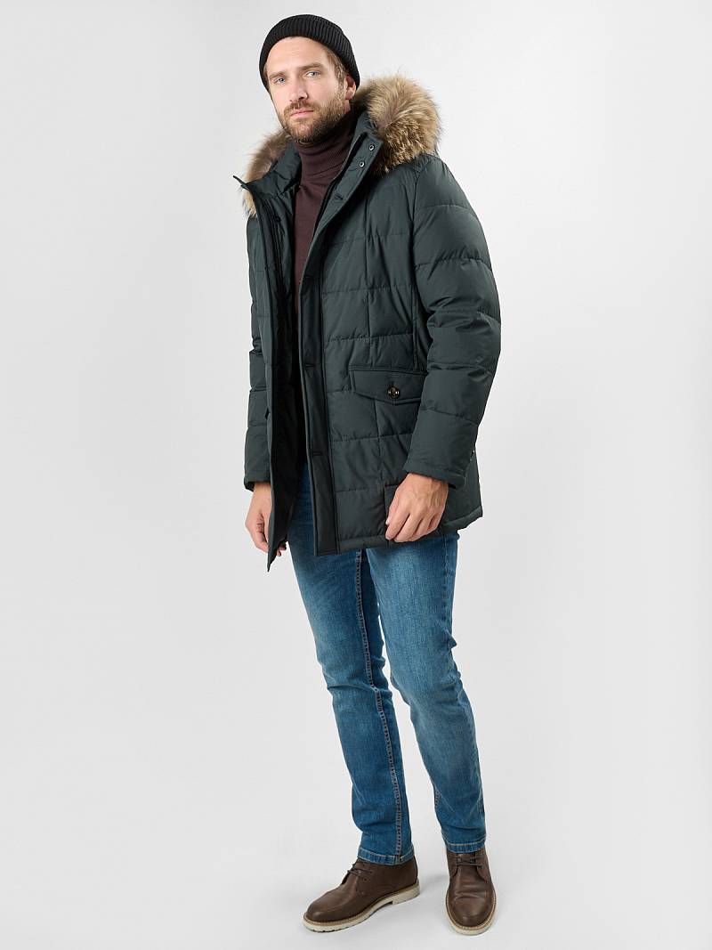 Куртка мужская утепленная со съемным капюшоном, воротник - стойка. Центральная застежка изделия на молнию и ветрозащитную планку на 5 пуговиц. Полочки, спинка и рукава - простеганы стежкой "квадрат". На полочках - нижние прорезные карманы с фигурными клапанами на пуговицу, также имеются карманы внизу рельефных швов. На спинке - шлица, застегивается на 2 потайные кнопки. На подкладке два внутренних кармана на молниях и 1 карман на пуговице. Длина изделия по спинке для роста 176 - 82см. Ткань верха: 100% полиэстер. Подкладка: 100% полиэстер. Утеплитель: био- пух 220гр/200гр. Опушка: мех натуральный-ФИНСКИЙ АУКЦИОННЫЙ ЕНОТ.