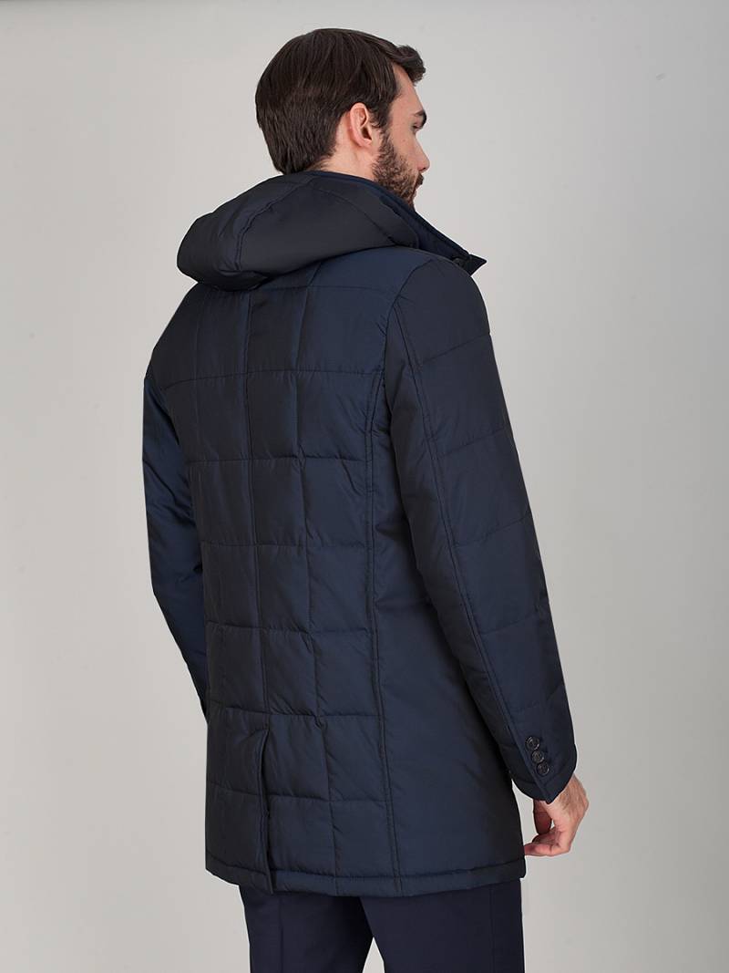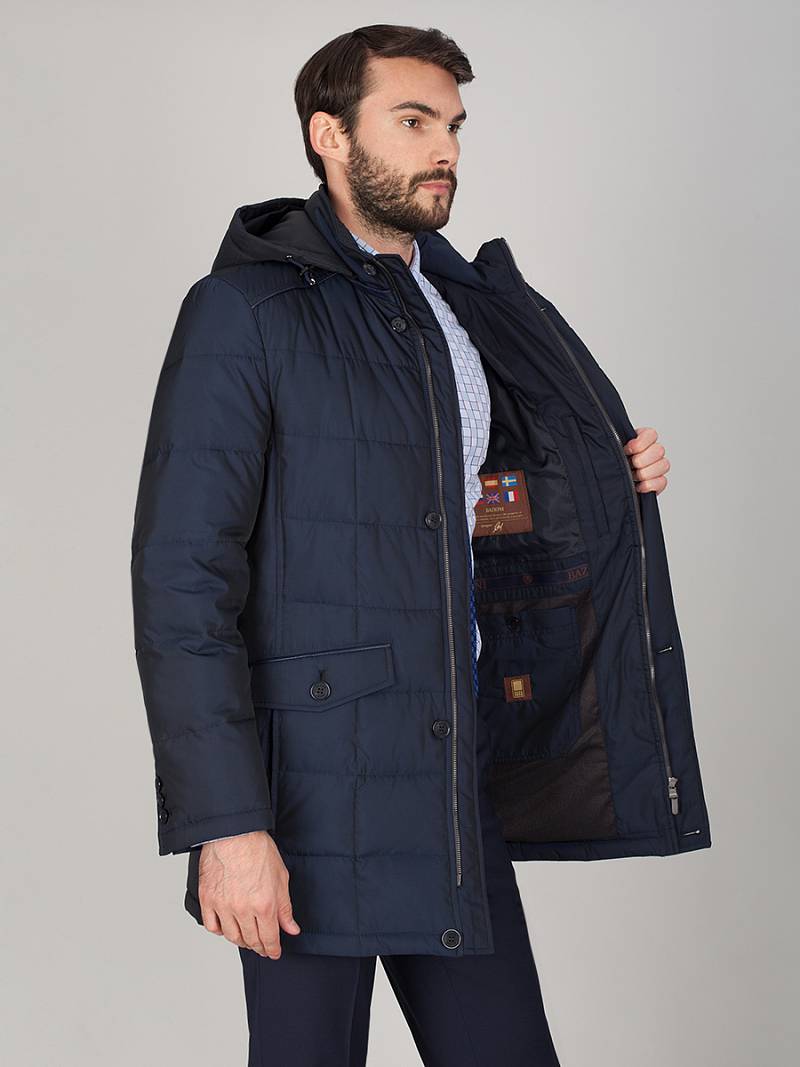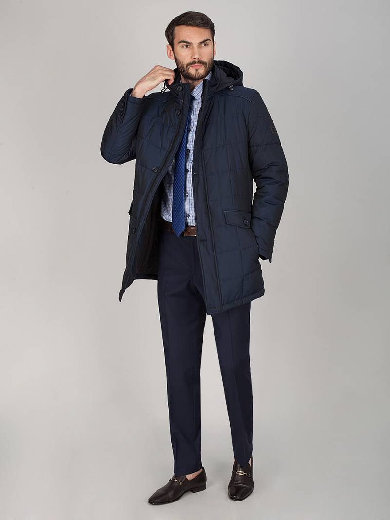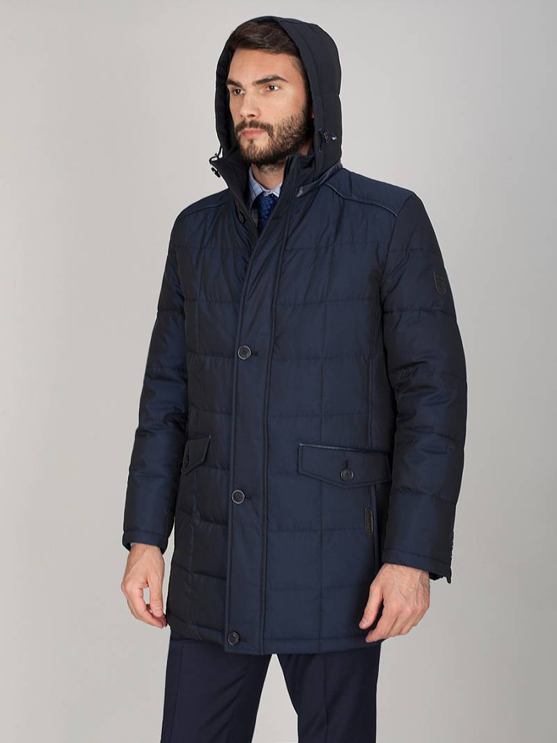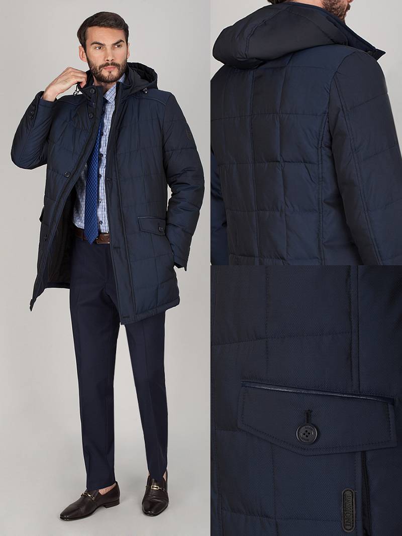 Куртка мужская утепленная со съемным капюшоном, воротник - стойка. Центральная застежка изделия на молнию и ветрозащитную планку на 5 пуговиц. Полочки, спинка и рукава - простеганы стежкой "квадрат". На полочках - нижние прорезные карманы с фигурными клапанами на пуговицу, также имеются карманы внизу рельефных швов. На спинке - шлица, застегивается на 2 потайные кнопки. На подкладке по линии талии - настрочная фирменная тесьма. На подкладке два внутренних кармана на молниях и 1 карман на пуговице. Длина изделия по спинке для роста 176 - 85см. Ткань верха: 100% полиэстер. Подкладка: 50% вискоза, 50% полиэстер. Утеплитель: Био-пух 100% (220гр.)