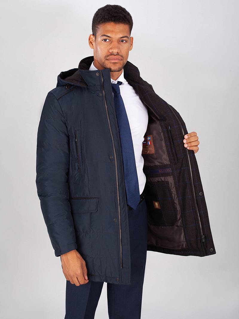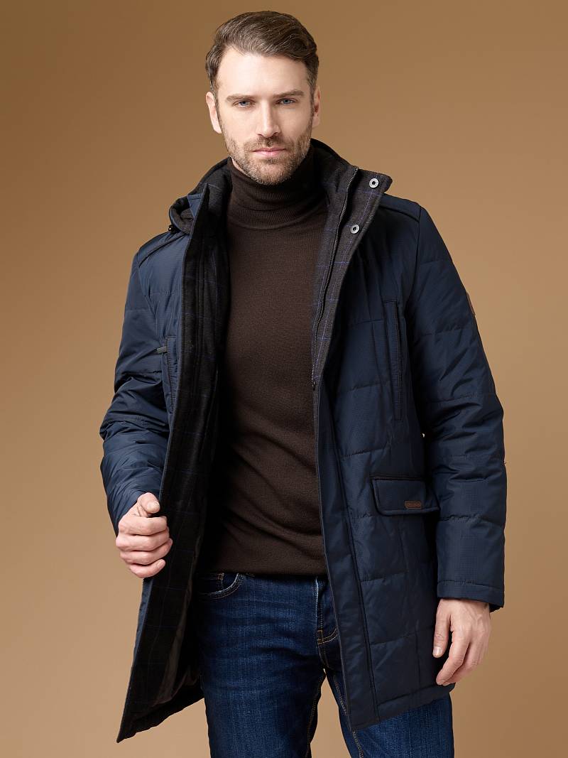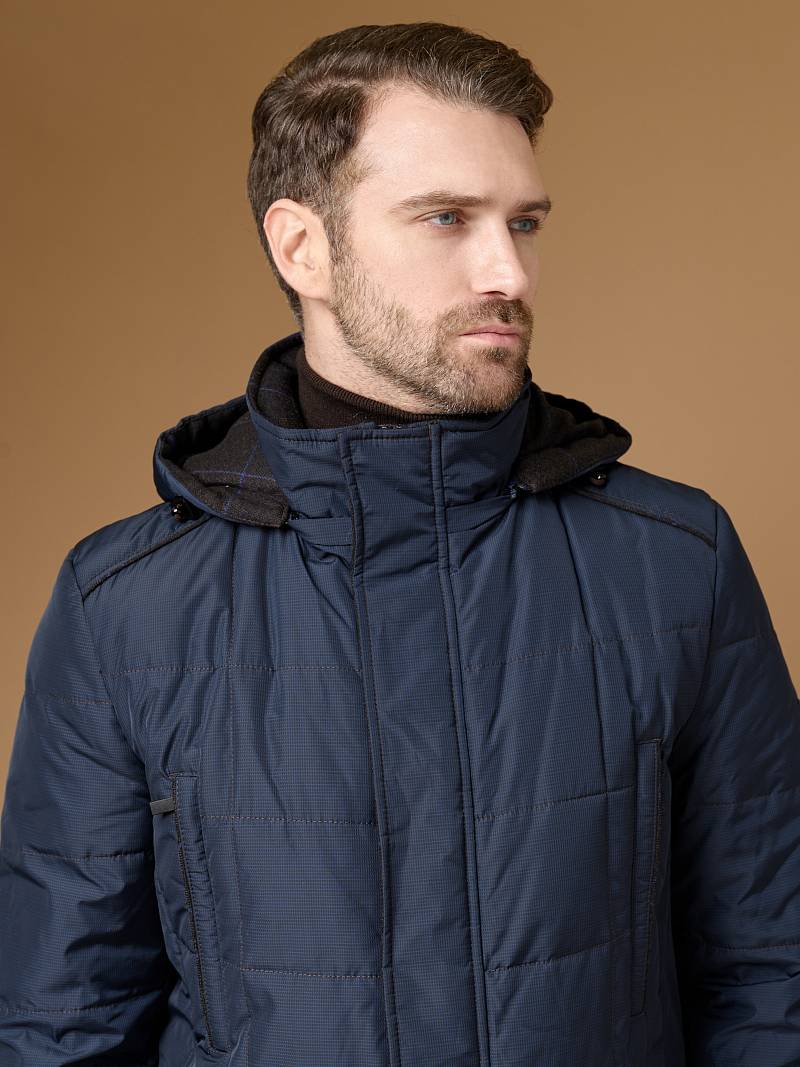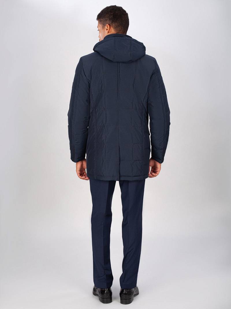 Куртка мужская утепленная со съемным капюшоном, воротник - стойка. Центральная застежка изделия на молнию и ветрозащитную планку на 5 кнопках. Полочки, спинка и рукава - простеганы стежкой "квадрат". На полочках - нижние прорезные карманы с фигурными клапанами, также имеются карманы внизу рельефных швов. На спинке - шлица, застегивается на 2 потайные кнопки. На подкладке по линии талии - настрочная фирменная тесьма. На подкладке два внутренних кармана на молниях и один карман на пуговице. Длина изделия по спинке для роста 176 - 84см. Ткань верха: 100% полиэстер+100%шерсть. Подкладка: 100% полиэстер. Утеплитель: Био-пух 100% (220гр.)