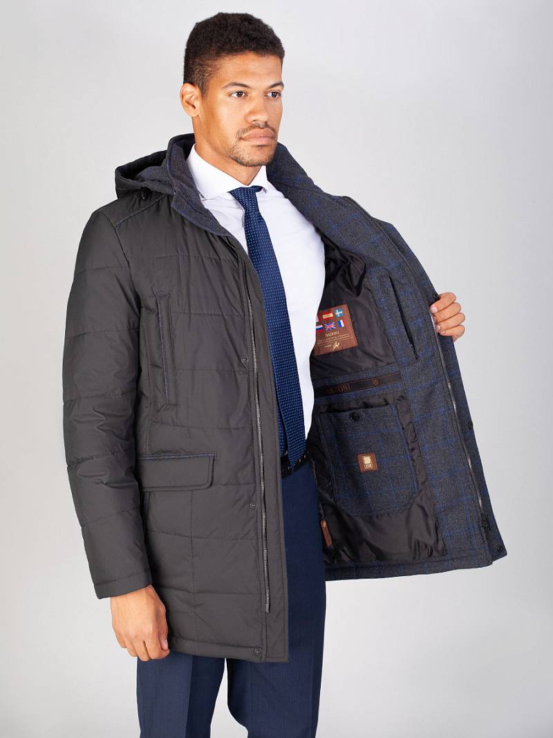 Куртка мужская утепленная со съемным капюшоном, воротник - стойка. Центральная застежка изделия на молнию и ветрозащитную планку на 5 кнопках. Полочки, спинка и рукава - простеганы стежкой "квадрат". На полочках - нижние прорезные карманы с фигурными клапанами, также имеются карманы внизу рельефных швов. На спинке - шлица, застегивается на 2 потайные кнопки. На подкладке по линии талии - настрочная фирменная тесьма. На подкладке два внутренних кармана на молниях и один карман на пуговице. Длина изделия по спинке для роста 176 - 84см. Ткань верха: 100% полиэстер+100%шерсть. Подкладка: 100% полиэстер. Утеплитель: био - пух 220гр/200гр.