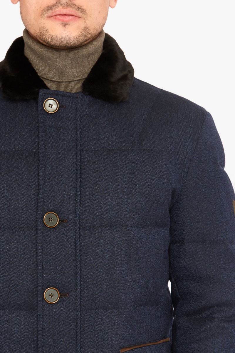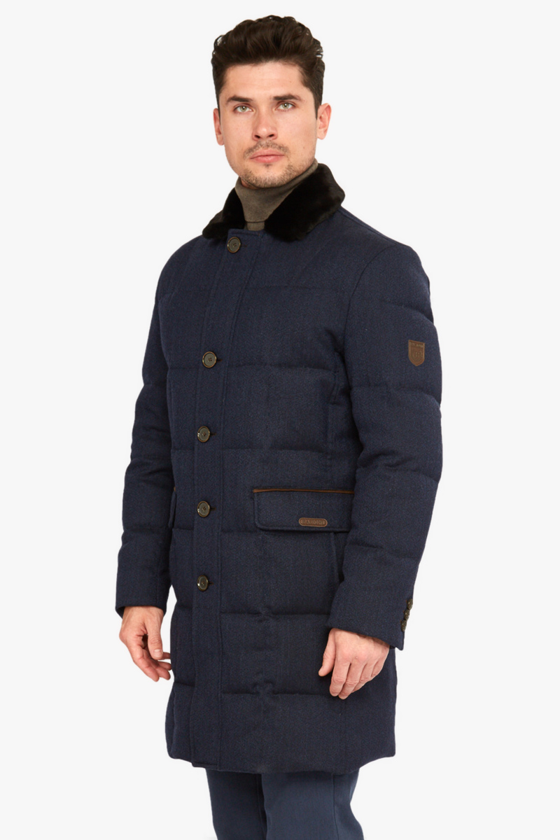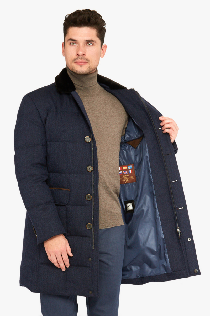 Куртка мужская (пуховик) из шерстяной ткани с воротником их натурального меха мутон. Застежка изделия центральная на молнию и ветрозащитную планку на 4 пуговицы. Воротник - отложной на стойке. Спинка, полочки и передние части рукавов простеганы стежкой. На полочке боковые карманы прорезные с фигурными клапанами на пуговицах и дополнительно вертикальные карманы "в шве" на магнитах. Спинка со средним швом и шлицей. На левом рукаве - герб-нашивка, по низу рукавов - иммитация шлицы на пуговицах. Кант на клапанах и обтачки боковых карманов - из отделочной ткани. На подкладке - два внутренних прорезных кармана на пуговицах. Длина изделия по спинке для роста 176 - 95см. Ткань верха: 100%шерсть. Подкладка: 100%полиэстер. Утеплитель: пух-перо 80/20 (гусь-утка) - 268гр на 1 изделие. Воротник: мех натуральный мутон