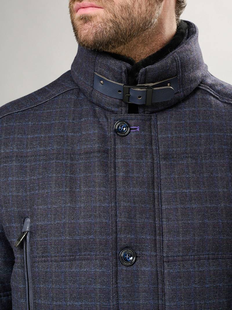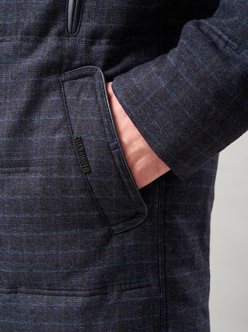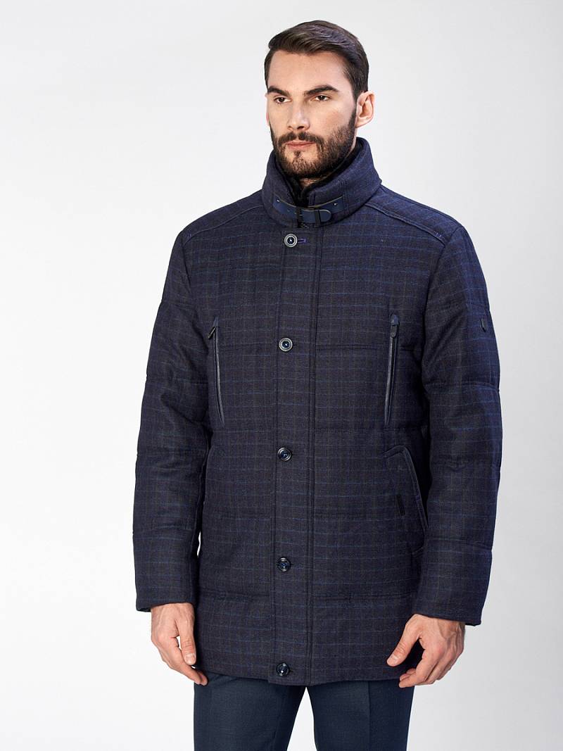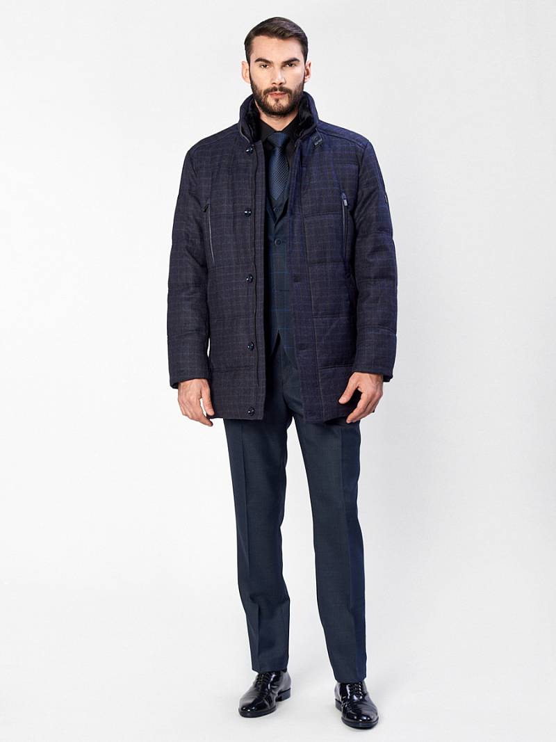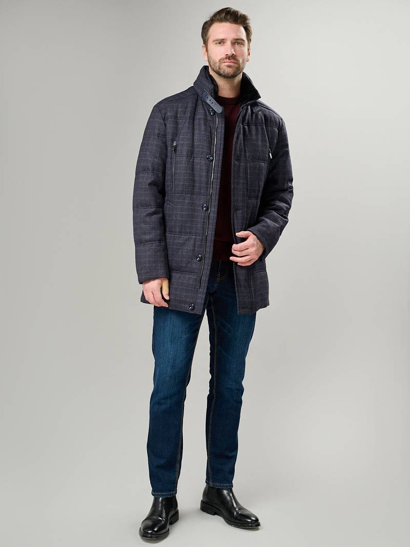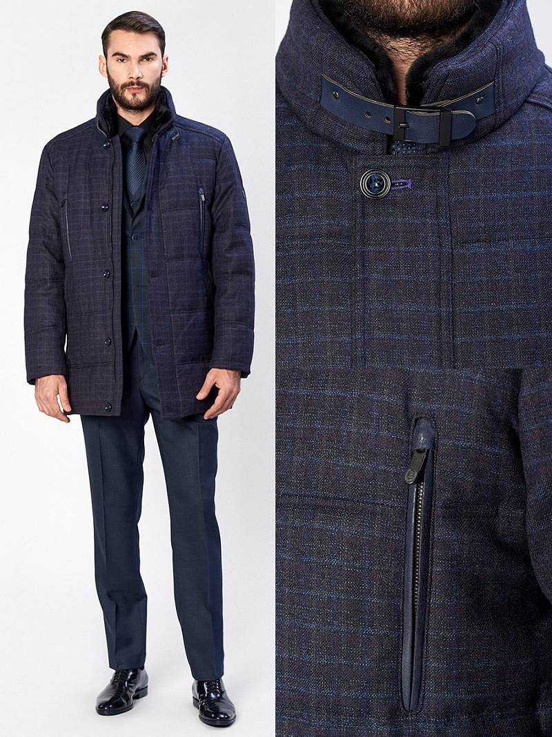 Куртка мужская утепленная со съемным меховым натуральным воротником, застежка на молнию и ветрозащитную планку на 5 пуговиц. Спинка, полочка и рукава простеганы горизонтальными двойными отделочными строчками. На полочках- два нагрудных кармана в рамку на молнию и два нижних боковых наклонных кармана с листочками. Спинка со средним швом и одной шлицей на двух потайных кнопках. На левом рукаве - герб-нашивка. Рамки нагрудных карманов, кант в кокетках полочек и кант в листочках - из отделочной ткани. На подкладке два внутренних кармана на молнии и один карман на пуговице, по линии талии на подкладке - отделочная фирменная тесьма. Длина изделия по спинке для роста 176- 85см. Ткань верха: 100%шерсть. Подкладка: 100% полиэстер. Утеплитель: Био-пух 100% (220гр) Воротник: мех натуральный мутон