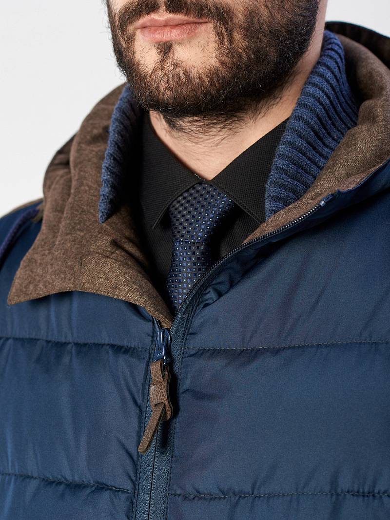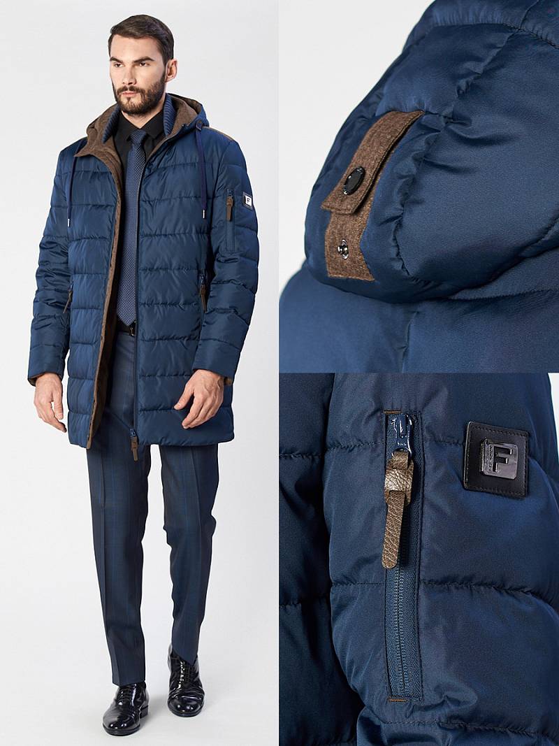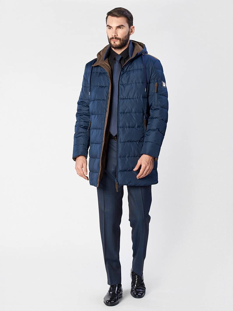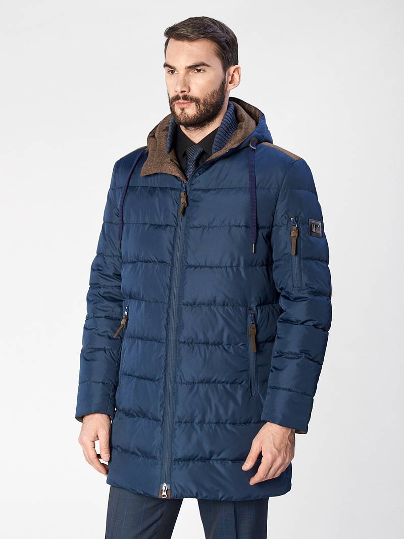 Куртка мужская утепленная с капюшоном из плащевой ткани на подкладке с центральной застежкой на двухзамковую молнию до низа изделия. Воротник стойка из трикотажного полотна. Несъемный капюшон. Передний край капюшона - оформлен кулисой, которая затягивается двумя фиксаторами. Полочки, спинка и рукава простеганы горизонтальной стежкой. Боковые карманы на молниях. Рукава втачные состоят из двух частей, на левом рукаве- фирменная нашивка и прорезной карман в рамку на молнии. По низу рукавов со стороны подкладки - трикотажные манжеты. На подкладке спинки в области талии - отделочная тесьма с фирменным логотипом , на полочках подкладки- 2 внутренних прорезных кармана с втачной листочкой на молнии. Длина изделия по спинке для роста 176 - 90см+4см(хвост). Ткань верха: 100% полиэстер. Подкладка: 100% полиэстер. Утеплитель: Био-пух 100% (220гр)