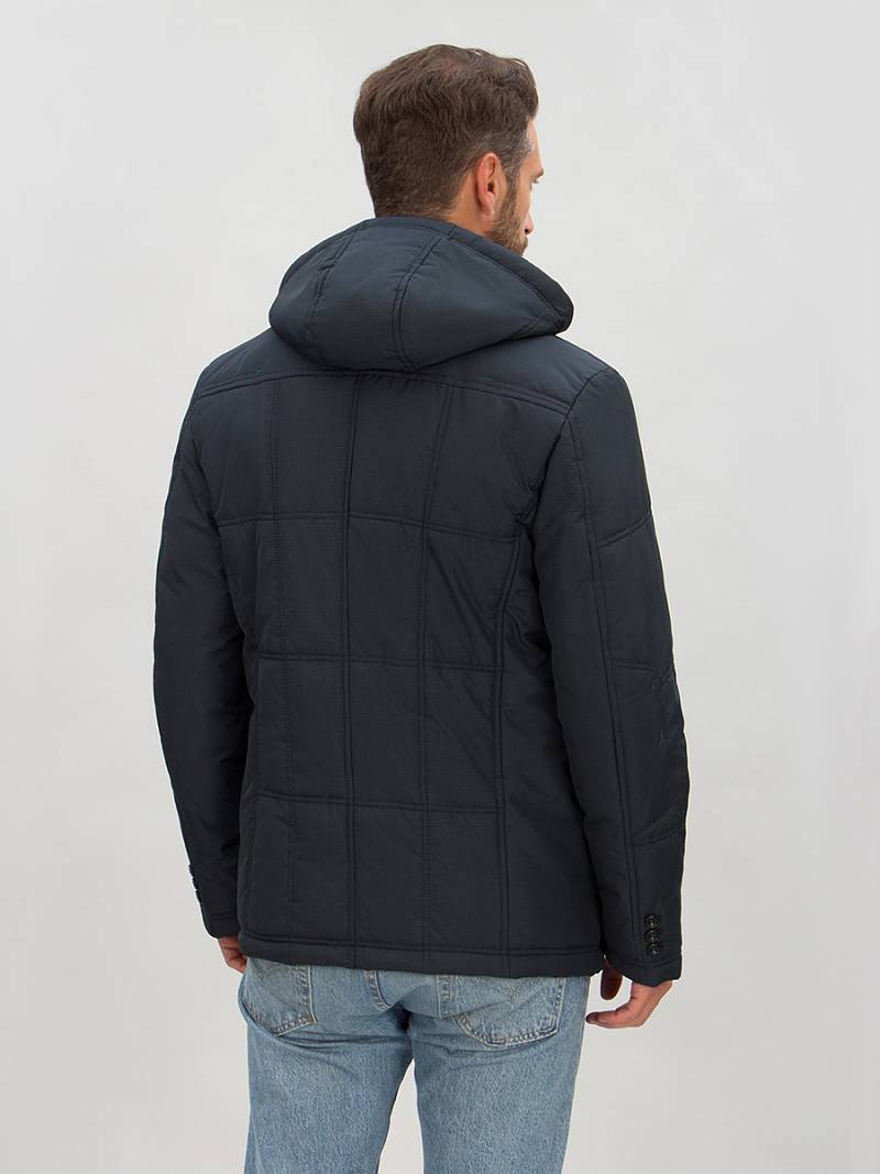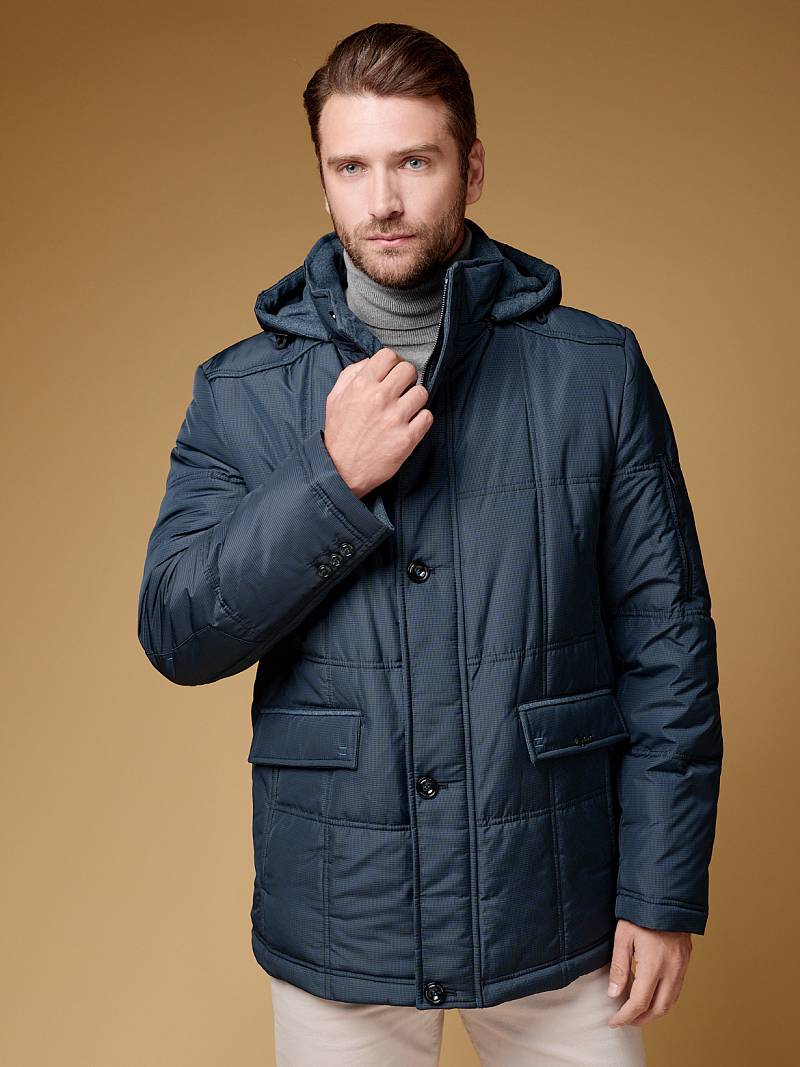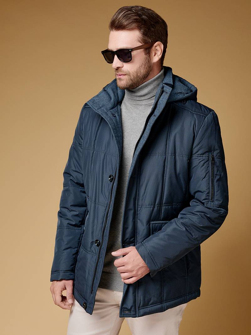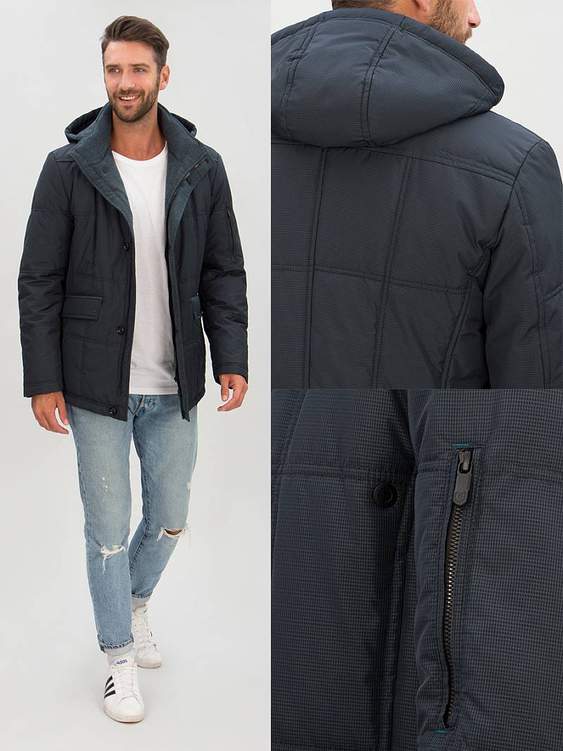Куртка мужская утепленная на синтепухе 200гр, воротник - стойка, отстегивающийся капюшон. Центральная застежка изделия на молнию и ветрозащитную планку на 5 пуговиц. Полочки, спинка и рукава - простеганы стежкой "квадрат". На полочках - нижние прорезные карманы с клапанами, также имеются дополнительные боковые карманы " в шве", внизу рельефных швов. На полочке и спинке -отрезные кокетки. На спинке - шлица. Рукава втачные двухшовные, в области локтя отрезные налокотники, на левом рукаве карман на молнии. Капюшон и низ изделия дополнен резинками для регулировки объема. На подкладке два внутренних кармана на молнии. Длина изделия по спинке в росте 176 - 76см.Ткань верха: 100% полиэстер. Подкладка: 100% полиэстер. Утеплитель: Био-пух 100% - 220гр.