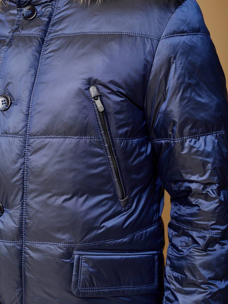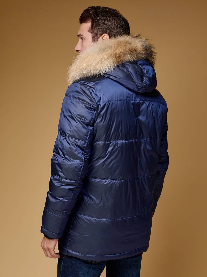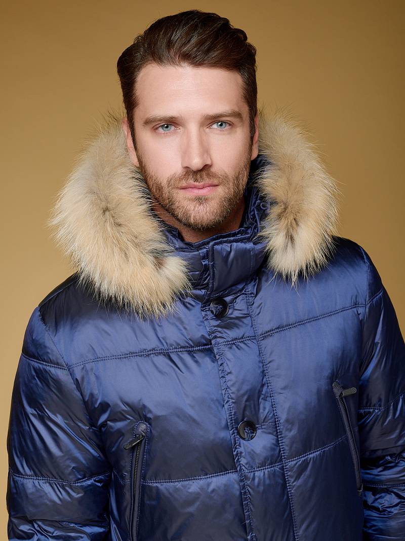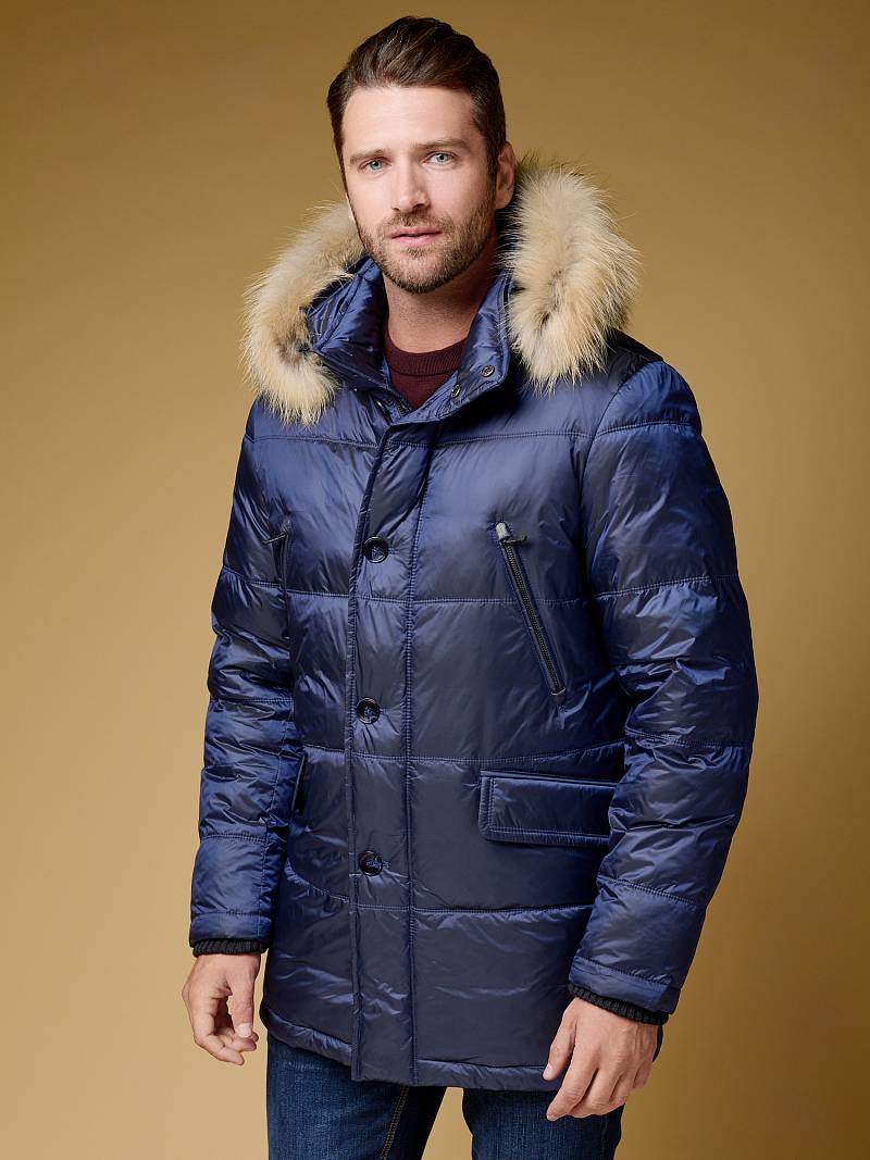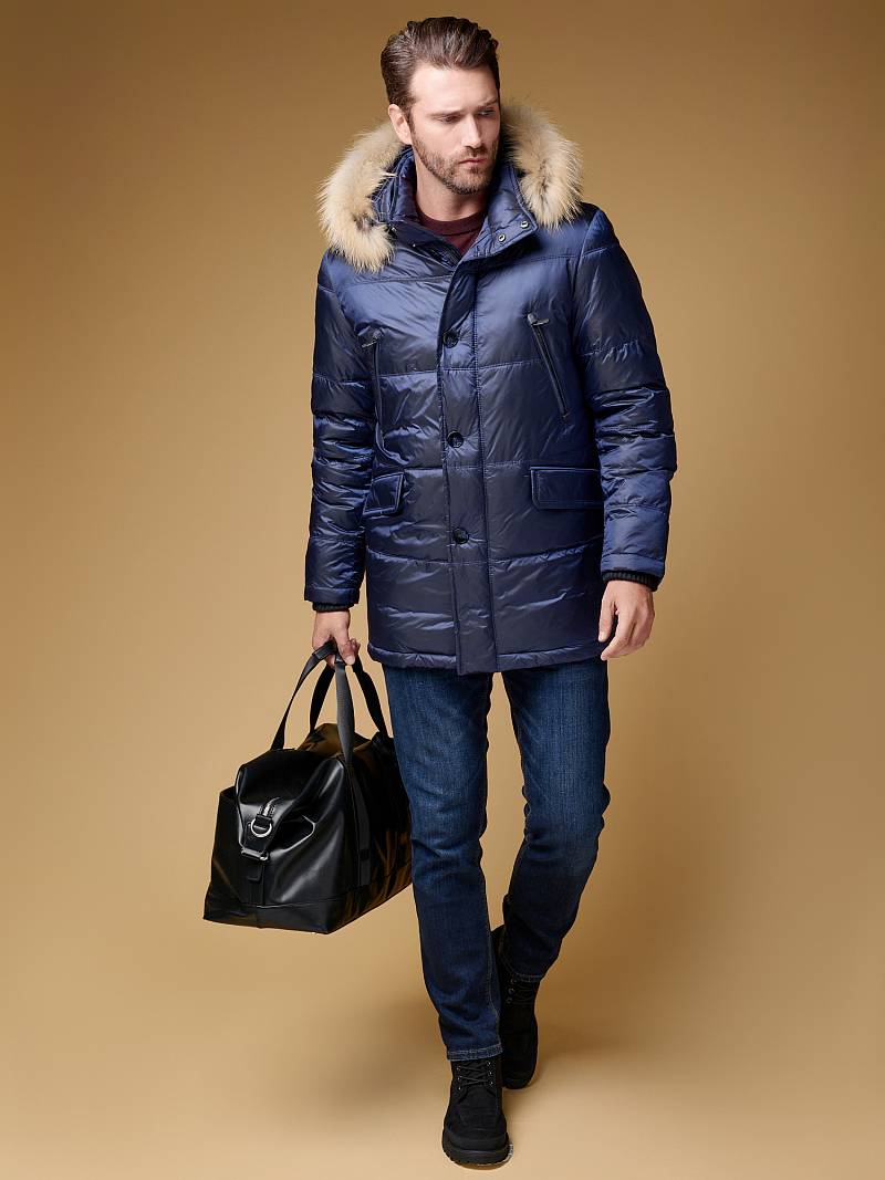 Куртка мужская утепленная (пуховик) с капюшоном из плащевой ткани с центральной застежкой на молнию и ветрозащитную планку на 4 пуговицы. Ткань верха с водоотталкивающей пропиткой WR, CIRE с высокой степенью влаго- и ветрозащитой, имеет эффект- благородный блеск. Капюшон отстегивающийся c опушкой из натурального меха, воротник - стойка. Простеганные двойной отделочной строчкой - полочки и спинка- с кокеткой. На полочках - четыре кармана: два нижних боковых прорезных кармана с клапаном и два верхних прорезных кармана на молниях. Рукава втачные с локтевыми швами, по низу рукава - трикотажный манжет. На подкладке - два внутренних прорезных кармана в рамку. Длина по спинке-83см. Ткань верха: 100%нейлон. Подкладка: 100% полиэстер. Утеплитель: био- пух 220гр/200гр. Опушка: мех натуральный.
