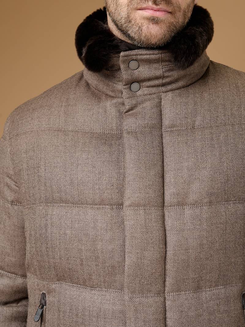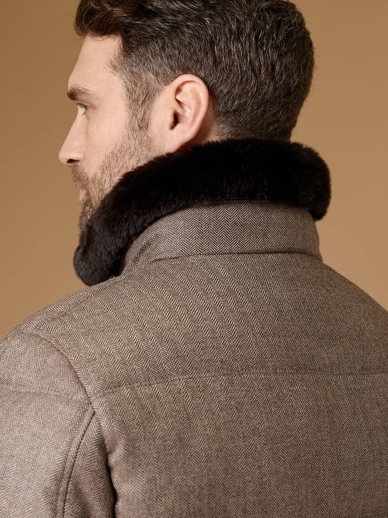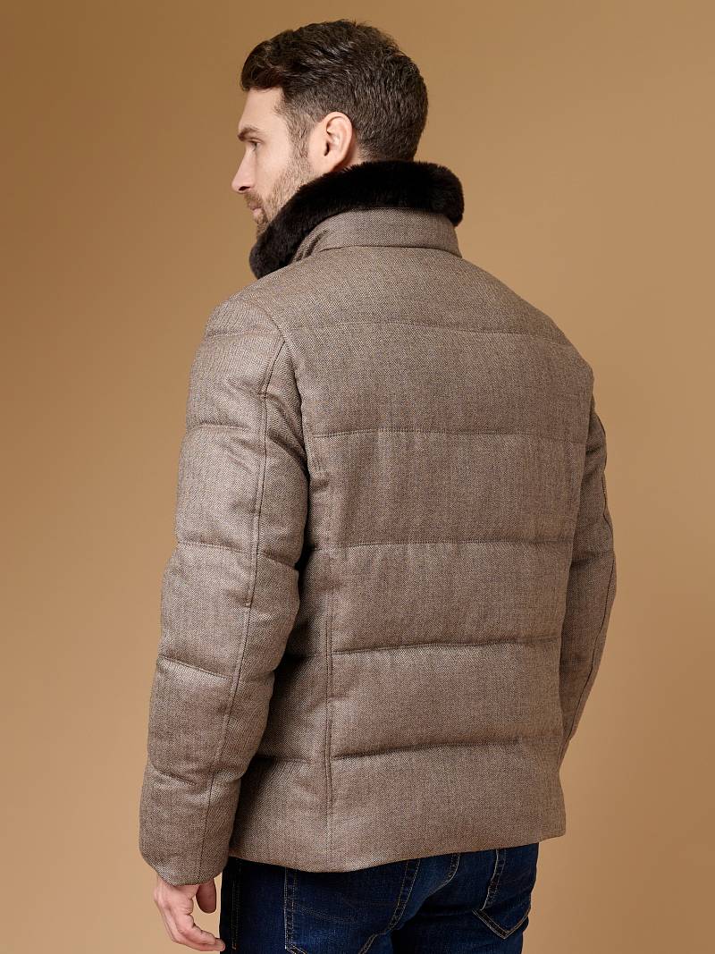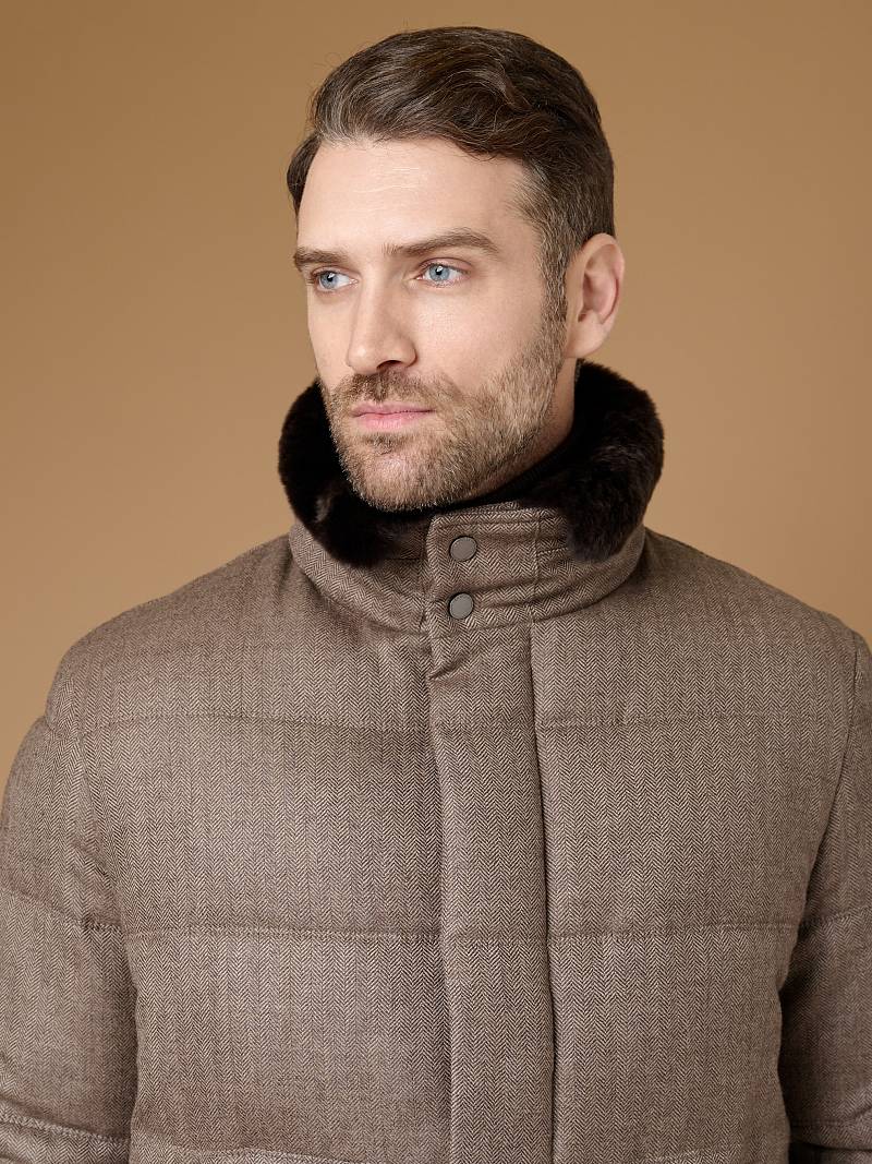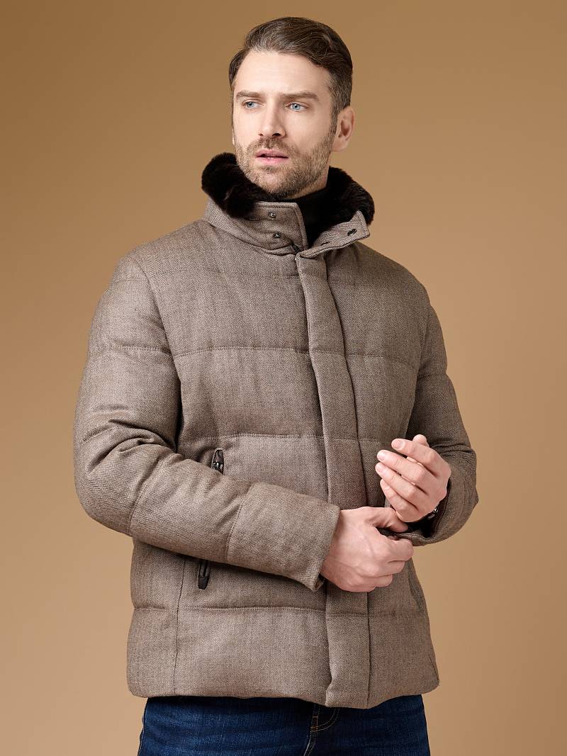 Куртка мужская (пуховик) простегана из шерстяной ткани. Воротник - стойка с меховым отстегивающимся натуральным воротником. На полочках - прорезные карманы с молниями. Подкладка из пуходержащей ткани, на подкладке два кармана на молнии. Длина по спинке для роста 176 - 72см. Ткань верха: 100% шерсть. Подкладка: 100% полиэстер. Утеплитель: био- пух 200гр/180гр. Воротник: мех натуральный ФИНСКИЙ АУКЦИОННЫЙ КРОЛИК REX.