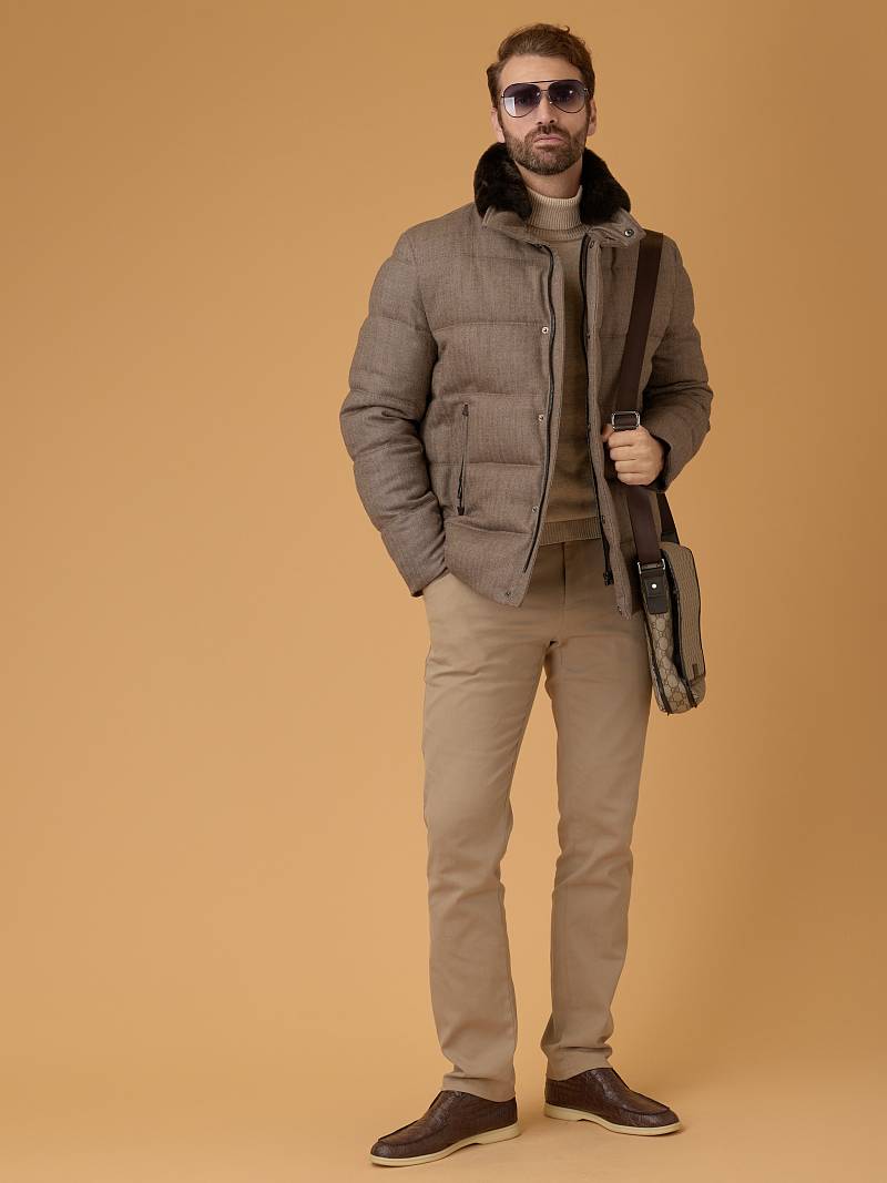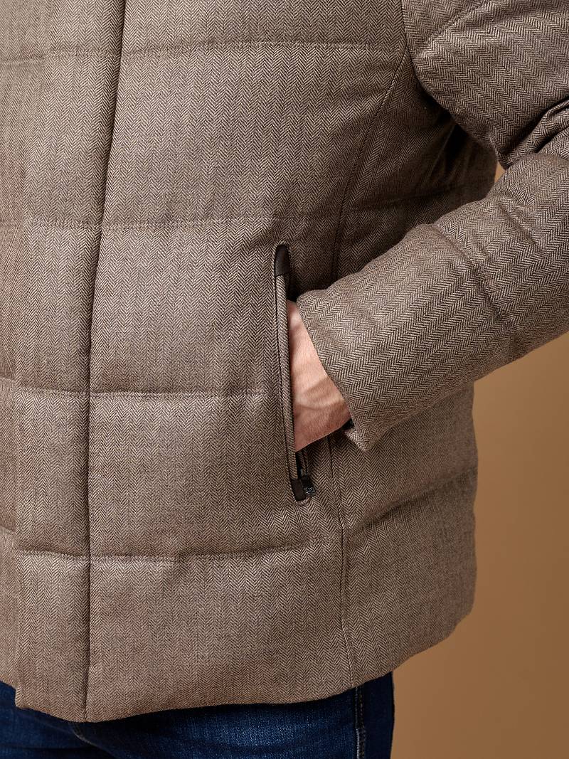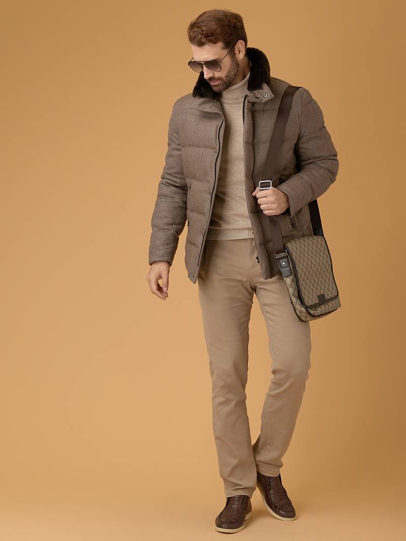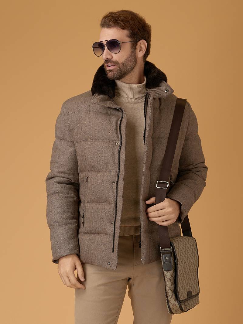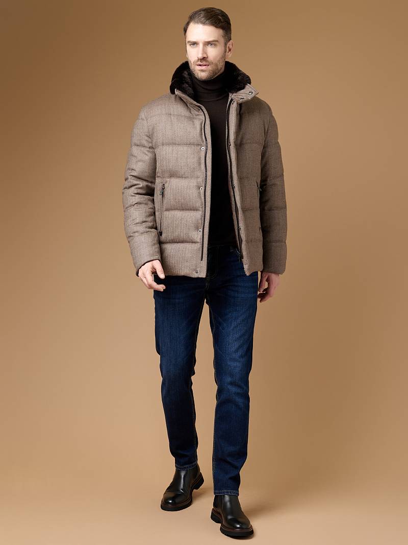 Куртка мужская (пуховик) простегана из шерстяной ткани. Воротник - стойка с меховым отстегивающимся натуральным воротником. На полочках - прорезные карманы с молниями. Подкладка из пуходержащей ткани, на подкладке два кармана на молнии. Длина по спинке для роста 176 - 72см. Ткань верха: 100% шерсть. Подкладка: 100% полиэстер. Утеплитель: био- пух 200гр/180гр. Воротник: мех натуральный ФИНСКИЙ АУКЦИОННЫЙ КРОЛИК REX.
