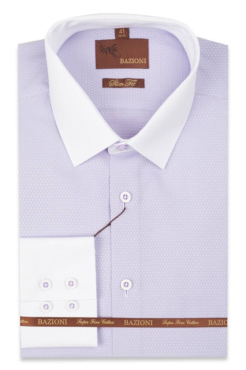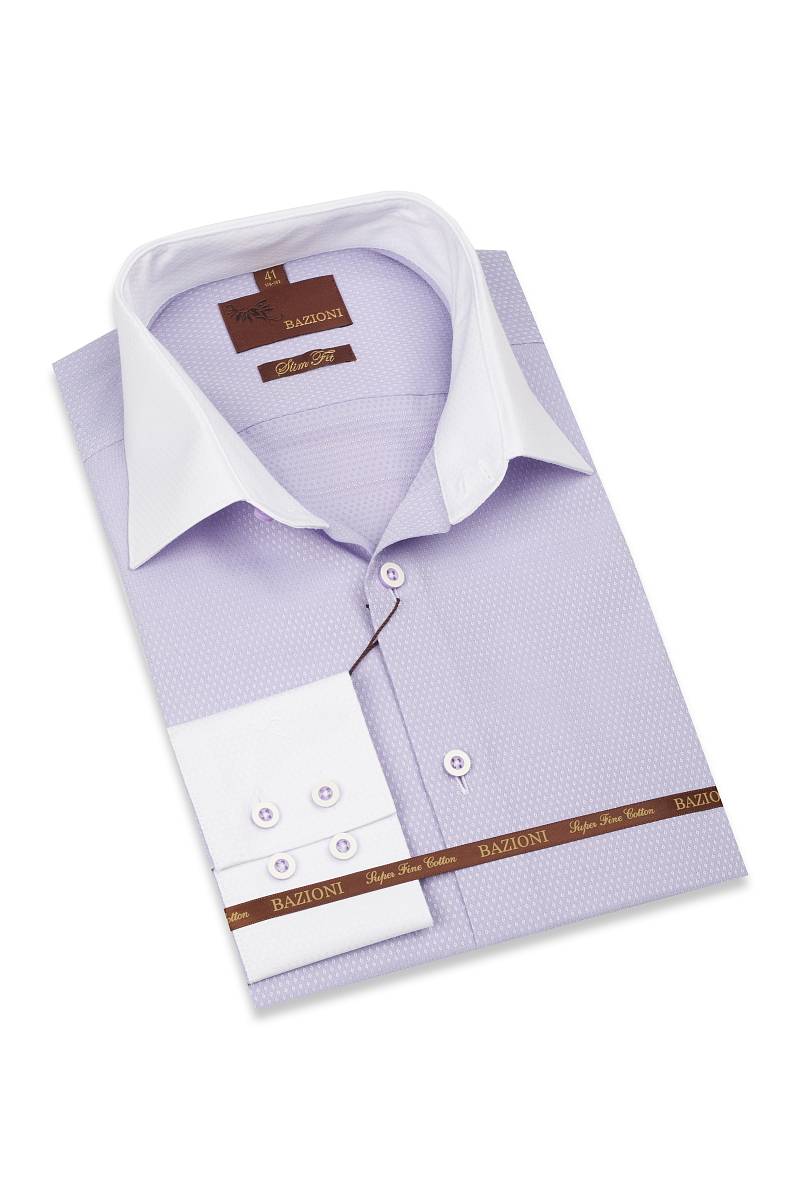 Slim fit, воротник-классический с высокой стойкой на две пуговицы, манжет - обычный 8см с прямым углом на две вертикально расположенные пуговицы и две регулирующие, застежка - без отделки. Воротник , стойка воротника и манжеты - из отделочной ткани - белые.