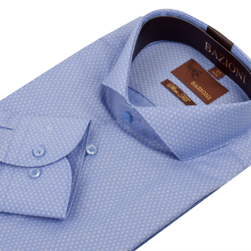 Slim fit, воротник -акула, манжет с скругленным углом на две пуговицы. застежка без отделки.