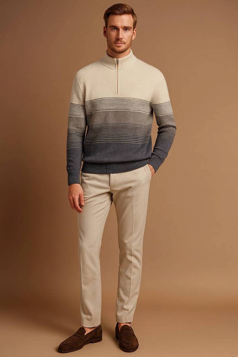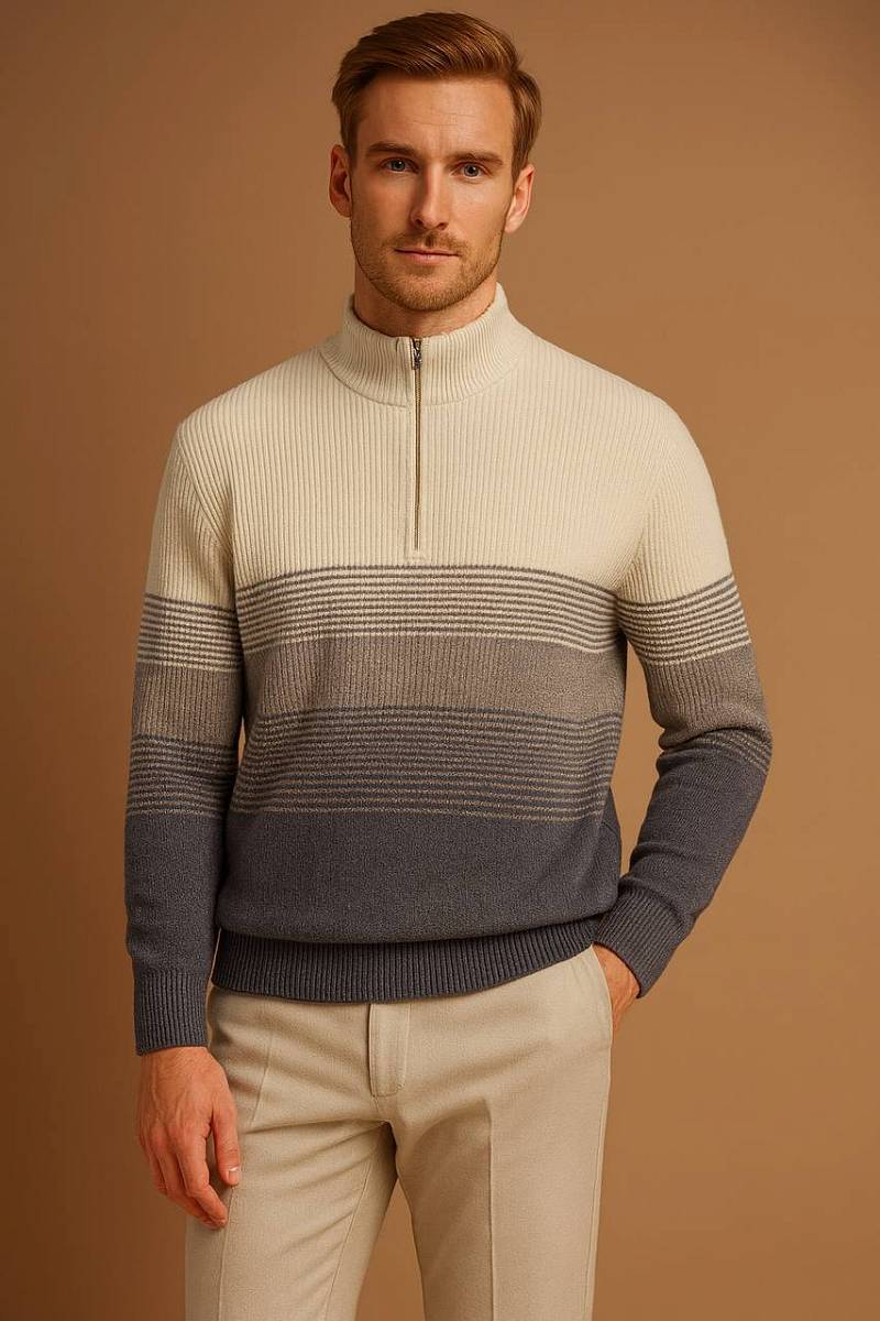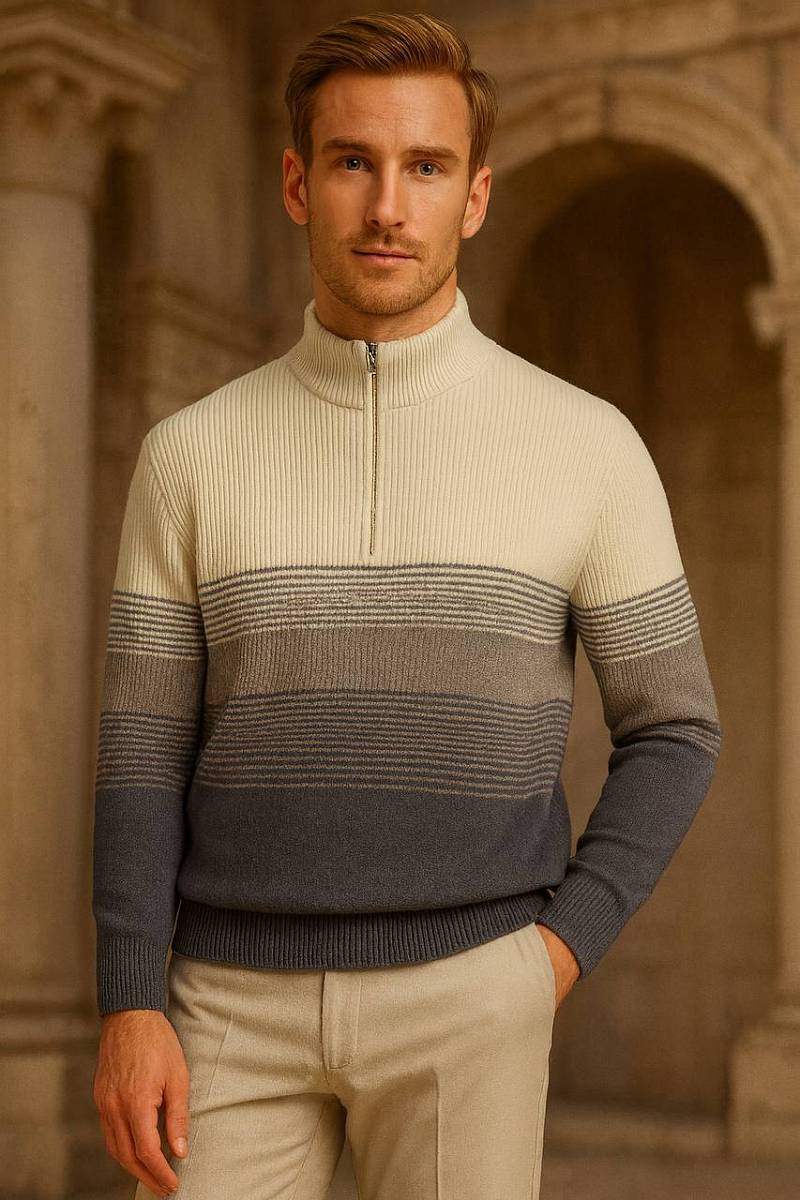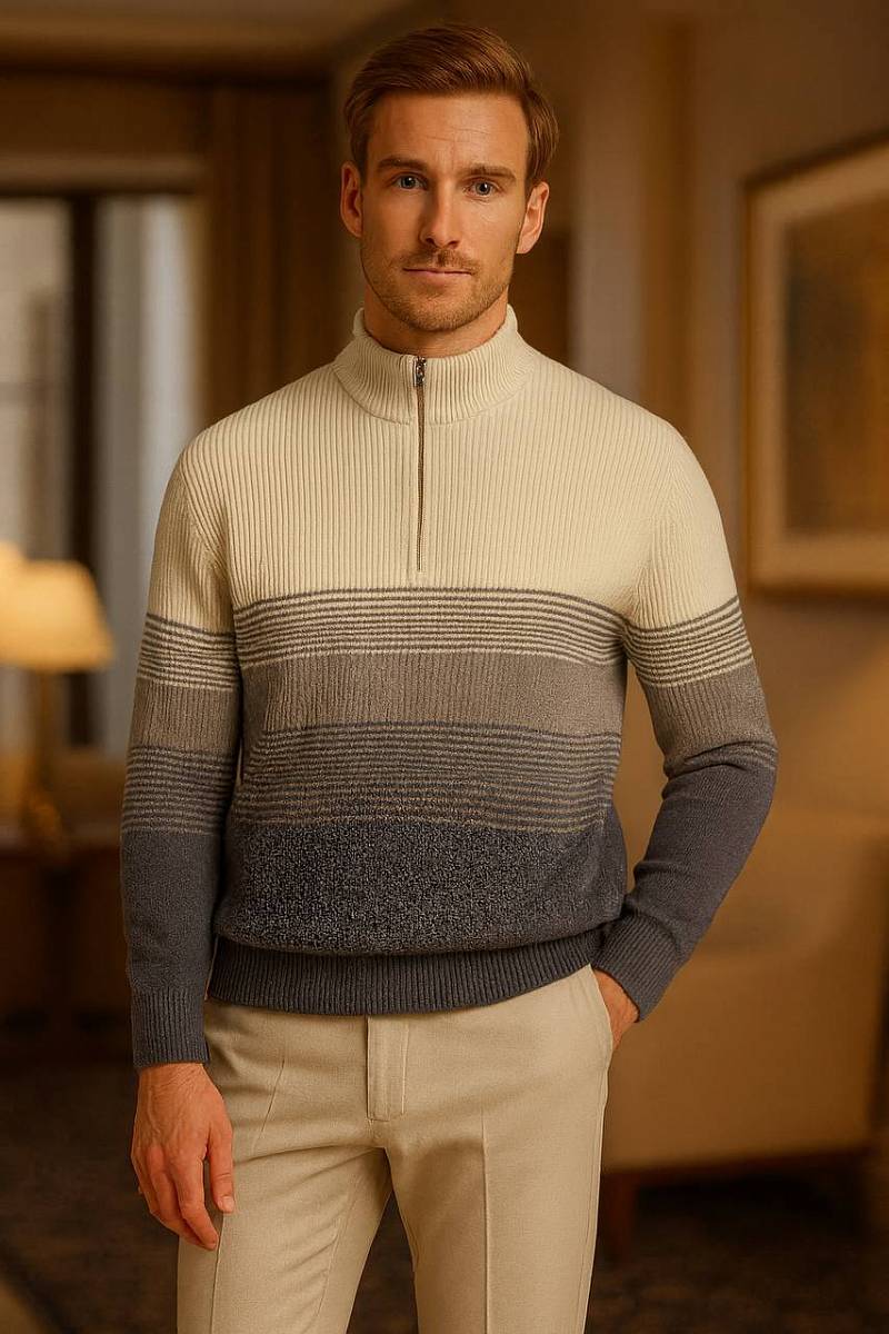 Джемпер от марки BAZIONI — стильное сочетание современного дизайна и повседневного комфорта.Модель выполнена из качественного материала: 80% хлопок и 20% акрил, что обеспечивает мягкость, воздухопроницаемость и практичность в носке. Ткань приятна к телу, хорошо сохраняет форму и подходит для любого времени года.Элегантная серая гамма с плавным градиентным переходом оттенков придаёт изделию выразительность и делает образ более динамичным и современным. Такой дизайн легко впишется как в повседневный, так и в smart-casual гардероб.Джемпер дополнен воротником-стойкой с молнией, который добавляет функциональности и стильного акцента. Продуманный крой подчёркивает фигуру, обеспечивая комфорт и свободу движений.