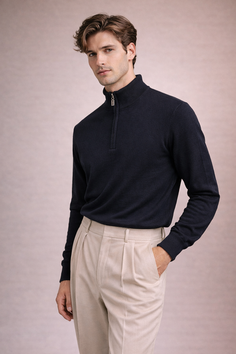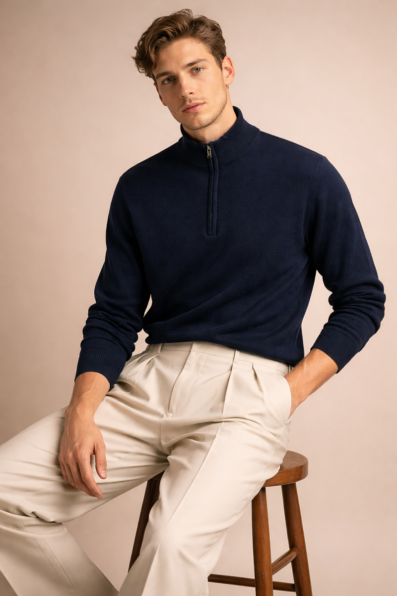 Глубокий синий цвет придаёт образу сдержанную выразительность и универсальность, позволяя легко сочетать джемпер как с классическими, так и с повседневными элементами гардероба.