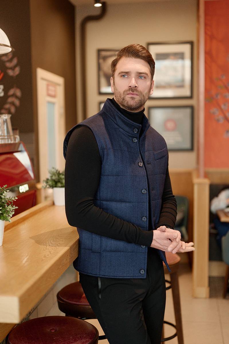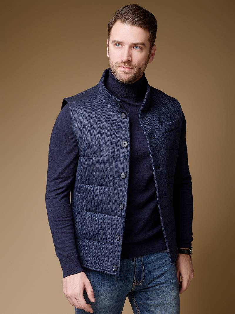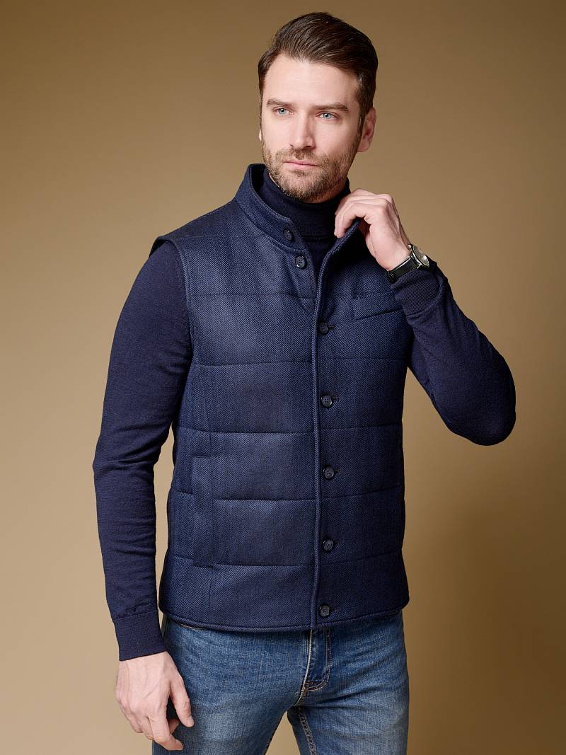 Жилет мужской утепленный, стеганный. Центральная застежка на пуговицы, воротник-стойка, в боковых швах расположены карманы с листочкой. Длина изделия по спинке для роста 176 - 69,5см. Ткань верха: 100% шерсть. Подкладка: 100% вискоза. Утеплитель: термоплюс 210гр