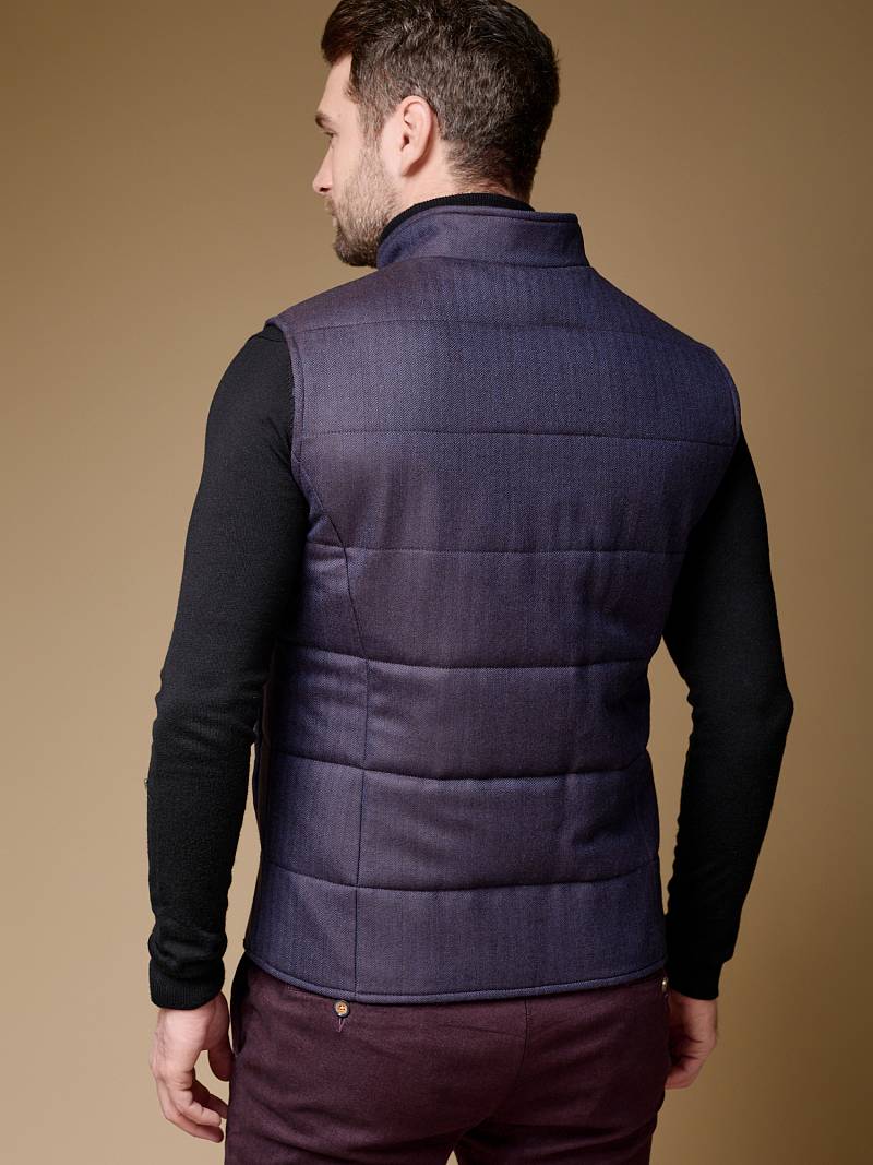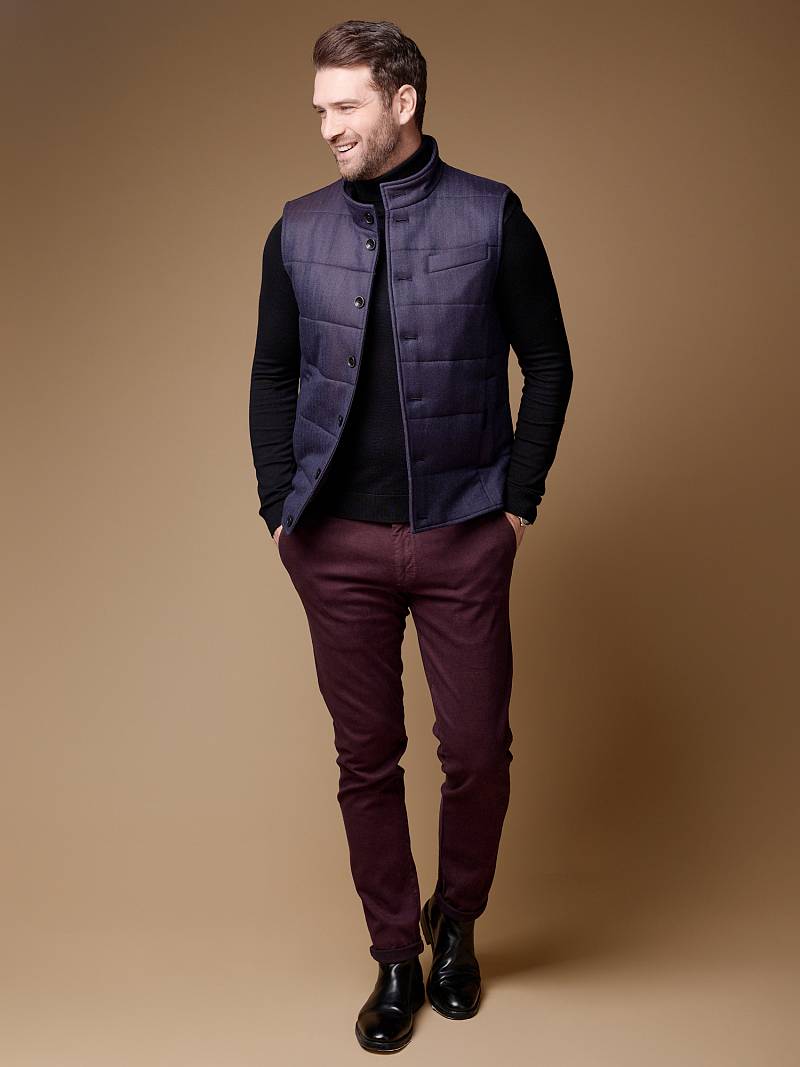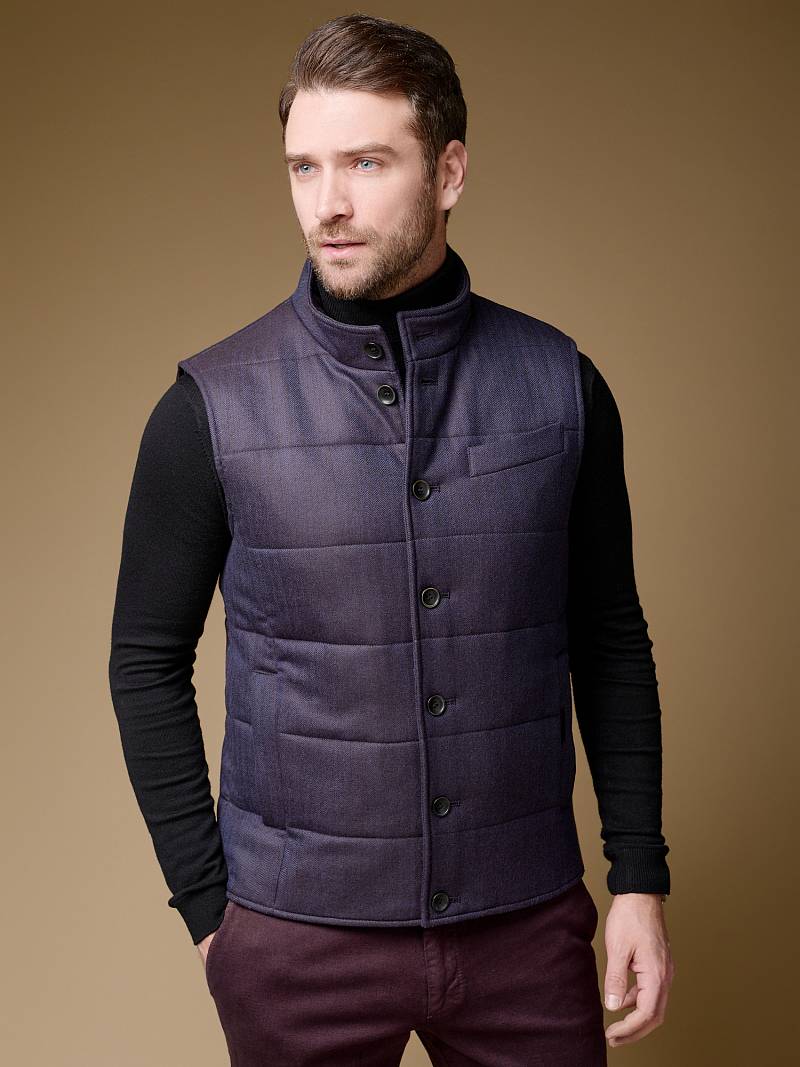 Жилет мужской утепленный, стеганный. Центральная застежка на пуговицы, воротник-стойка, в боковых швах расположены карманы с листочкой. Длина изделия по спинке для роста 176 - 69,5см. Ткань верха: 100% шерсть. Подкладка: 100% вискоза. Утеплитель: термоплюс 210гр