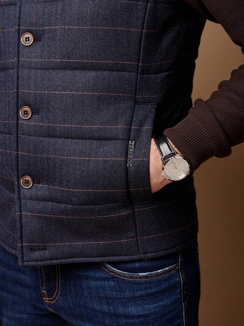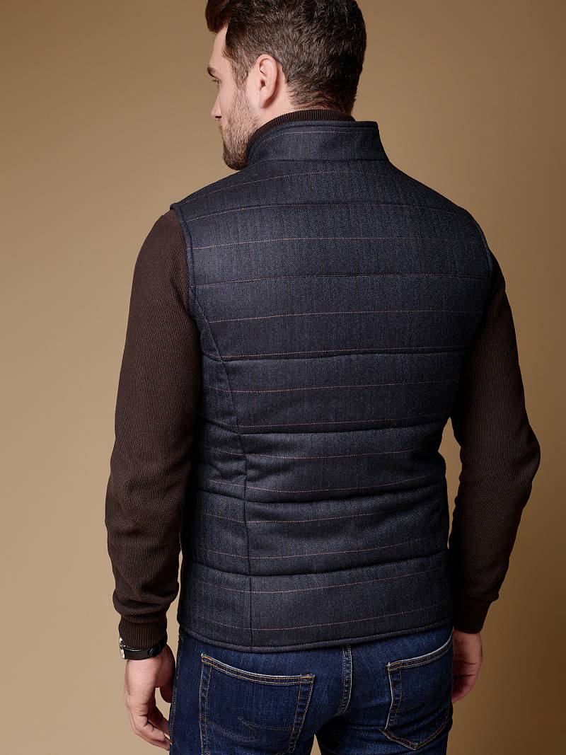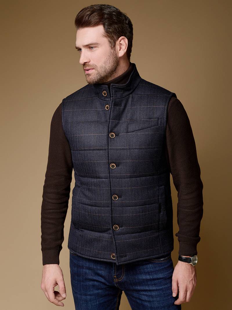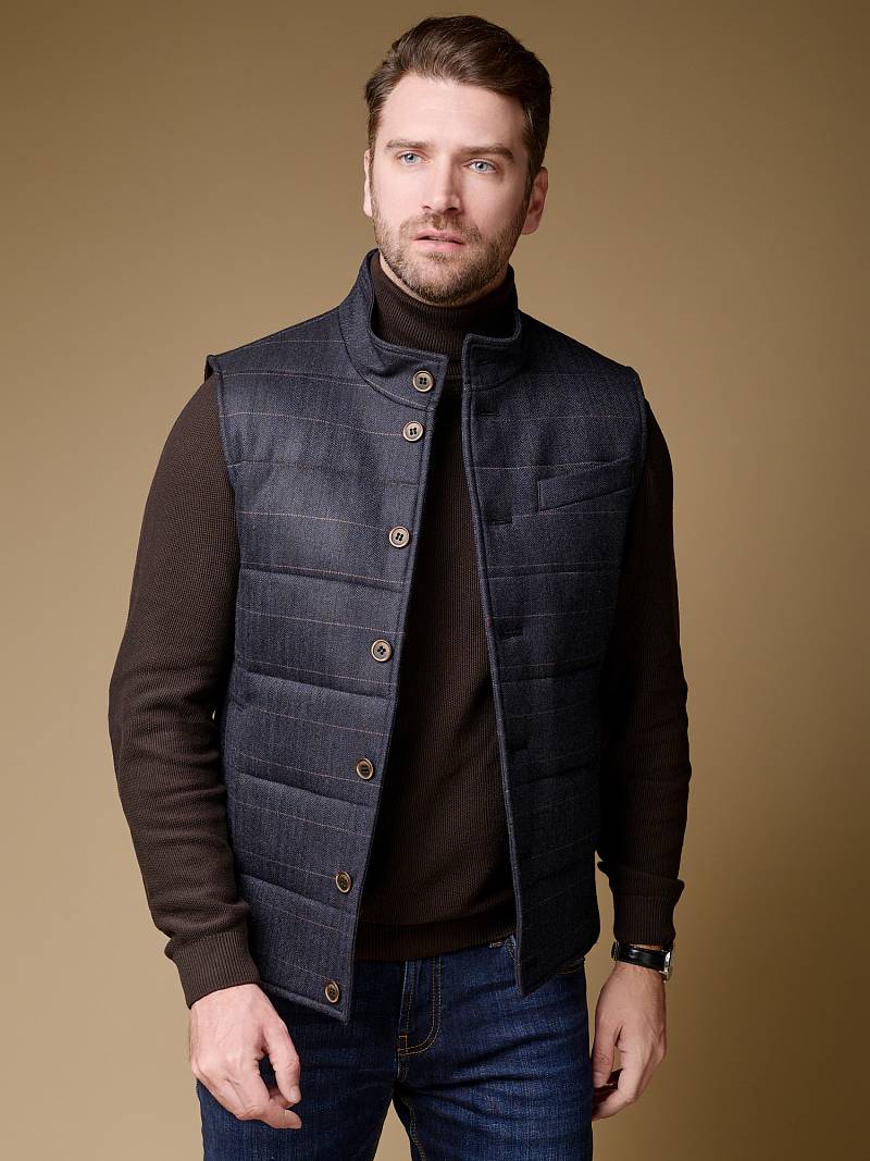 Жилет мужской утепленный, стеганный. Центральная застежка на пуговицы, воротник-стойка, в боковых швах расположены карманы с листочкой. Длина изделия по спинке для роста 176 - 69,5см. Ткань верха: 100% шерсть. Подкладка: 100% вискоза. Утеплитель: термоплюс 210гр