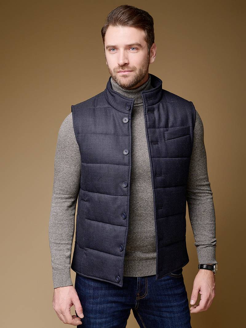 Жилет мужской утепленный, стеганный. Центральная застежка на пуговицы, воротник-стойка, в боковых швах расположены карманы с листочкой. Длина изделия по спинке для роста 176 - 69,5см. Ткань верха: 100% шерсть. Подкладка: 100% вискоза. Утеплитель: термоплюс 210гр