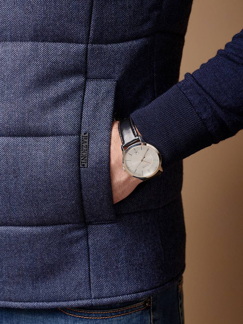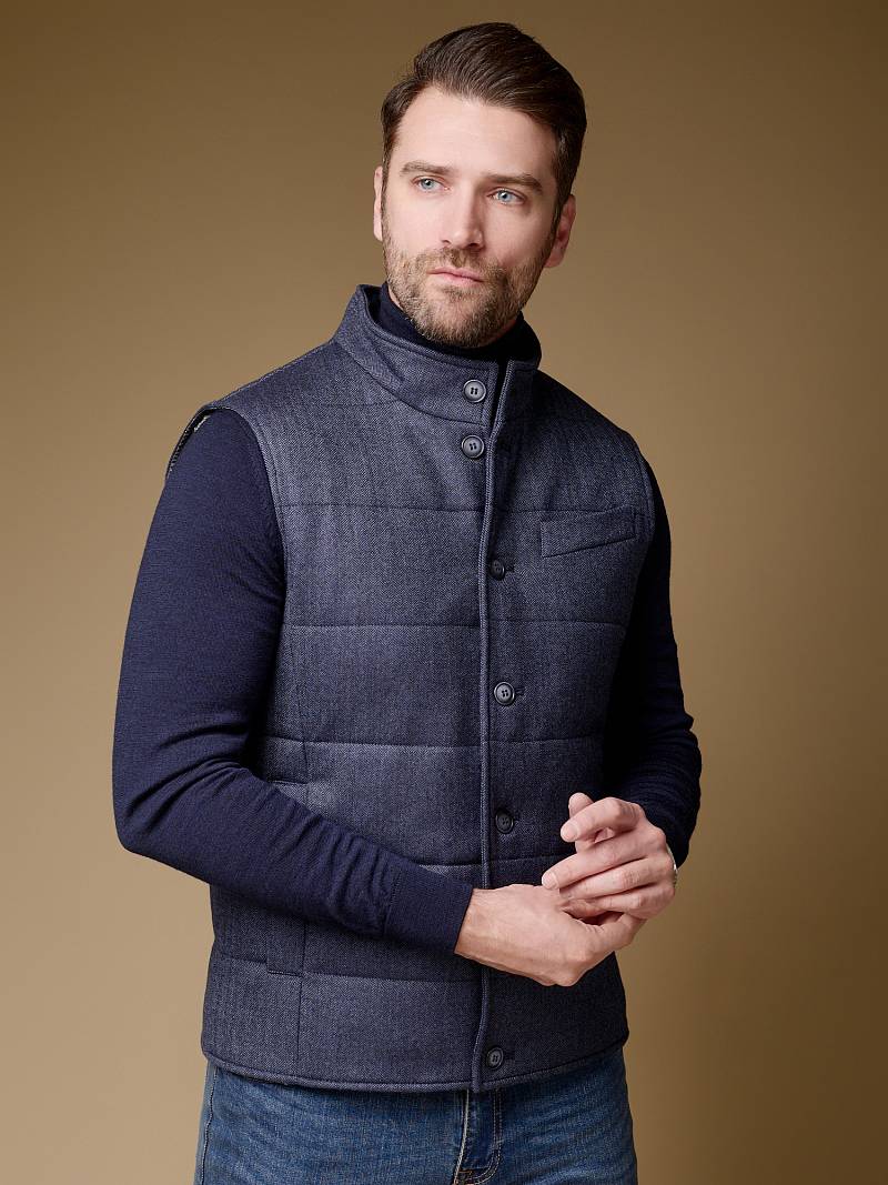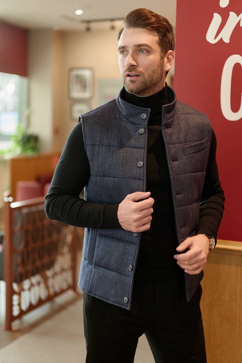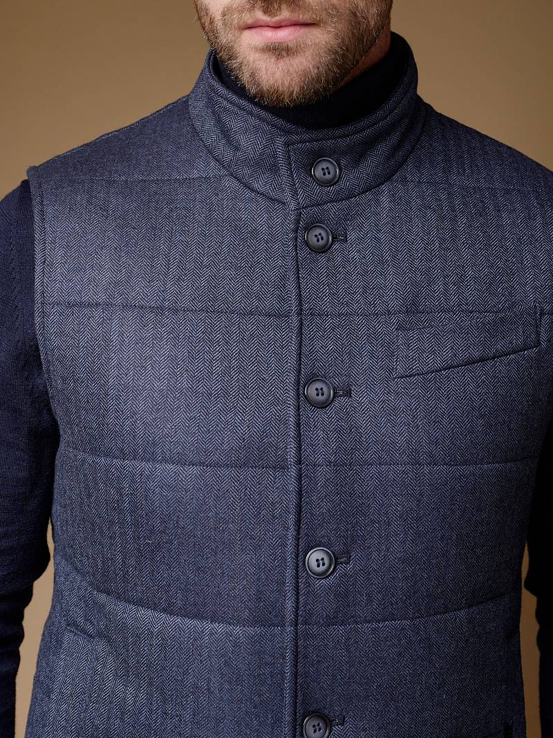 Жилет мужской утепленный, стеганный. Центральная застежка на пуговицы, воротник-стойка, в боковых швах расположены карманы с листочкой. Длина изделия по спинке для роста 176 - 69,5см. Ткань верха: 100% шерсть. Подкладка: 100% вискоза. Утеплитель: термоплюс 210гр