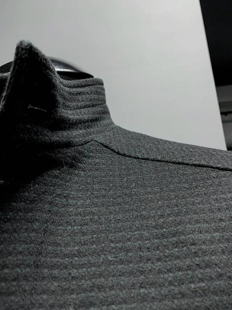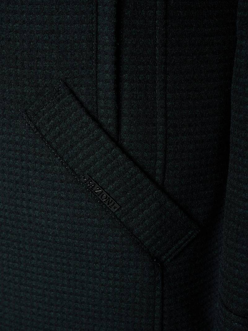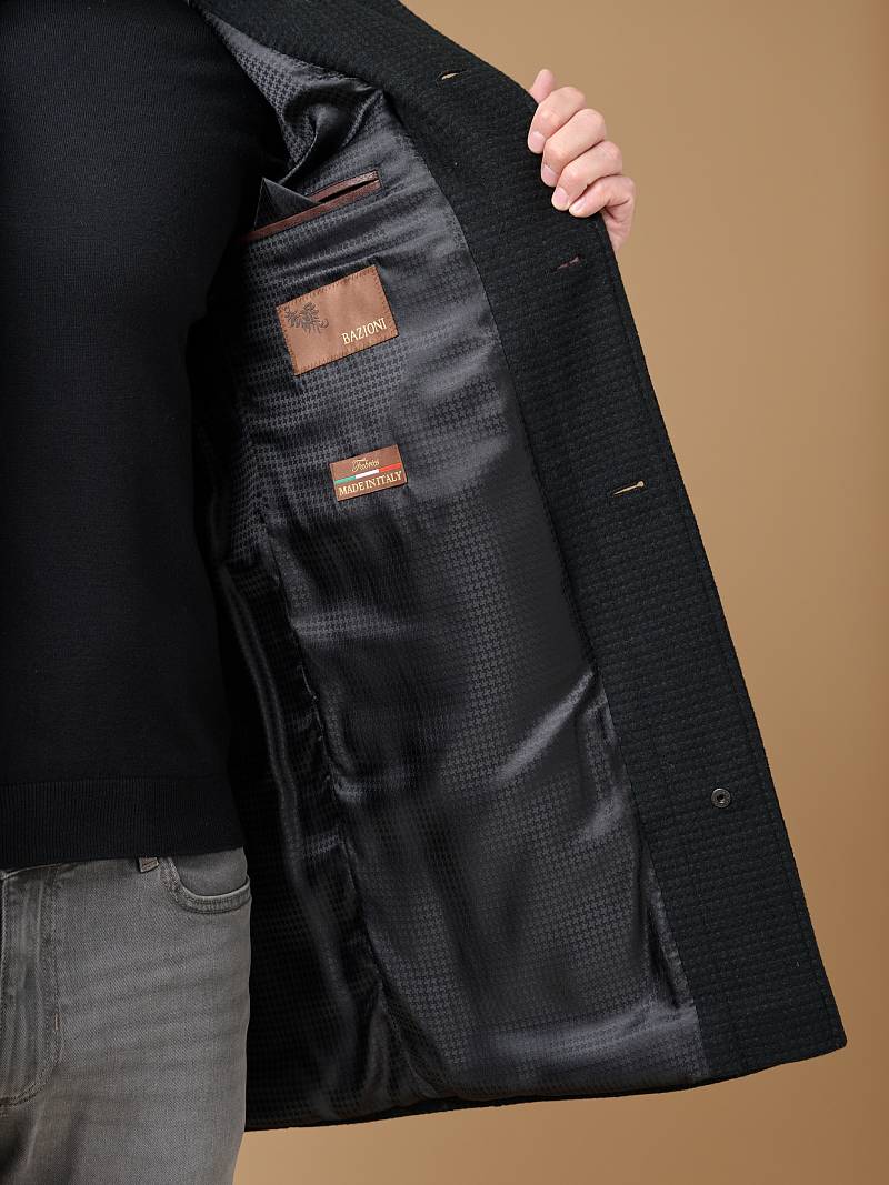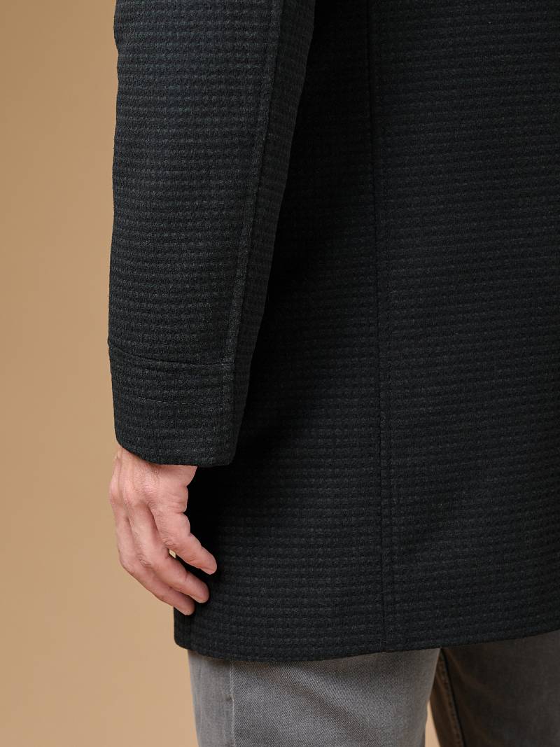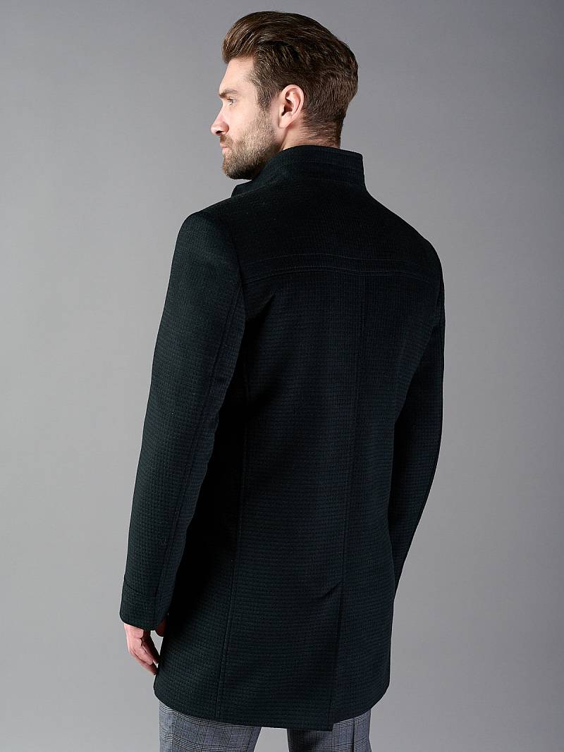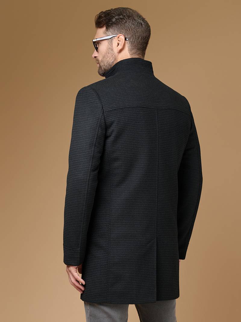 Пальто мужское утепленное с центральной застежкой на пуговицы, воротник-стойка, боковые карманы- прорезные застегивающиеся на молнию и прорезные с листочкой, спинка и полочка с отрезными кокетками, В нижней части среднего шва спинки одна шлица на потайной кнопке.