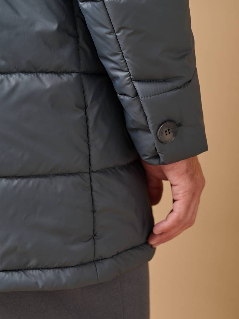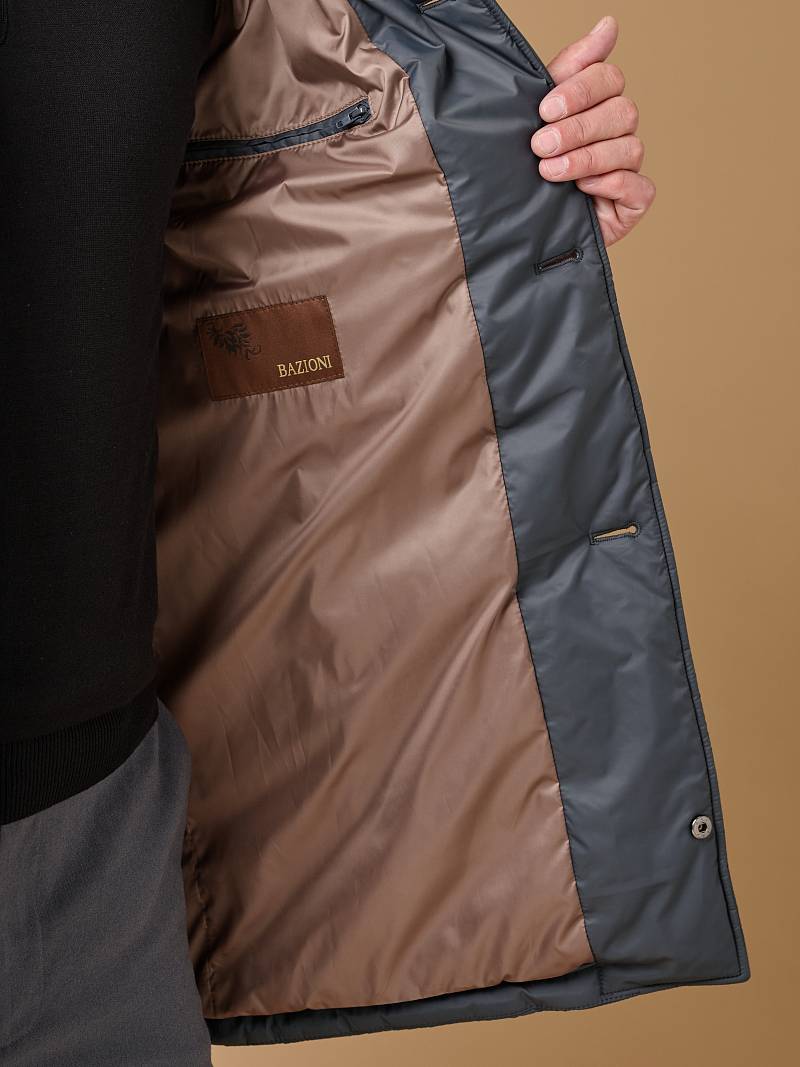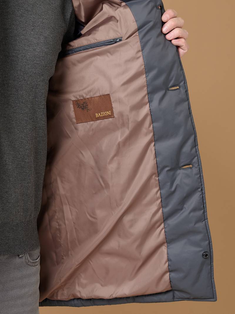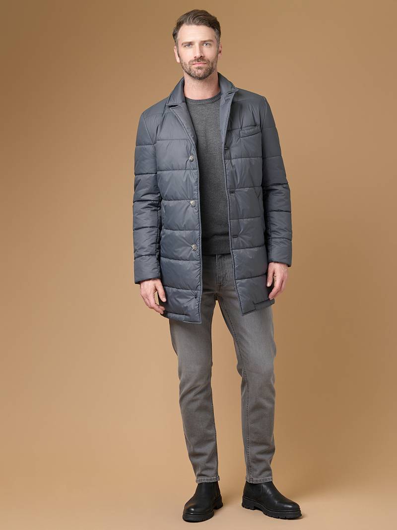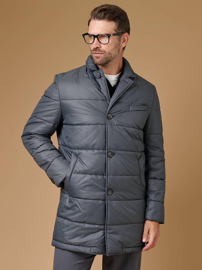 Мужская куртка - пальто утепленная с английским воротником - лацканами, из курточной пуходержащей ткани c водоотталкивающей пропиткой, которая защищает от ветра, холода и дождя. Ткань верха легкая, практичная, не мнется. Застежка изделия на пуговицы. Полочки и спинка простеганы, на полочках - два кармана с листочками на скрытых магнитах. Спинка со шлицей. Рукава втачные с локтевыми швами. На подкладке - два внутренних кармана на молнии для удобного хранения документов. Утеплитель в изделии характеризуется легким весом, гигиеничностью и гипоаллергенностью, высокими теплоизоляционными качествами, экологичностью и безопасностью. Эластичный материал позволяет комфортно двигаться. Он отталкивает воду и не промокает, сохраняет тепло. Изделие подходит для ежедневного пользования. Длина по спинке - 90см. Ткань верха: 100%полиэстер. Подкладка: 100%полиэстер. Утеплитель: термоплюс 150гр/150гр.