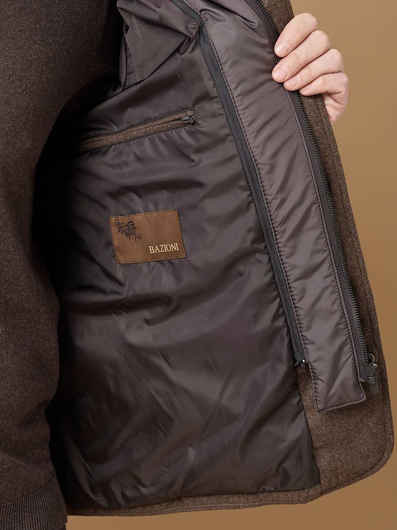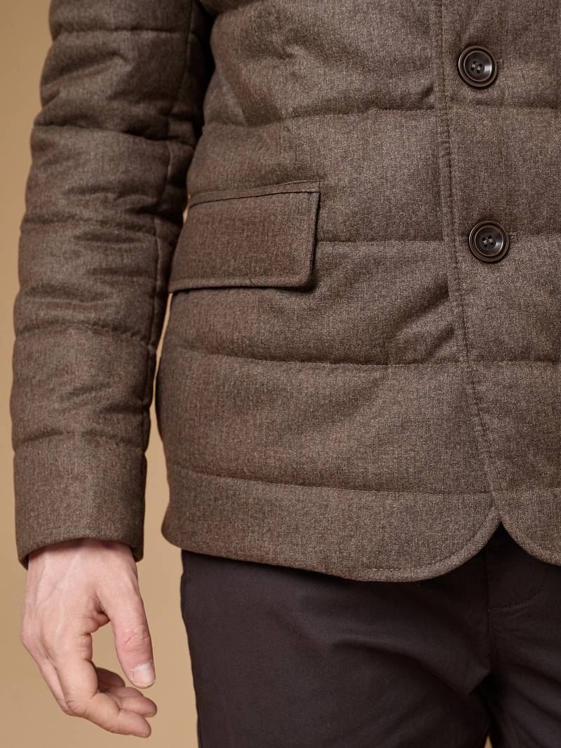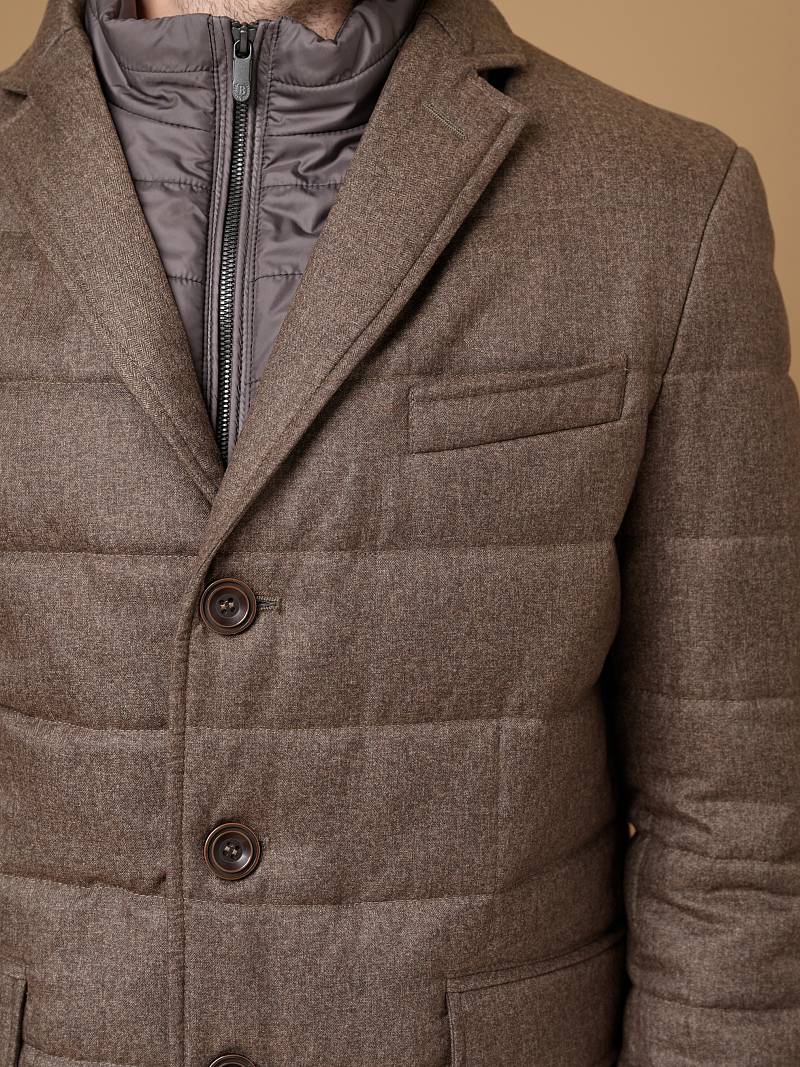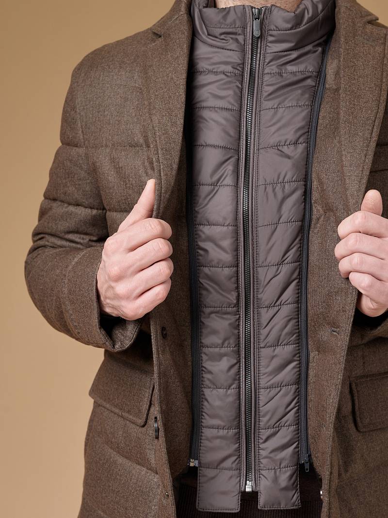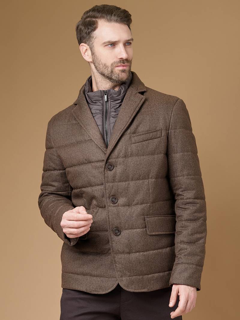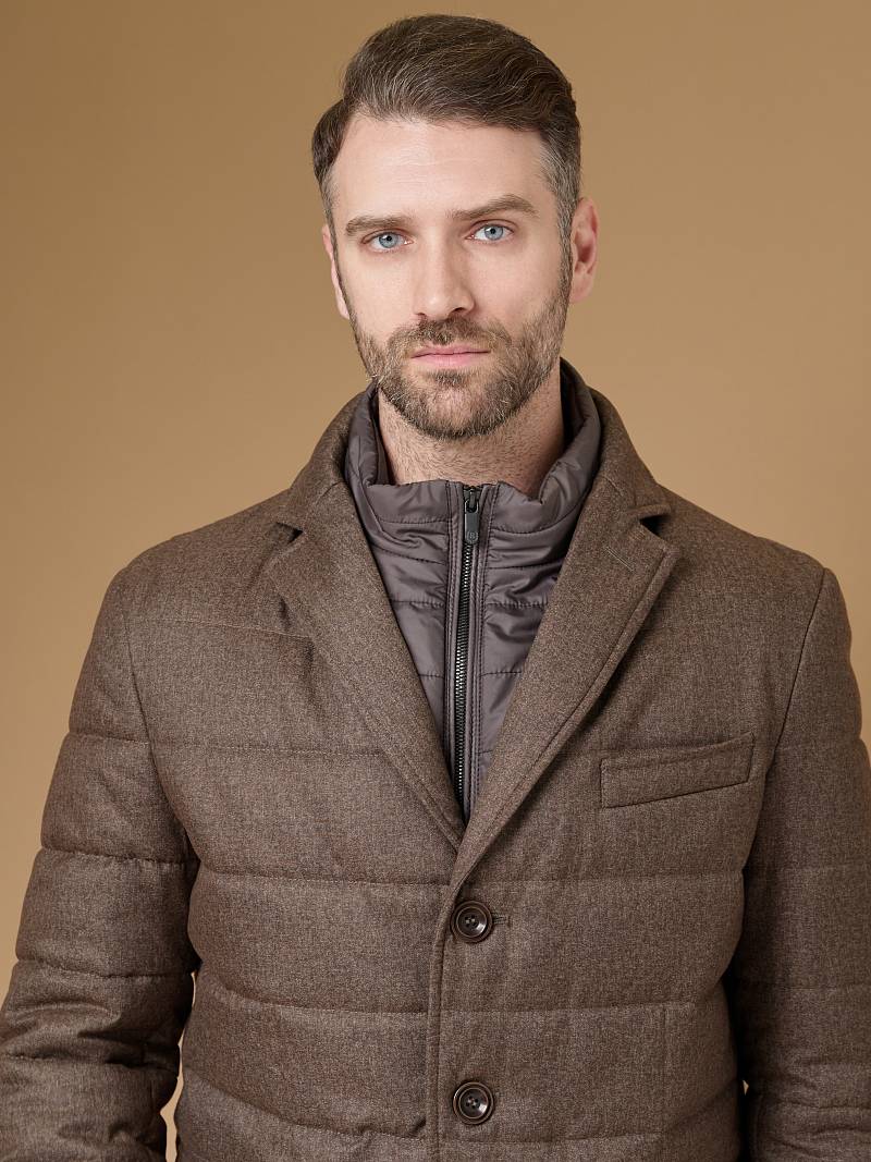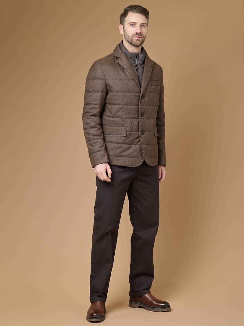 Куртка мужская утепленная из полушерстяной ткани с английским воротником и со съемной манишкой. Манишка из пуходержащей ткани с водоотталкивающей пропиткой, защищает от ветра, холода и дождя. Застежка изделия на пуговицы. Полочки и спинка простеганы, на полочках - множество карманов: два кармана с клапанами на скрытых магнитах и два кармана -листочки с вертикальным боковым входом. Рукава втачные с локтевыми швами. На подкладке - два внутренних кармана на молнии для удобного хранения документов. Утеплитель в изделии характеризуется легким весом, гигиеничностью и гипоаллергенностью, высокими теплоизоляционными качествами, экологичностью и безопасностью. Рекомендуется обработать изделие водонепроницаемым аэрозолем для защиты от неблагоприятных погодных условий. Длина по спинке - 74см. Ткань верха: 60%шерсть, 40%полиэстер. Подкладка: 100% вискоза. Утеплитель: термоплюс 150гр/150гр