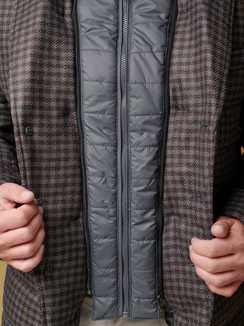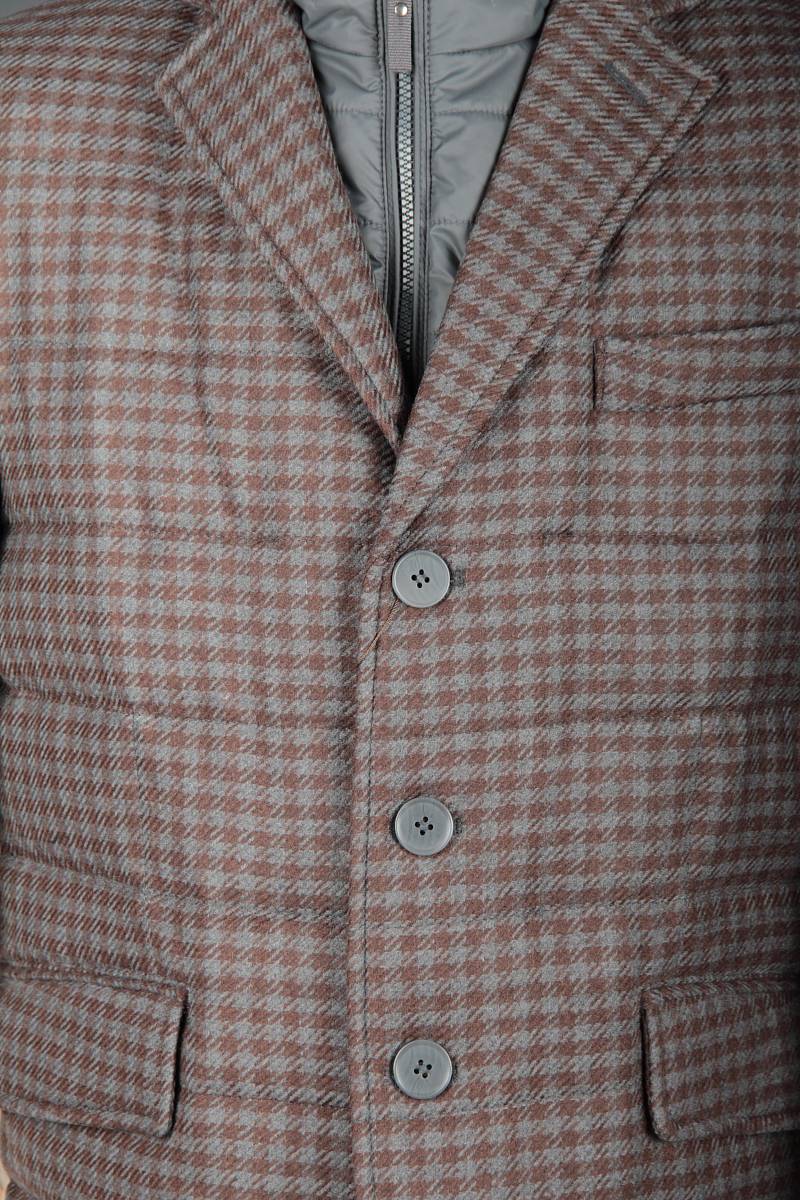Куртка мужская утепленная из шерстяной ткани с английским воротником и со съемной манишкой. Манишка из пуходержащей ткани с водоотталкивающей пропиткой, защищает от ветра, холода и дождя. Застежка изделия на пуговицы. Полочки и спинка простеганы, на полочках - два кармана с клапанами на скрытых магнитах. Рукава втачные с локтевыми швами. На подкладке - два внутренних кармана на молнии для удобного хранения документов. Утеплитель в изделии характеризуется легким весом, гигиеничностью и гипоаллергенностью, высокими теплоизоляционными качествами, экологичностью и безопасностью. Рекомендуется обработать изделие водонепроницаемым аэрозолем для защиты от неблагоприятных погодных условий. Длина по спинке - 74см. Ткань верха: 100% шерсть. Подкладка: 100% полиэстер. Утеплитель: термоплюс 150гр./150гр.