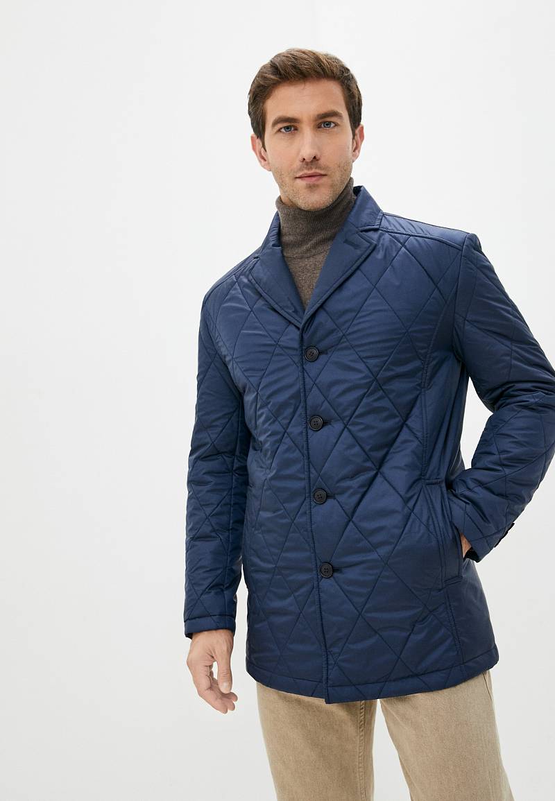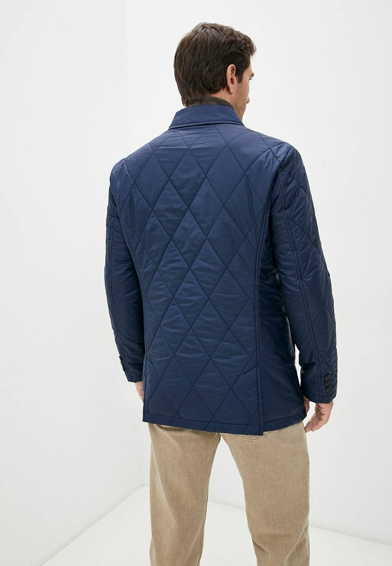 Куртка мужская утепленная c английским воротником с центральной застежкой на 4 пуговицы и одну потайную кнопку. Воротник - с лацканами из плащевой основной ткани, на лацкане - декоративная петля. Полочки, спинка и рукава простеганы одинарной стежкой "ромб". Полочки с кокетками, боковые карманы с листочками располагаются в рельефных швах. По спинке две шлицы, которые также расположены в рельефных швах. Рукава втачные состоят из двух частей, На полочках подкладки- 2 внутренних прорезных кармана с фигурным клапаном. Длина изделия по спинке для роста 176 - 80см. Ткань верха: 100%полиэстер. Подкладка: 100%полиэстер. Утеплитель: термоплюс 160 гр./140гр.