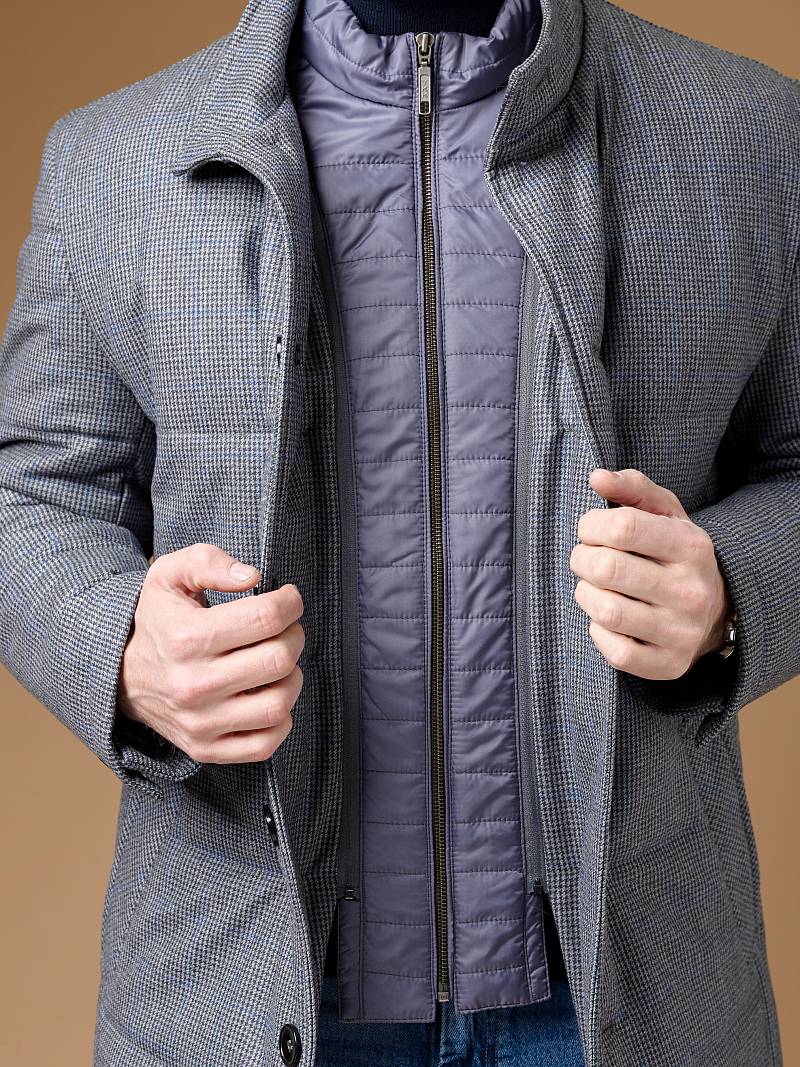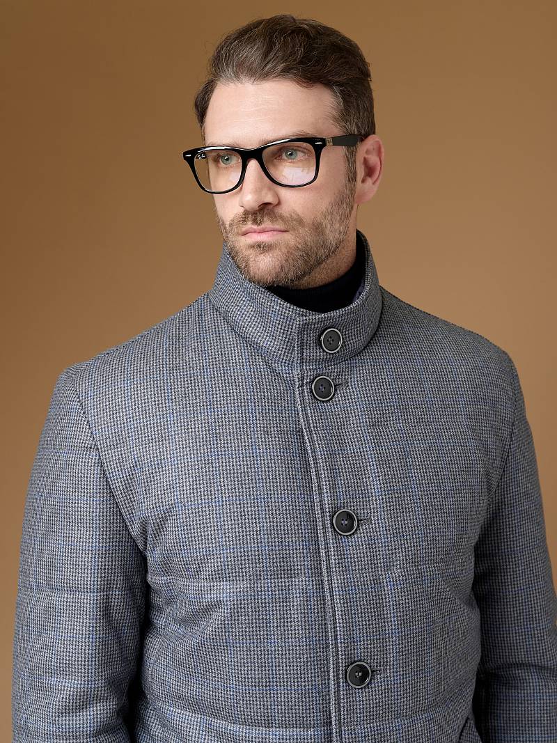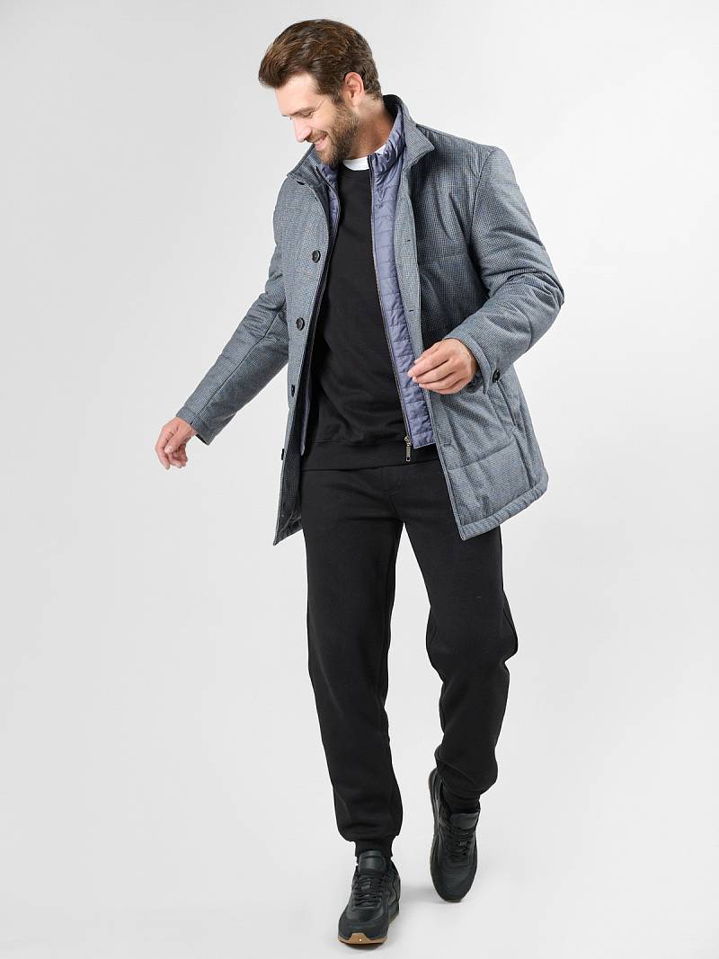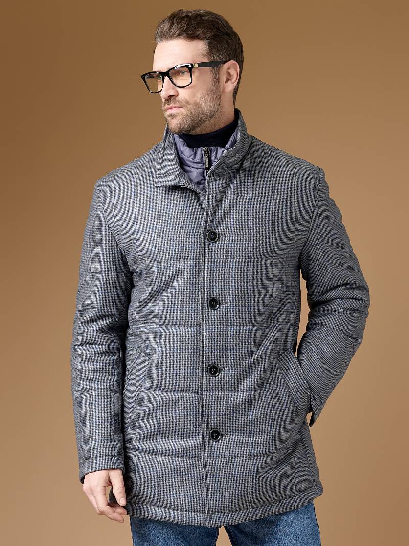 Куртка мужская утепленная с отстегивающийся манишкой на молнию. Застежка куртки на 6 пуговиц. Воротник - стойка. Полочки, спинка, рукава- простеганы горизонтальной стежкой. На полочках - два нижних боковых кармана с листочками. В нижней части среднего шва спинки- шлица на 2-х кнопках. Рукава втачные с локтевыми швами. На подкладке - два внутренних прорезных кармана на молниях. Длина по спинке для размера-роста 50/176 - 82см. Ткань верха: 60% шерсть, 40% кашемир. Подкладка: 100% полиэстер. Утеплитель: термоплюс 200гр./160гр.