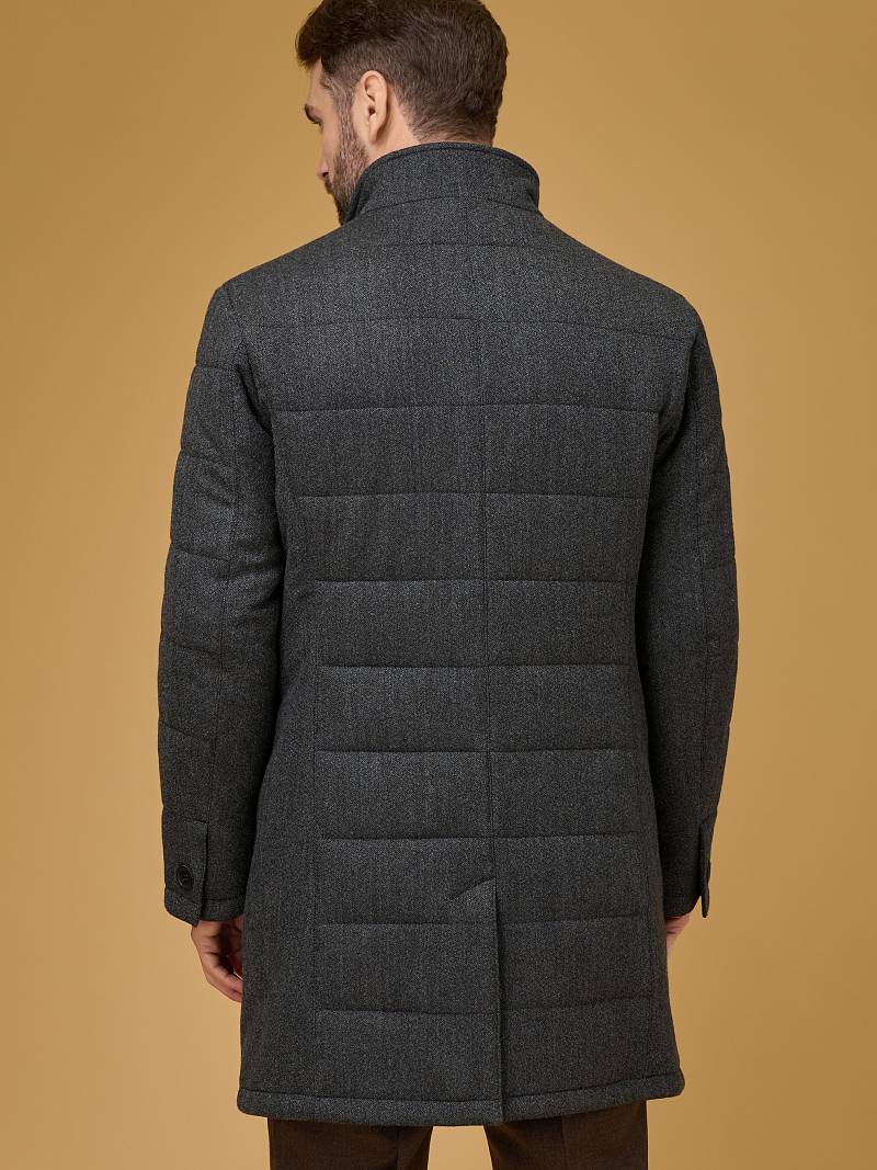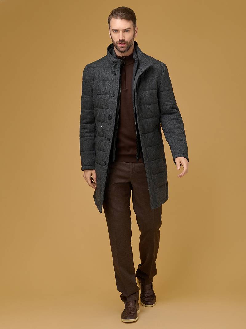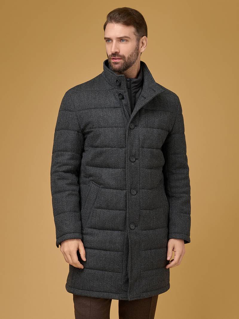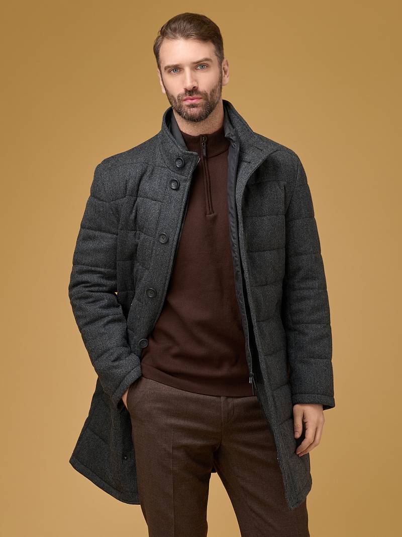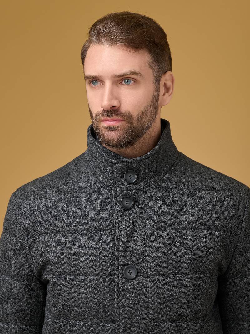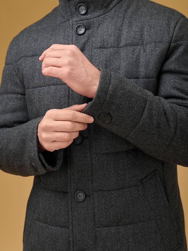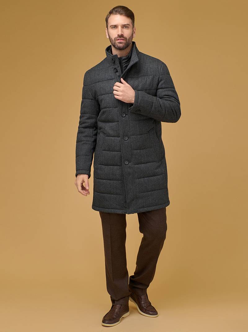 Куртка мужская утепленная с отстегивающийся манишкой на молнию. Застежка куртки на 6 пуговиц. Воротник - стойка. Полочки, спинка, рукава- простеганы горизонтальной стежкой. На полочках - два нижних боковых кармана с листочками. В нижней части среднего шва спинки- шлица на 2-х кнопках. Рукава втачные с локтевыми швами. На подкладке - два внутренних прорезных кармана на молниях. Длина по спинке для размера-роста 50/176 - 95см. Ткань верха: 100% шерсть. Подкладка: 100% полиэстер. Утеплитель: термоплюс 200гр./160гр.