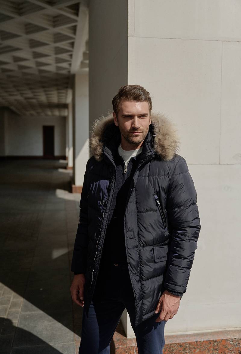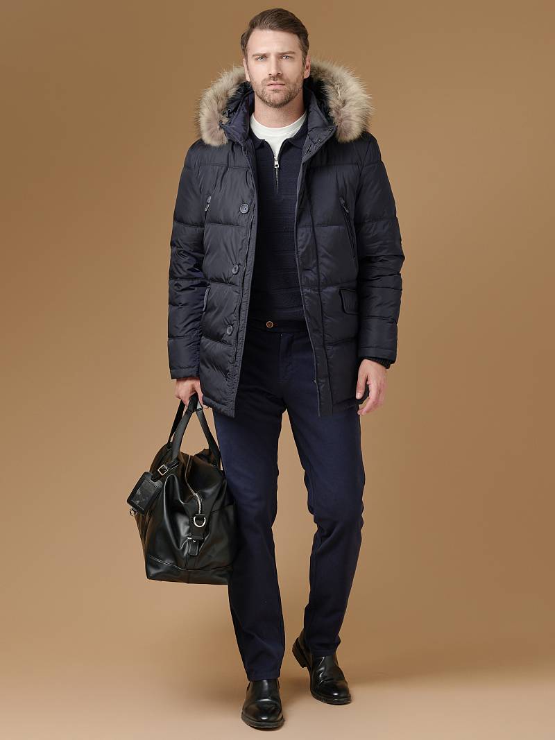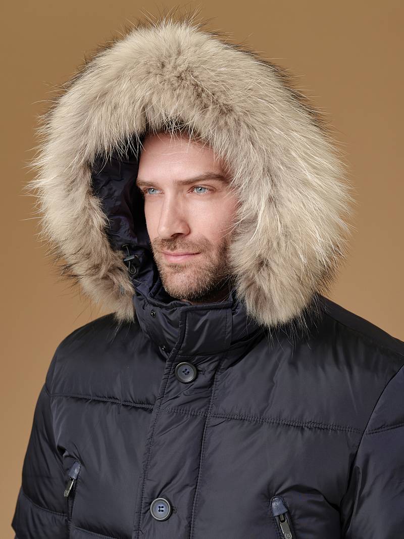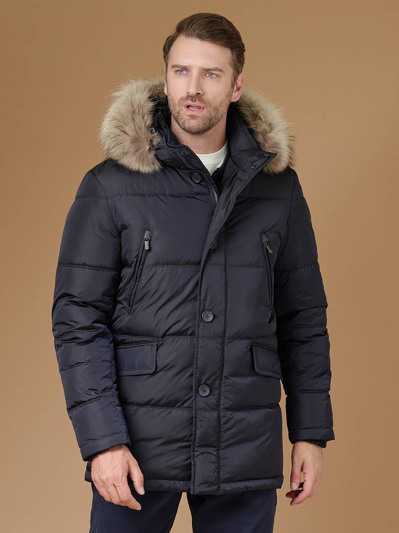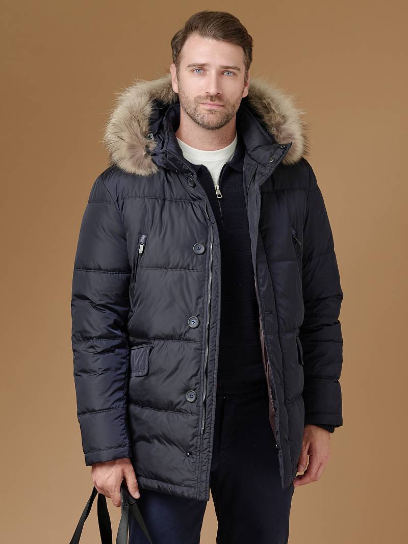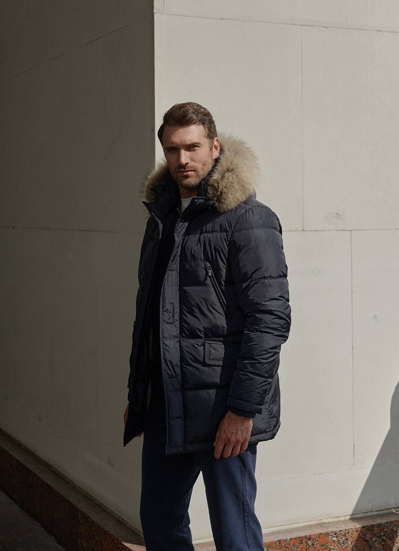 Куртка мужская утепленная (пуховик) с капюшоном из плащевой ткани с центральной застежкой на молнию и ветрозащитную планку на 4 пуговицы. Капюшон отстегивающийся c опушкой из натурального меха, воротник - стойка. Простеганные двойной отделочной строчкой - полочки и спинка- с кокеткой. На полочках - четыре кармана: два нижних боковых прорезных кармана с клапаном и два верхних прорезных кармана на молниях. Рукава втачные с локтевыми швами, по низу рукава - трикотажный манжет. На подкладке - два внутренних прорезных кармана в рамку. Длина по спинке-83см. Ткань верха: 100%нейлон. Подкладка: 100% полиэстер. Утеплитель: био- пух 220гр/200гр. Опушка: мех натуральный.