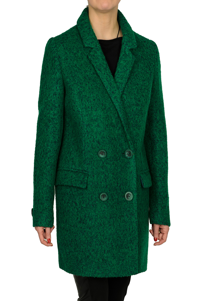 Пальто женское. Застежка двубортная на пуговицы, боковые карманы с клапаном, воротник-классический.