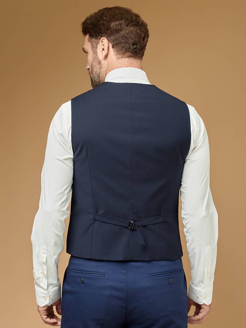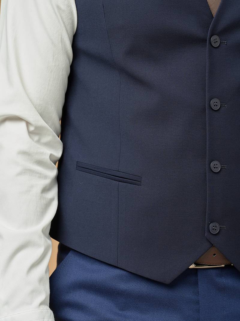 Classic fit (ПОЛУПРИЛЕГАЮЩИЙ СИЛУЭТ). Мужской классический жилет темно-синего цвета выполнен из тонкой полушерстяной ткани. На полочках расположены два боковых кармана, по спинке расположен хлястик для регулировки объема в области талии. Дизайнеры марки тщательно подходят к выбору материалов. Пуговицы подбираются и красятся индивидуально под каждую ткань, а прикладные материалы используют только от передовых производителей.