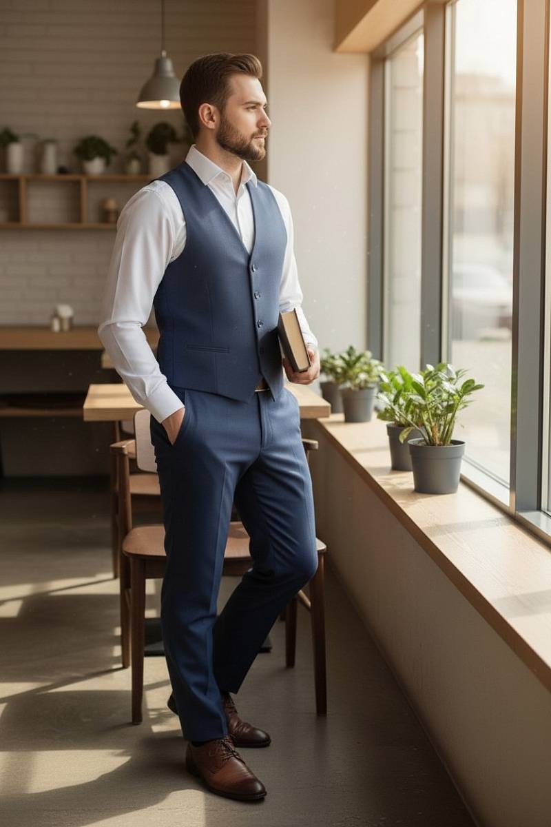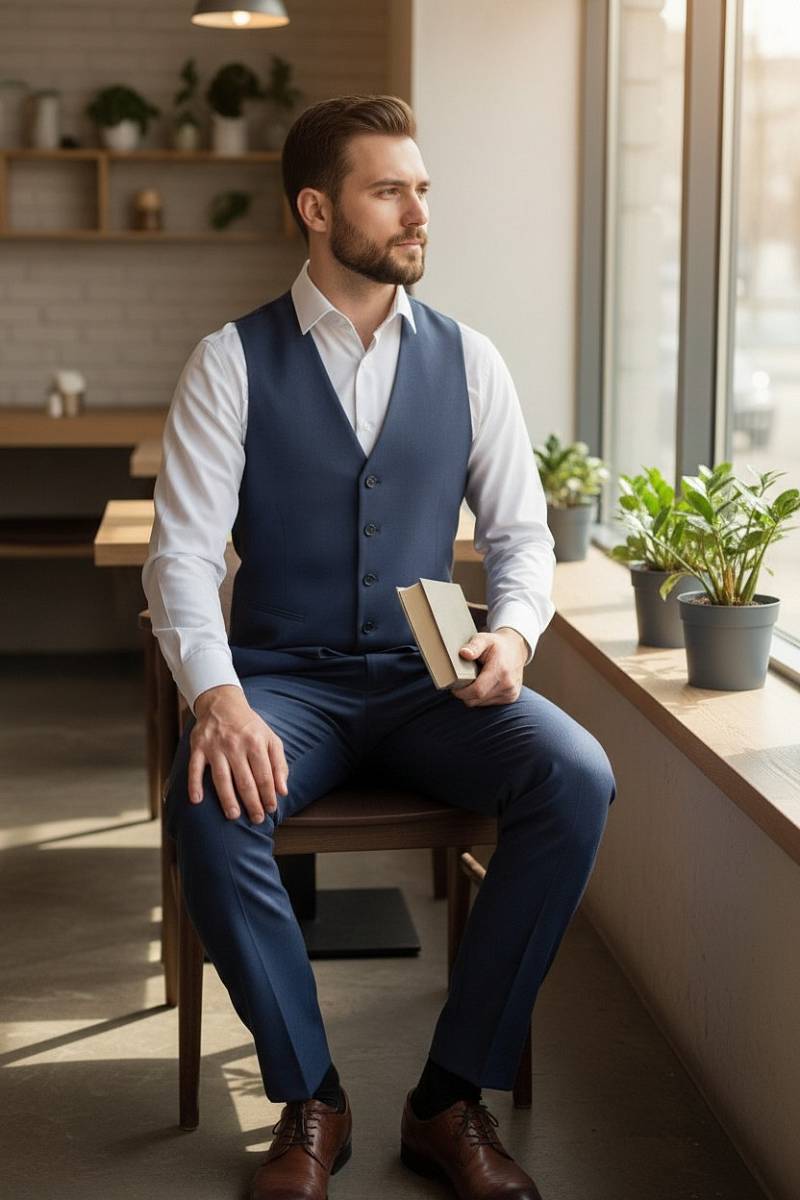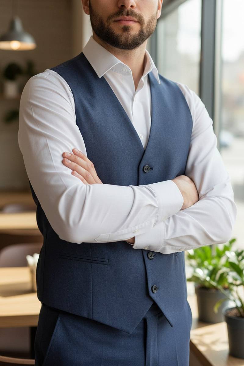 Classic fit (ПОЛУПРИЛЕГАЮЩИЙ СИЛУЭТ). Жилет мужской классический, с двумя боковыми карманами, по спинке расположен хлястик для регулировки объема в области талии.