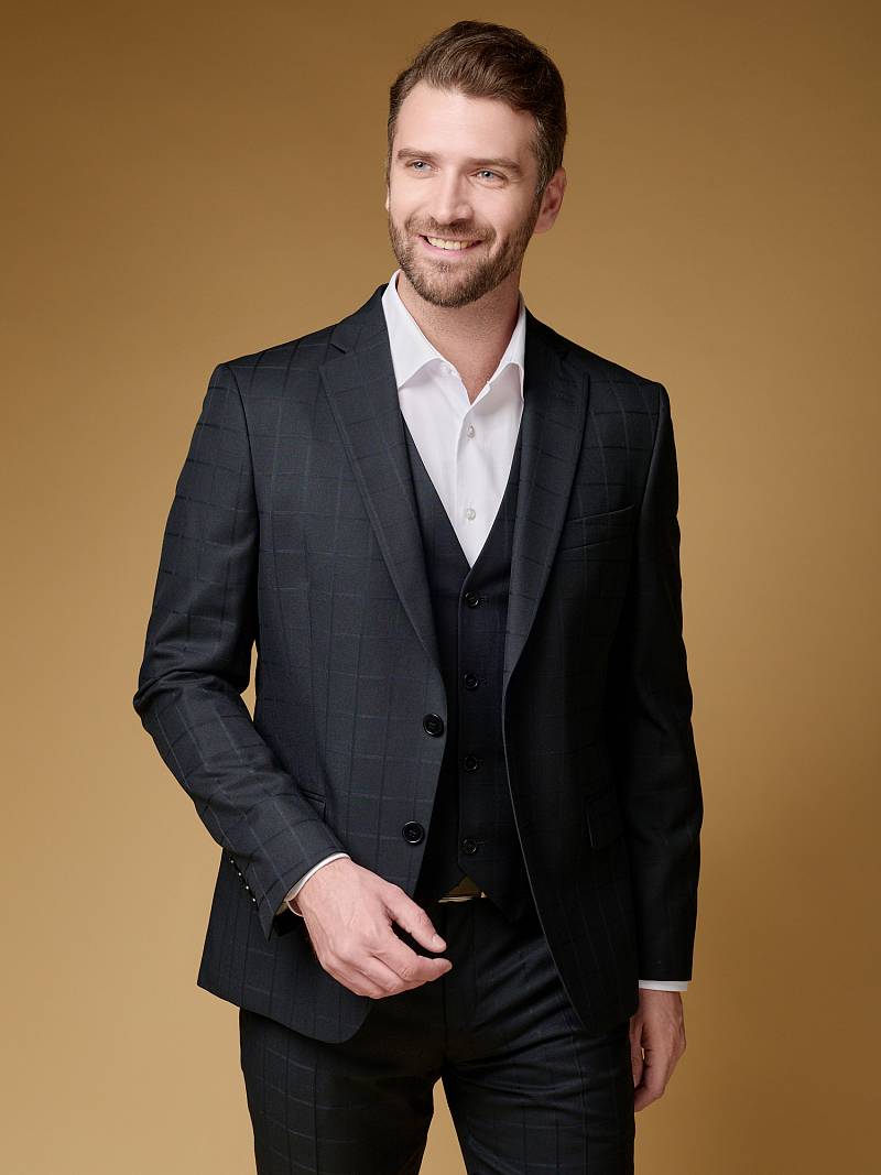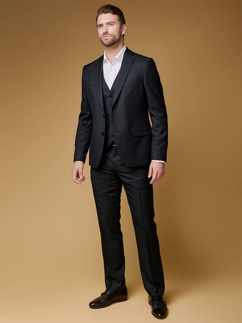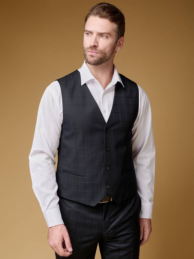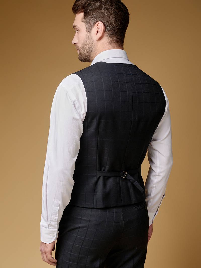 Slim fit (ПРИЛЕГАЮЩИЙ СИЛУЭТ), рекомендуется брать на размер больше. Жилет мужской классический, на полочках расположены два боковых кармана, по спинке расположен хлястик для регулировки объема в области талии.
