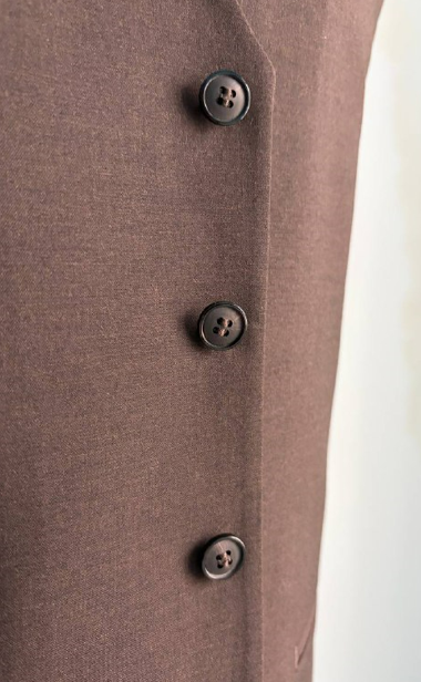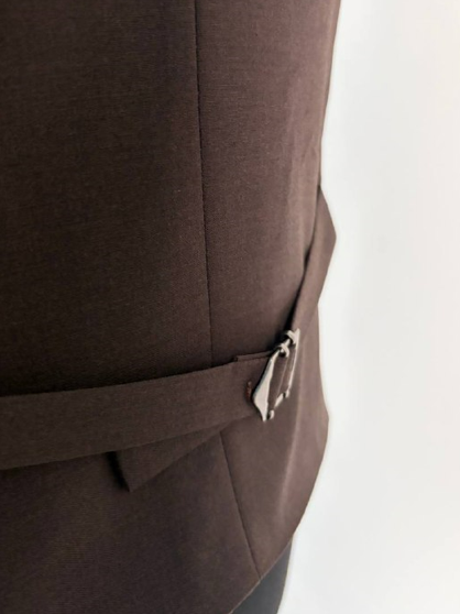 Classic fit (ПОЛУПРИЛЕГАЮЩИЙ СИЛУЭТ). Мужской классический жилет темно-коричневого цвета выполнен из полушерстяной ткани. На полочках расположены два боковых кармана, по спинке расположен хлястик для регулировки объема в области талии. Дизайнеры марки тщательно подходят к выбору материалов. Пуговицы подбираются и красятся индивидуально под каждую ткань, а прикладные материалы используют только от передовых производителей.